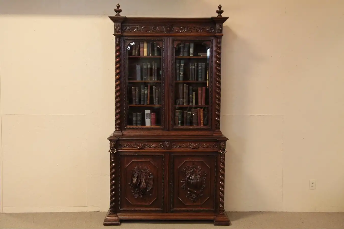 The high-relief Renaissance style artistry in this china or curio cabinet or bookcase cabinet includes magnificent hand-carving in remarkably high relief with game birds and fish. Solid oak furniture from about 1880, the carved borders and spiral columns are especially wonderful.