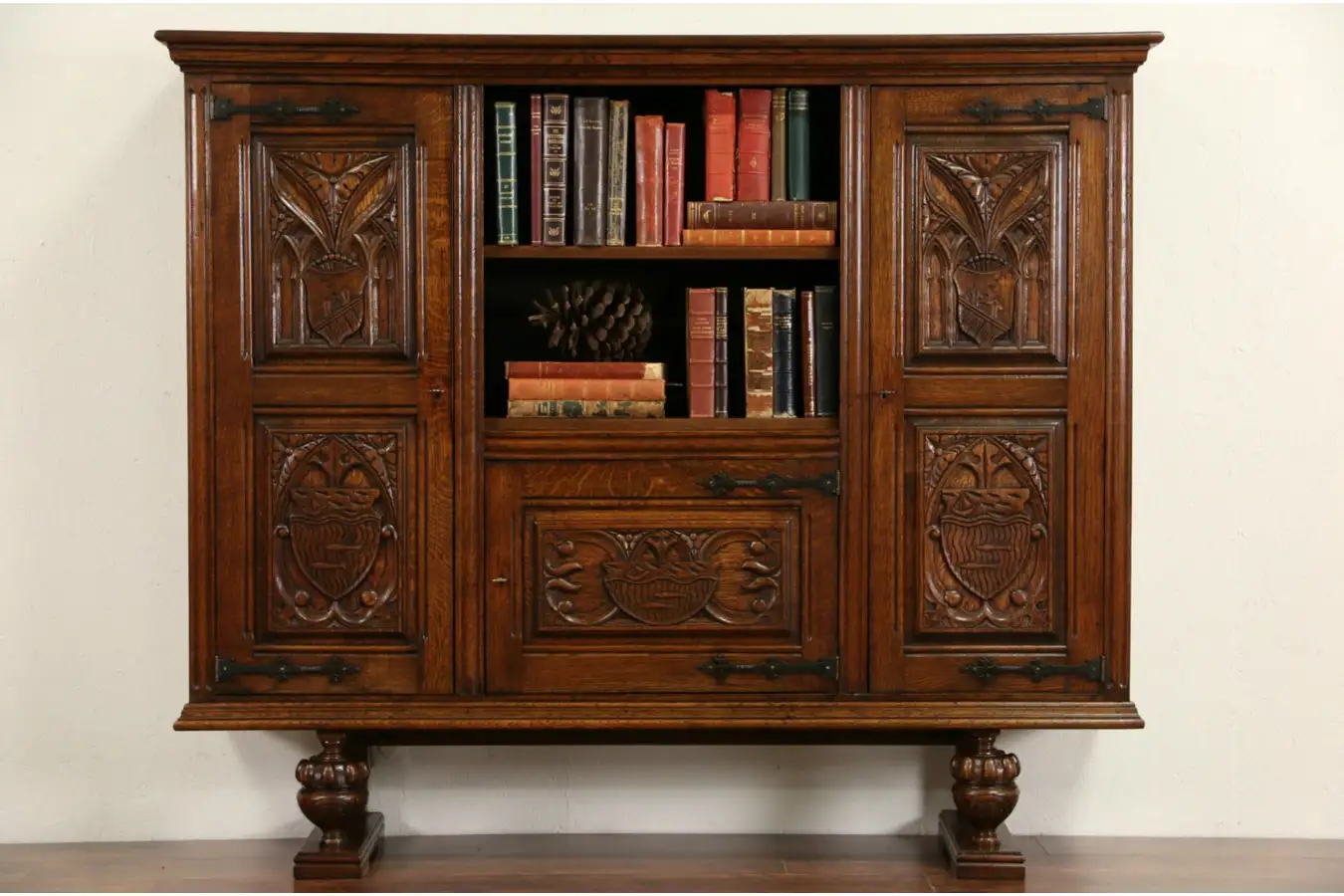 The family coat of arms crest could be yours on this oak library bookcase and bar cabinet from about 1925.