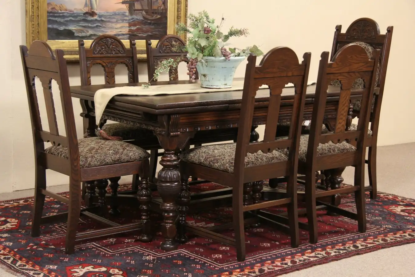 Carved in the English Tudor manner in the 1920's, this dining set, a table and 6 chairs, is actually American made.
