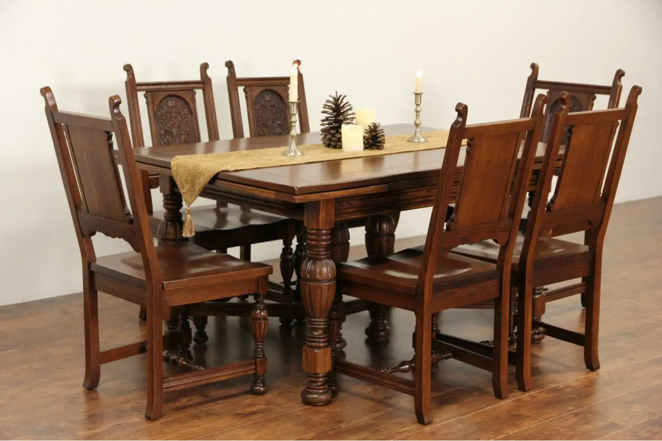 Carved about 1925 in the English Tudor manner, this oak dining set includes a table with two draw leaves and six chairs, made by "Northern Furniture, Sheboygan, Wis."