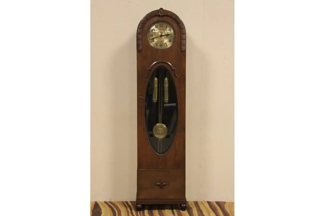 Expertly crafted in Germany about 1910, an arched oak tall case or grandfather clock is in excellent working condition.
