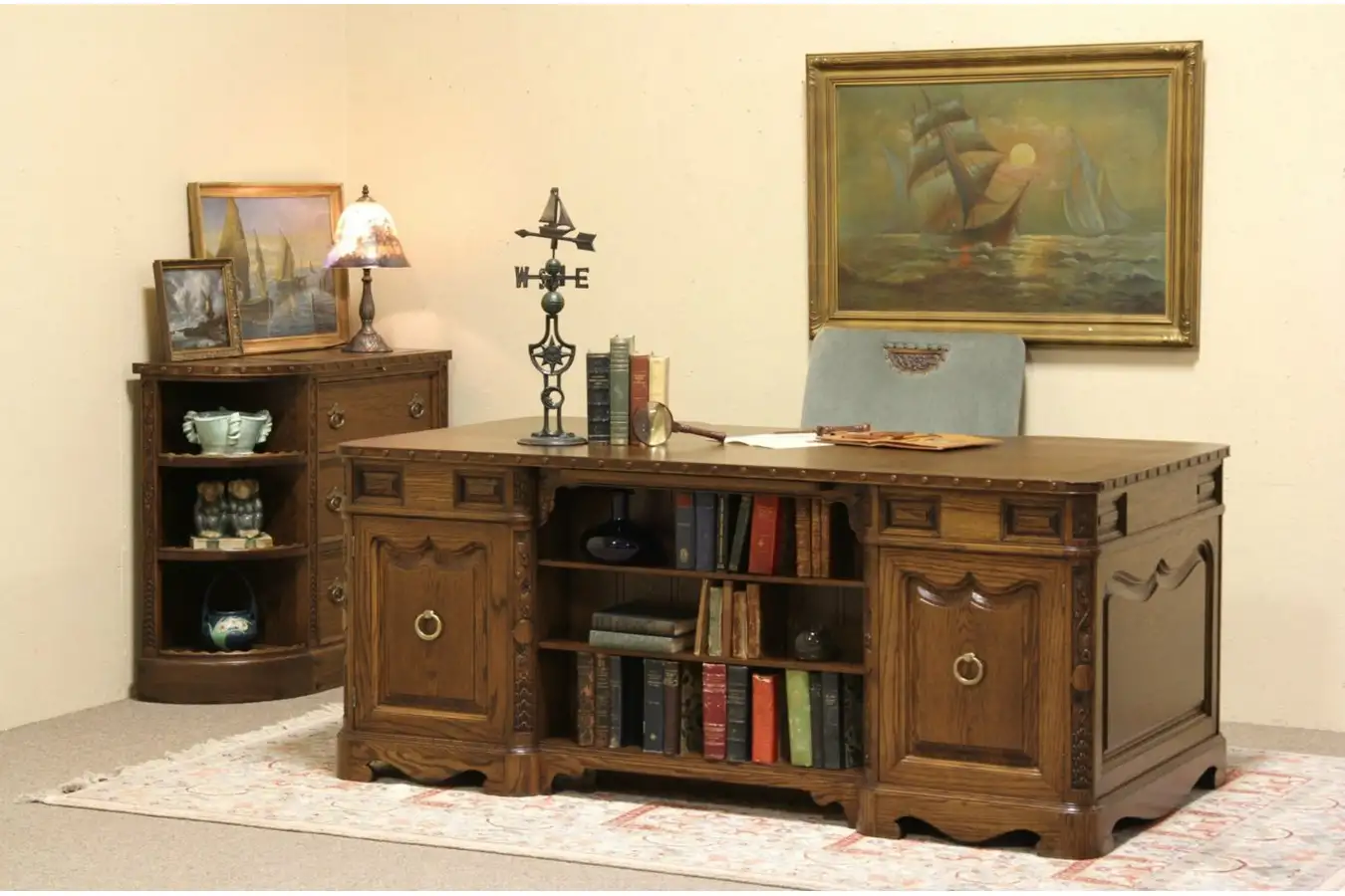 Carved of solid oak about 40 years ago, a spectacular vintage executive desk set has raised panels and carved grapevine motifs. The lustrous satiny finish is excellent. Brass hardware is original, drawers are finished inside and have dovetailed joints.