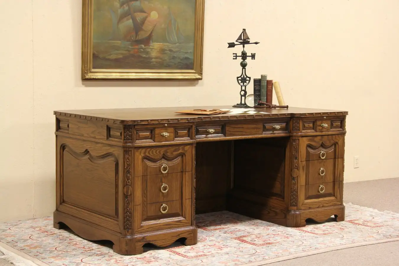Carved of solid oak about 40 years ago, a spectacular vintage executive desk has raised panels and carved grapevine motifs. The lustrous satiny finish is excellent. Brass hardware is original, drawers are finished inside and have dovetailed joints.