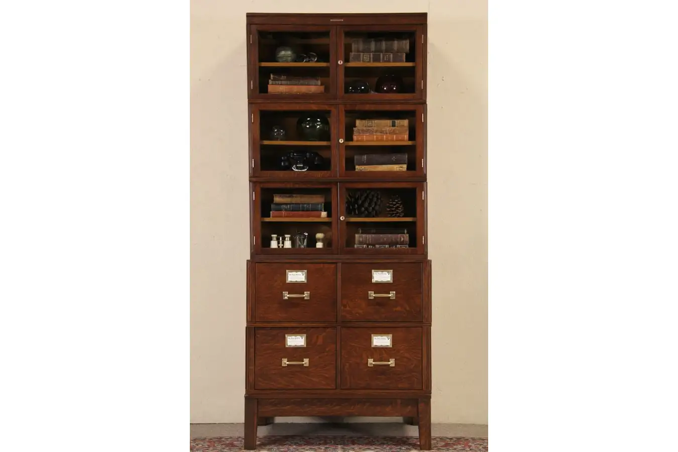 Crafted of solid quarter sawn oak around 1910, this stacking four drawer file cabinet has bookcase sections above and is signed on a brass plate, "Library Bureau Makers." Such top quality pieces were bought by the Carnegie Foundation to give to public libraries around the country.