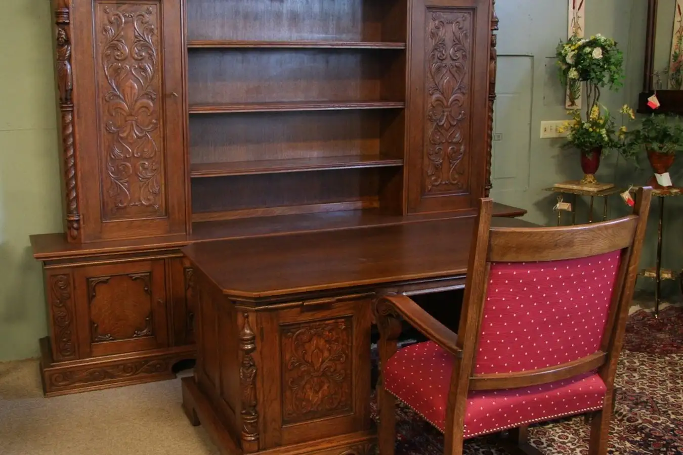 Spectacular workmanship is evident in this three piece office or library set with a desk, chair and bookcase. Each piece has carved knights on the corners, and lavish carving in oak. Everything matches, and the oak cabinetry has a warm medium brown finish that is in excellent condition. Doors and drawers all fit well, and this set is well proportioned with deeply carved moldings.