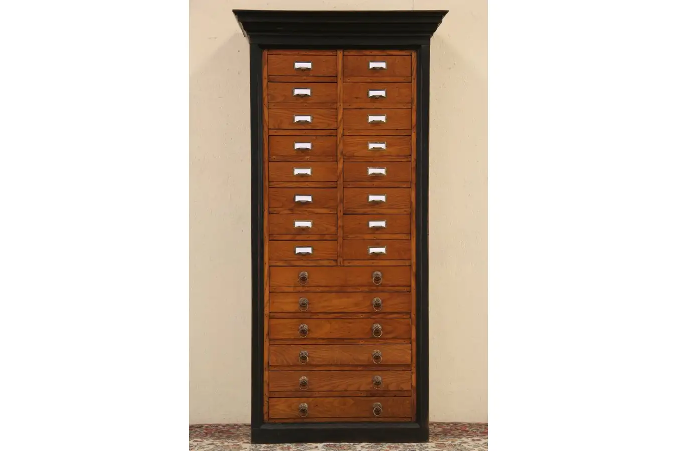 Six large lower drawers have original ring pulls. Sixteen upper drawers have tin sides and there are shadows and holes from original pulls that were replaced with label holders, they would be mostly covered by labels. Barely visible are stenciled labels on the drawers, "North British," etc.