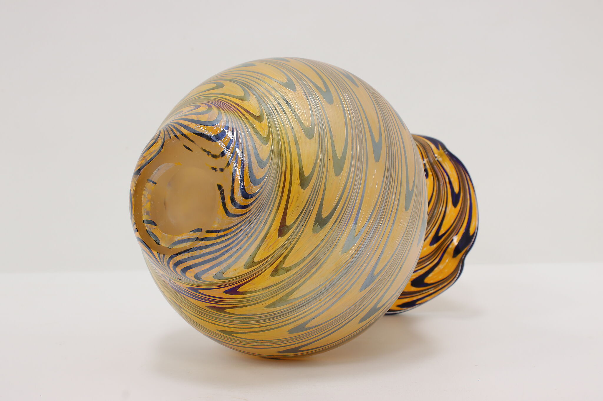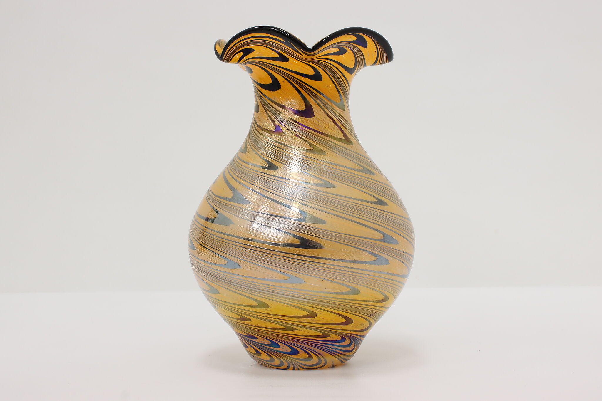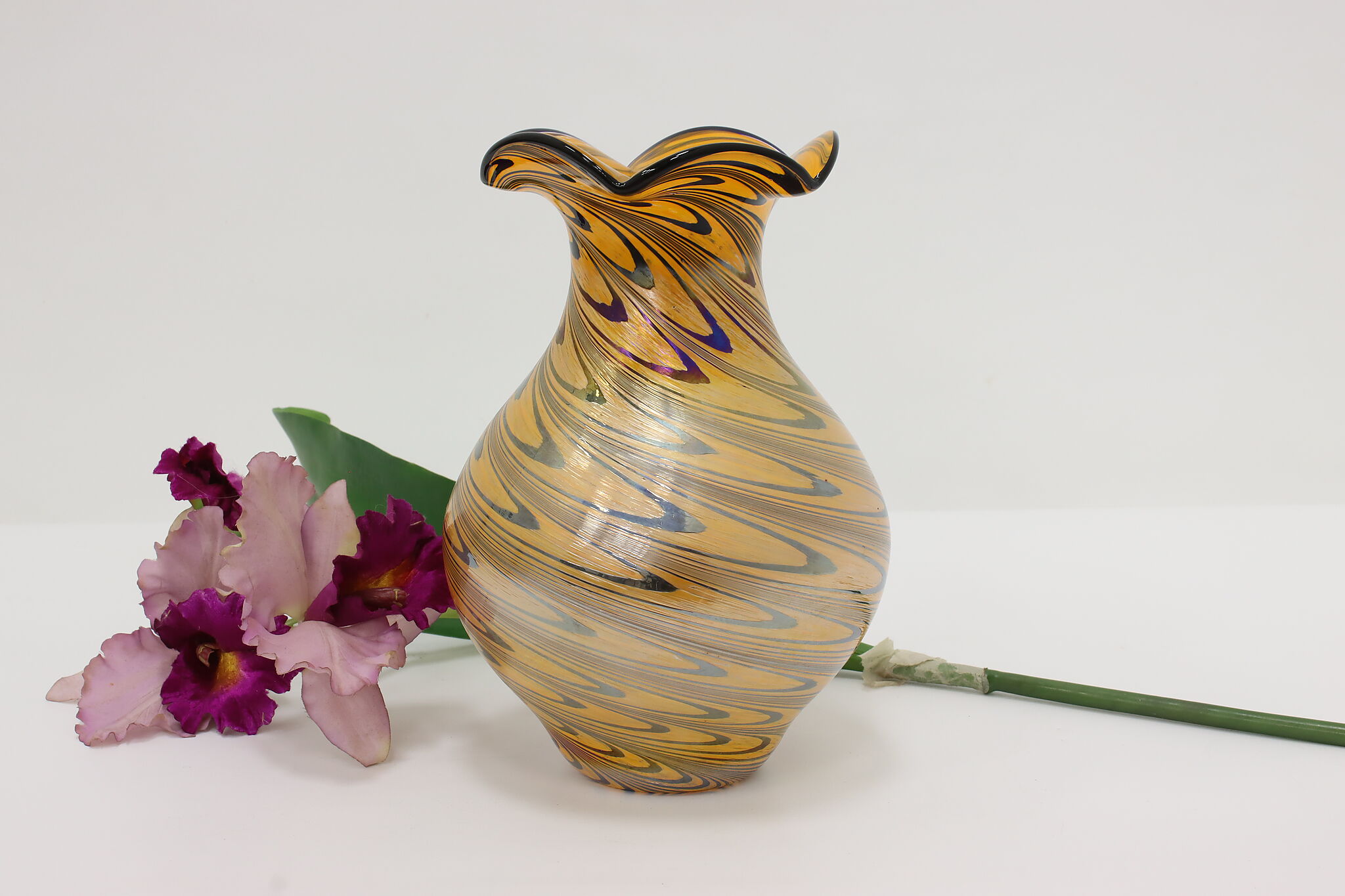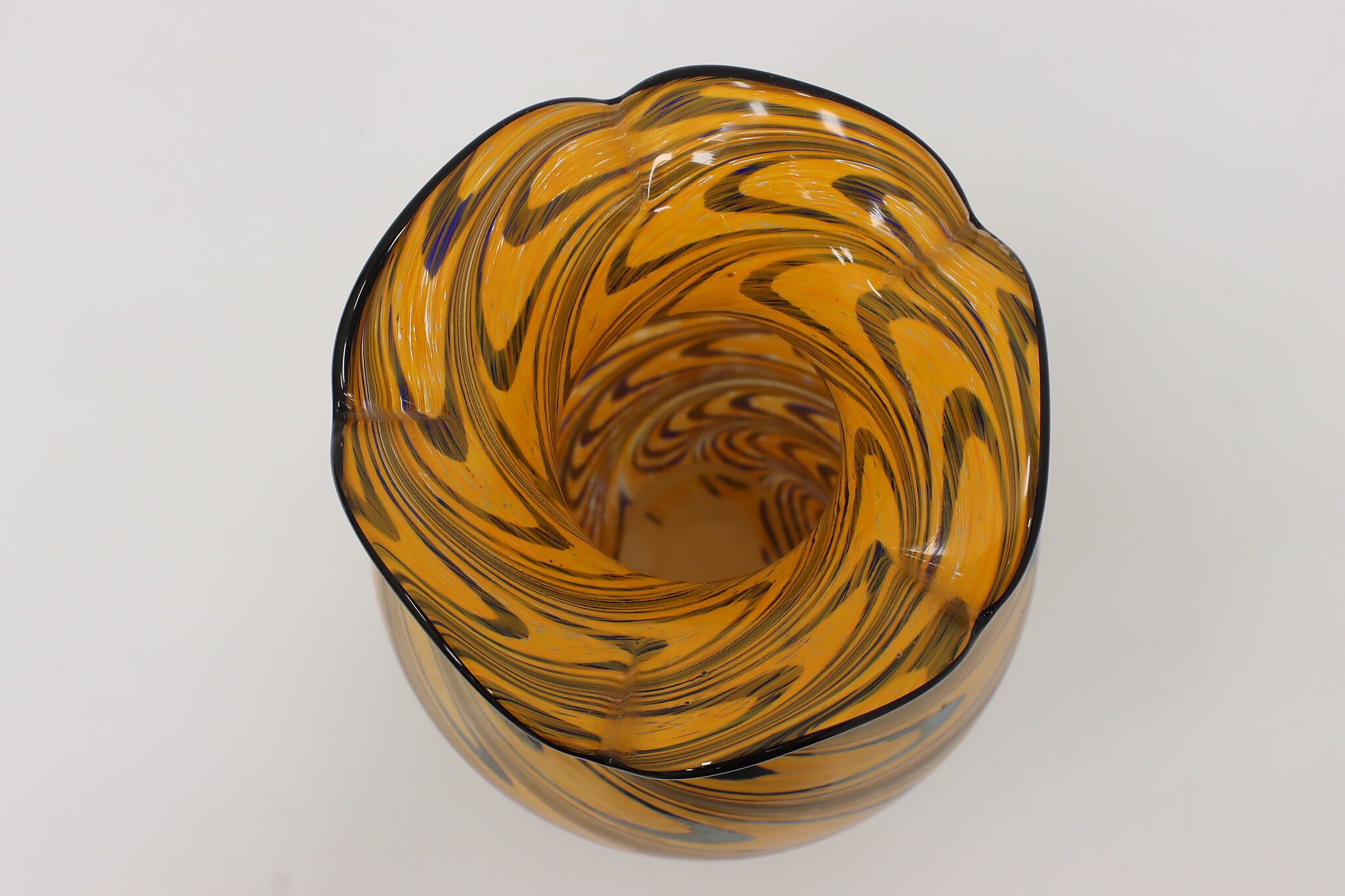 The bright, bold orange and blue threaded swirls on this vase will brighten up a space, especially if placed near a window with plenty of sunshine.