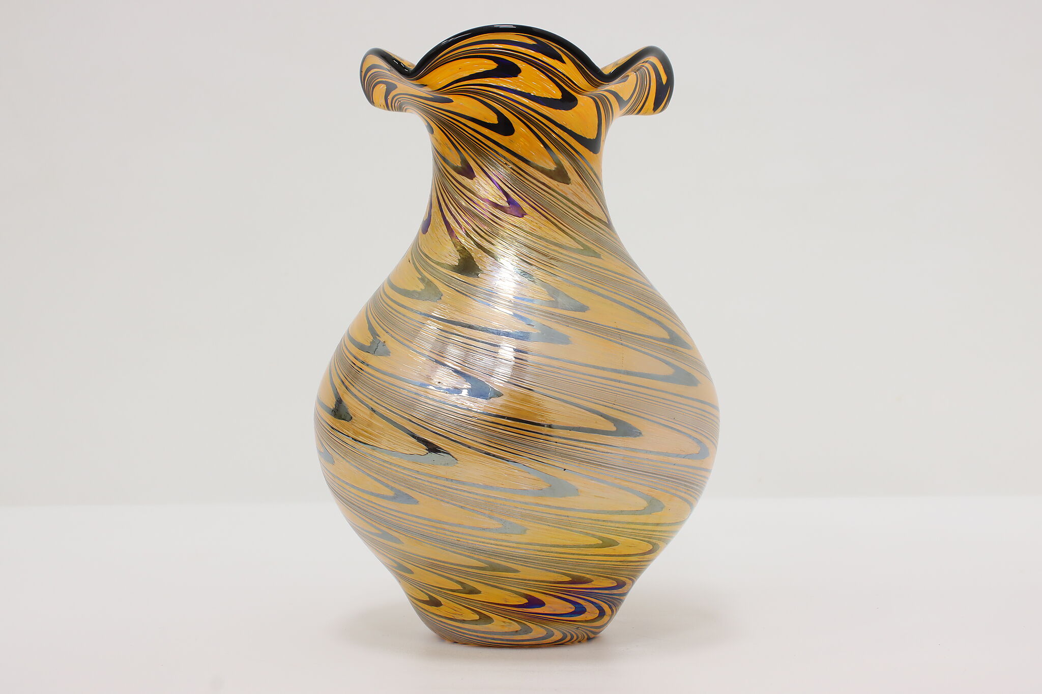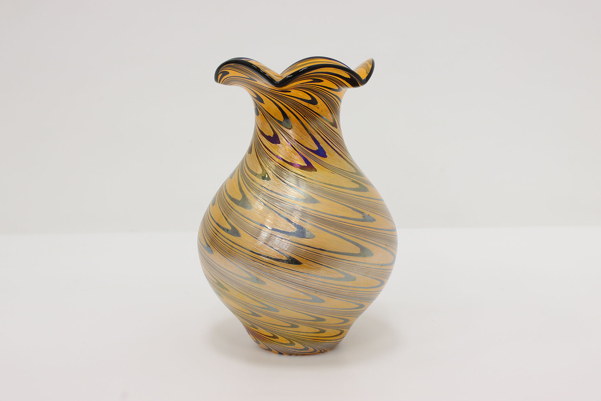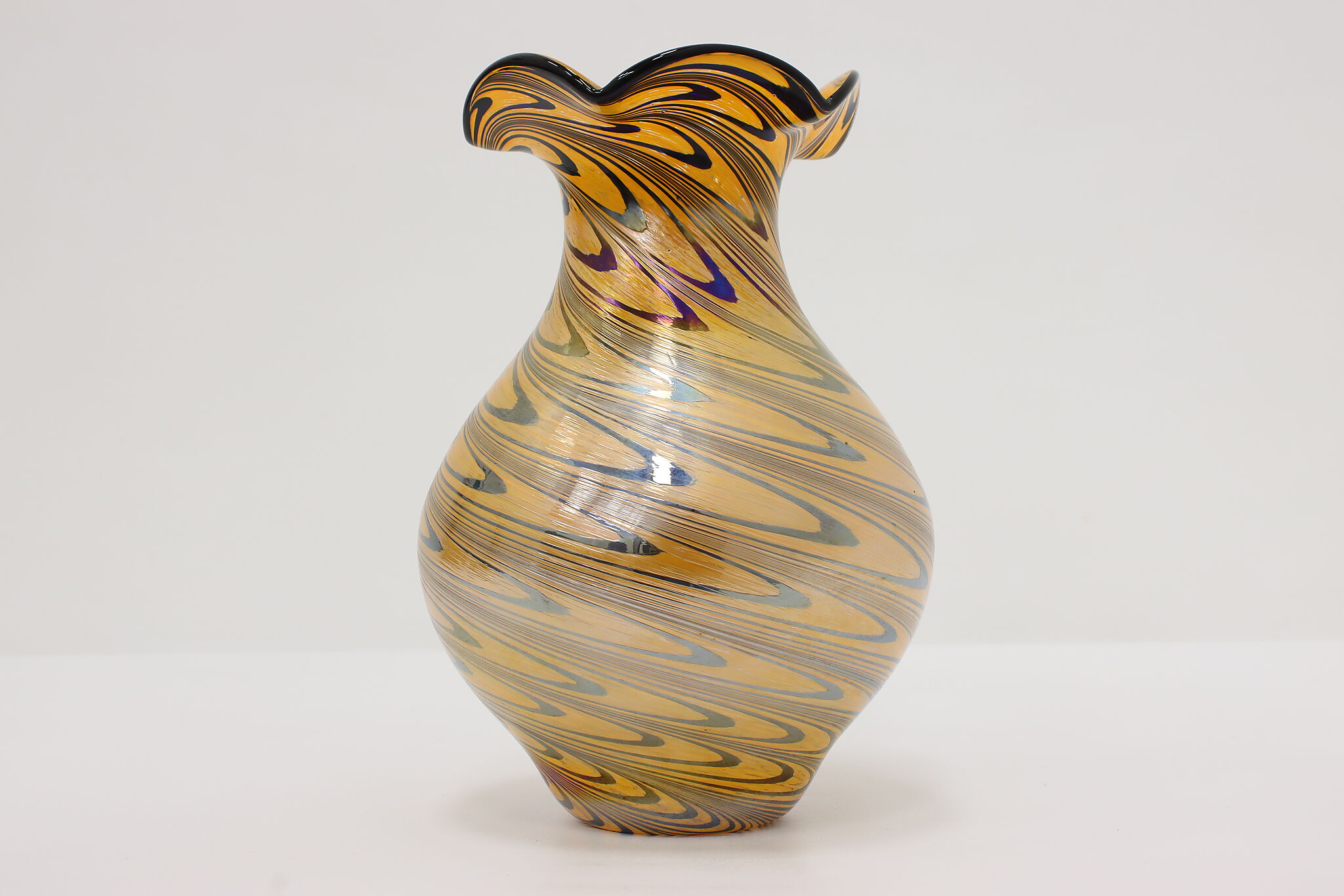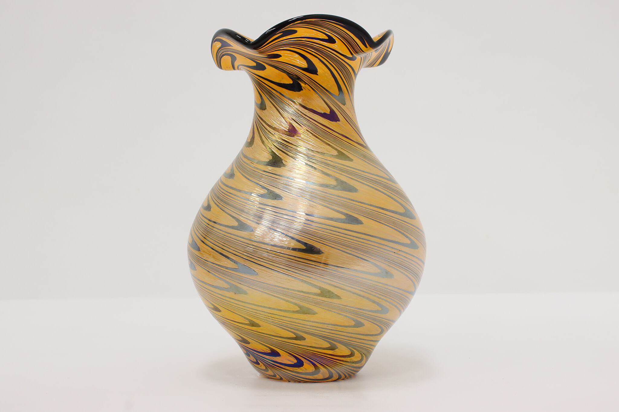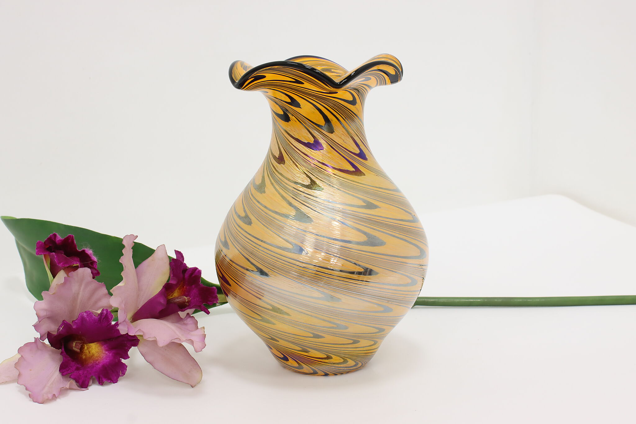 The bright, bold orange and blue threaded swirls on this vase will brighten up a space, especially if placed near a window with plenty of sunshine.