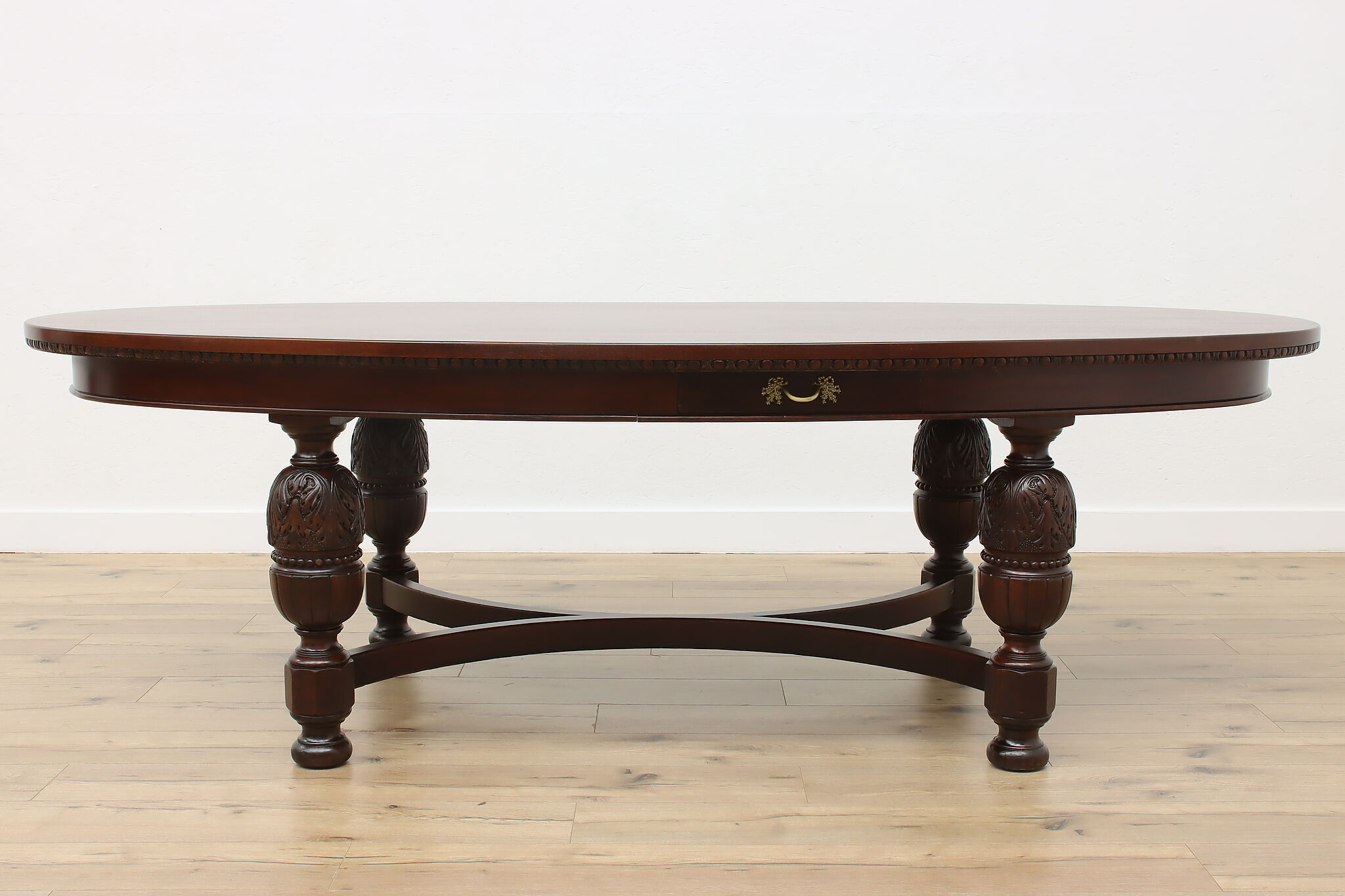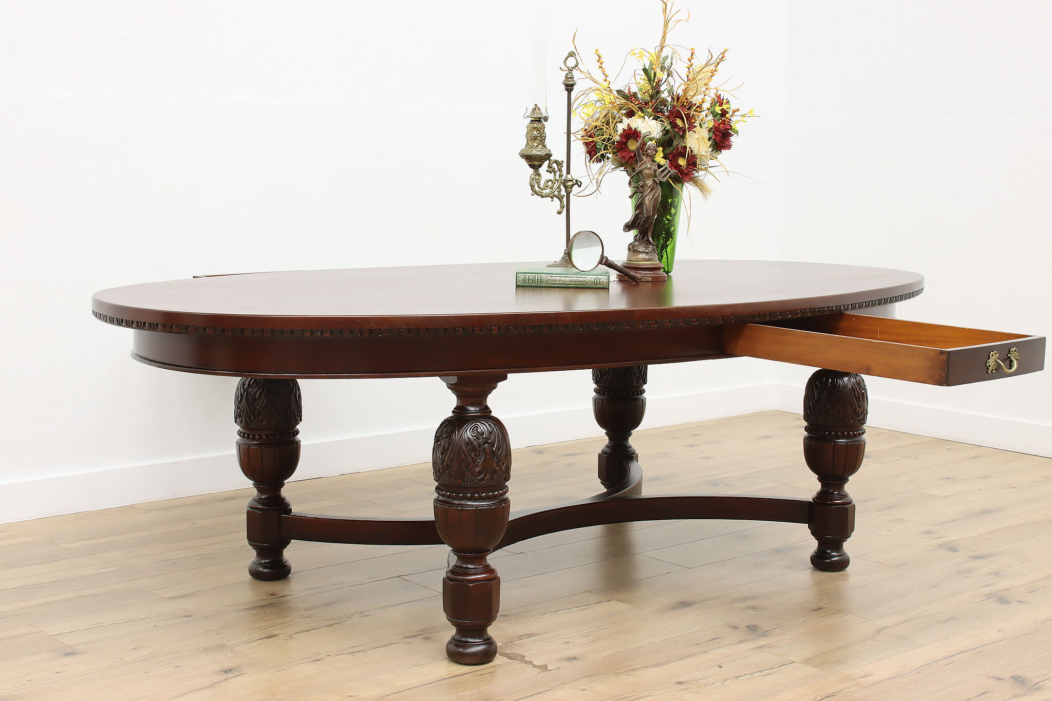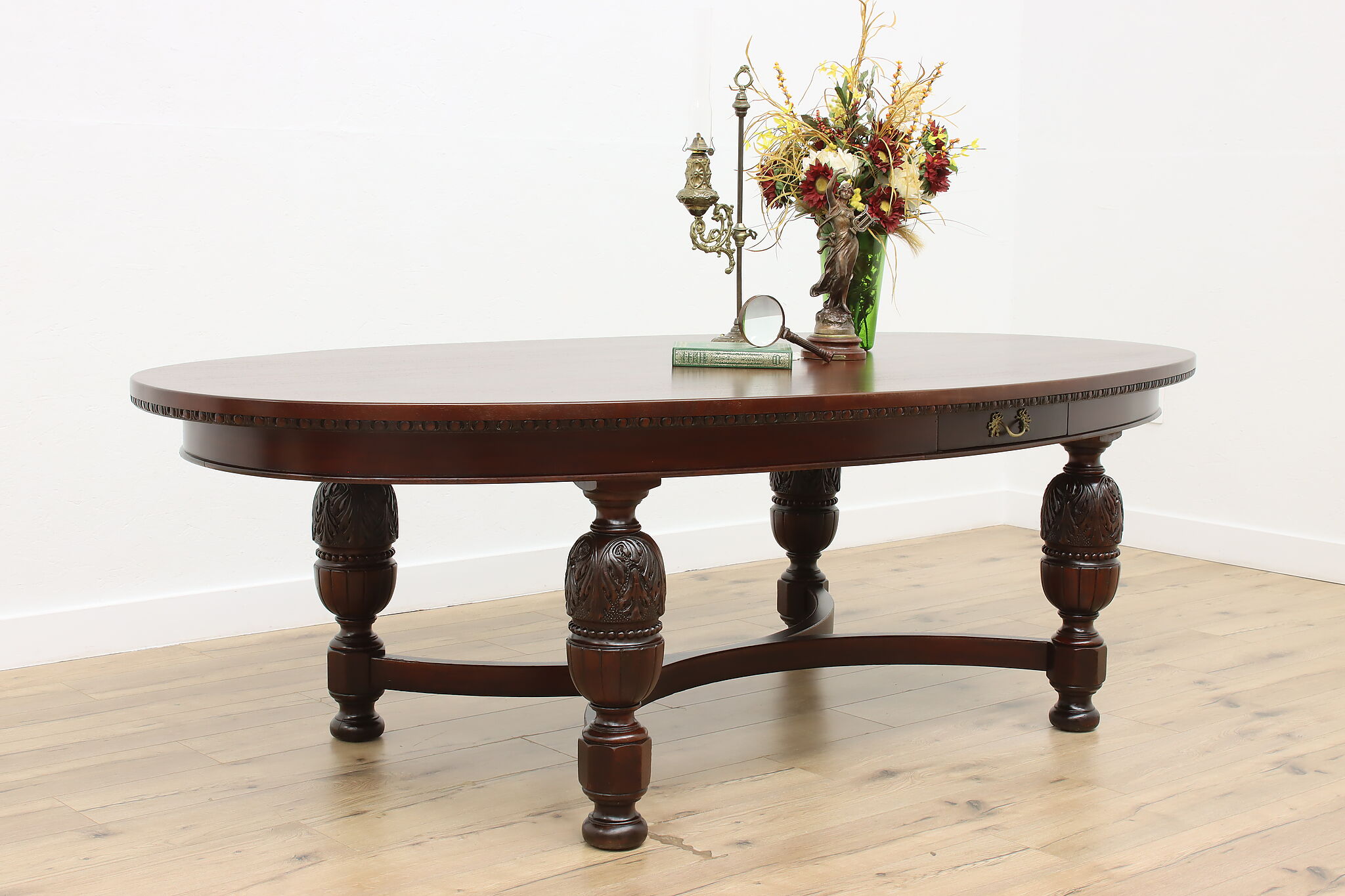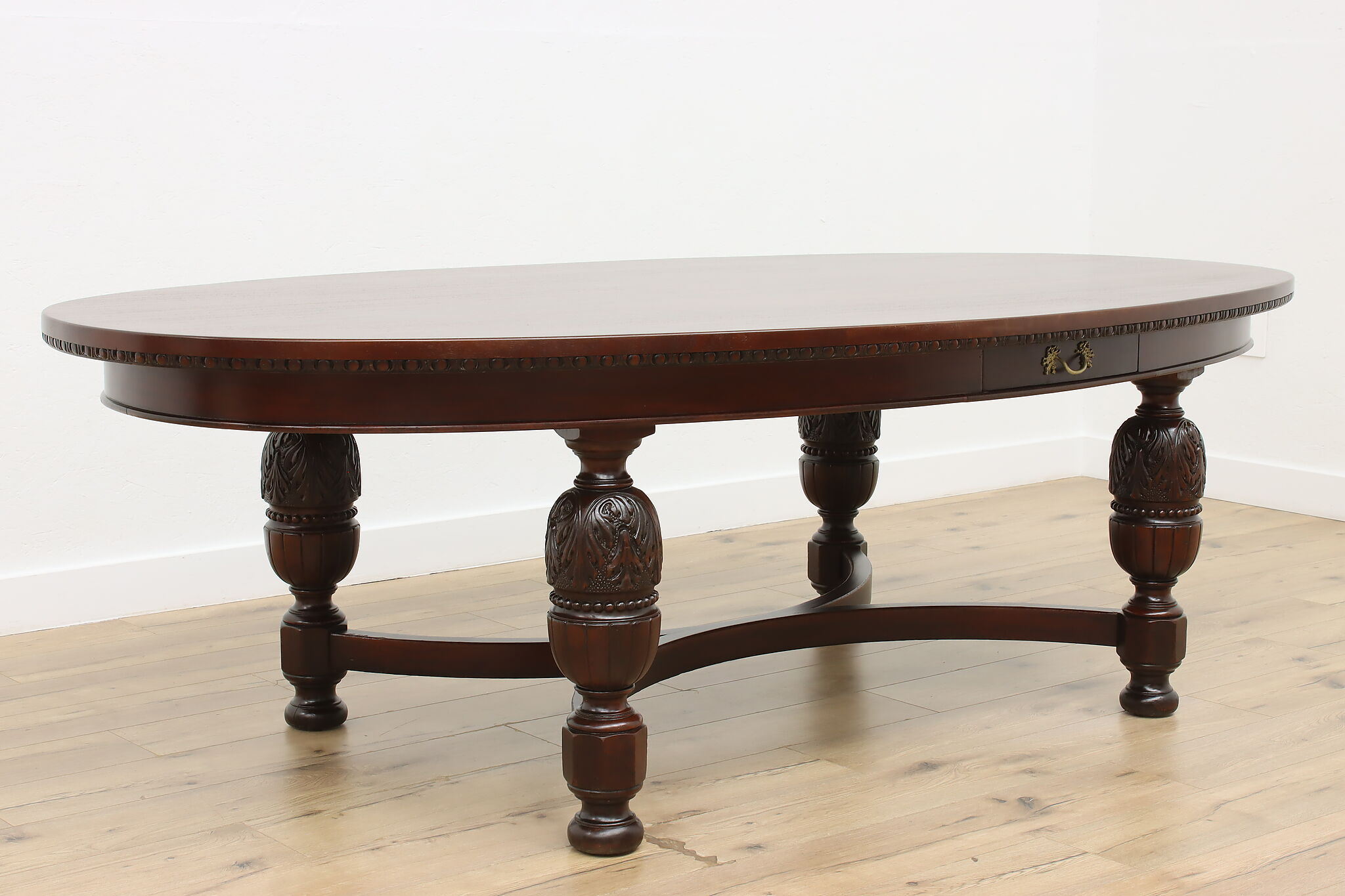 This gorgeous eight foot oval "partner" desk has a drawer for each facing partner, and could also be a dramatic dining table.