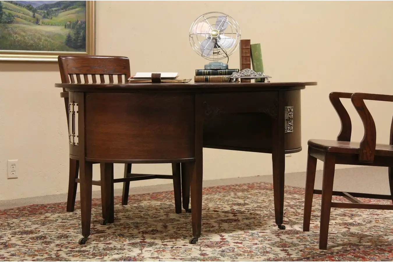 An authentic partner's desk is quarter sawn oak from about 1890. The elegant design recalls the "Aesthetic Movement" artistry of architect Louis Sullivan. The original hardware is cast bronze with worn silver plating, locks are operational.