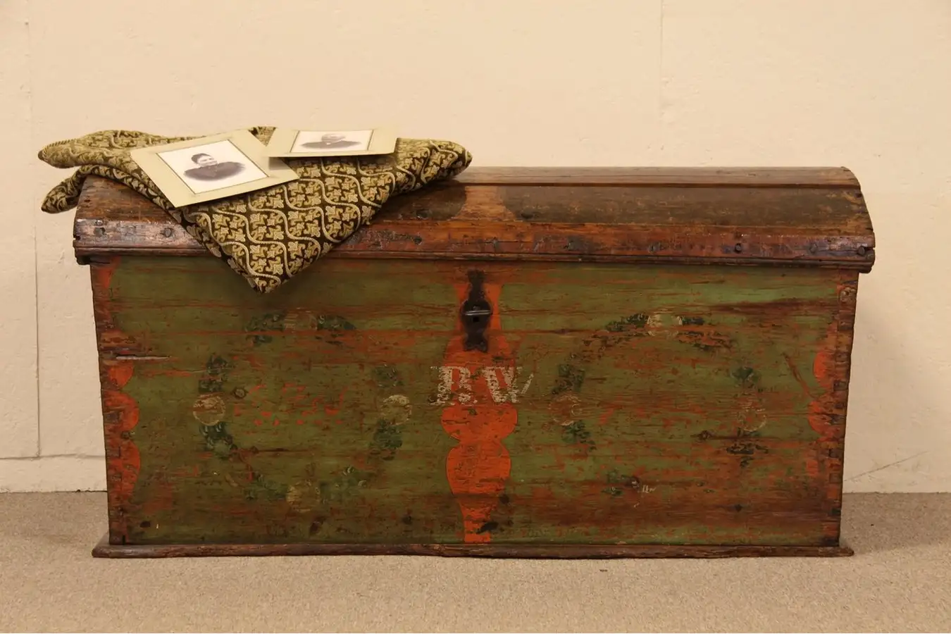 The original folk artist hand painting is worn and has beautiful patina. Wrought iron hardware, including the working lock and key are original. Hand-planed boards are secured by carved wooden pegs and hand made nails.