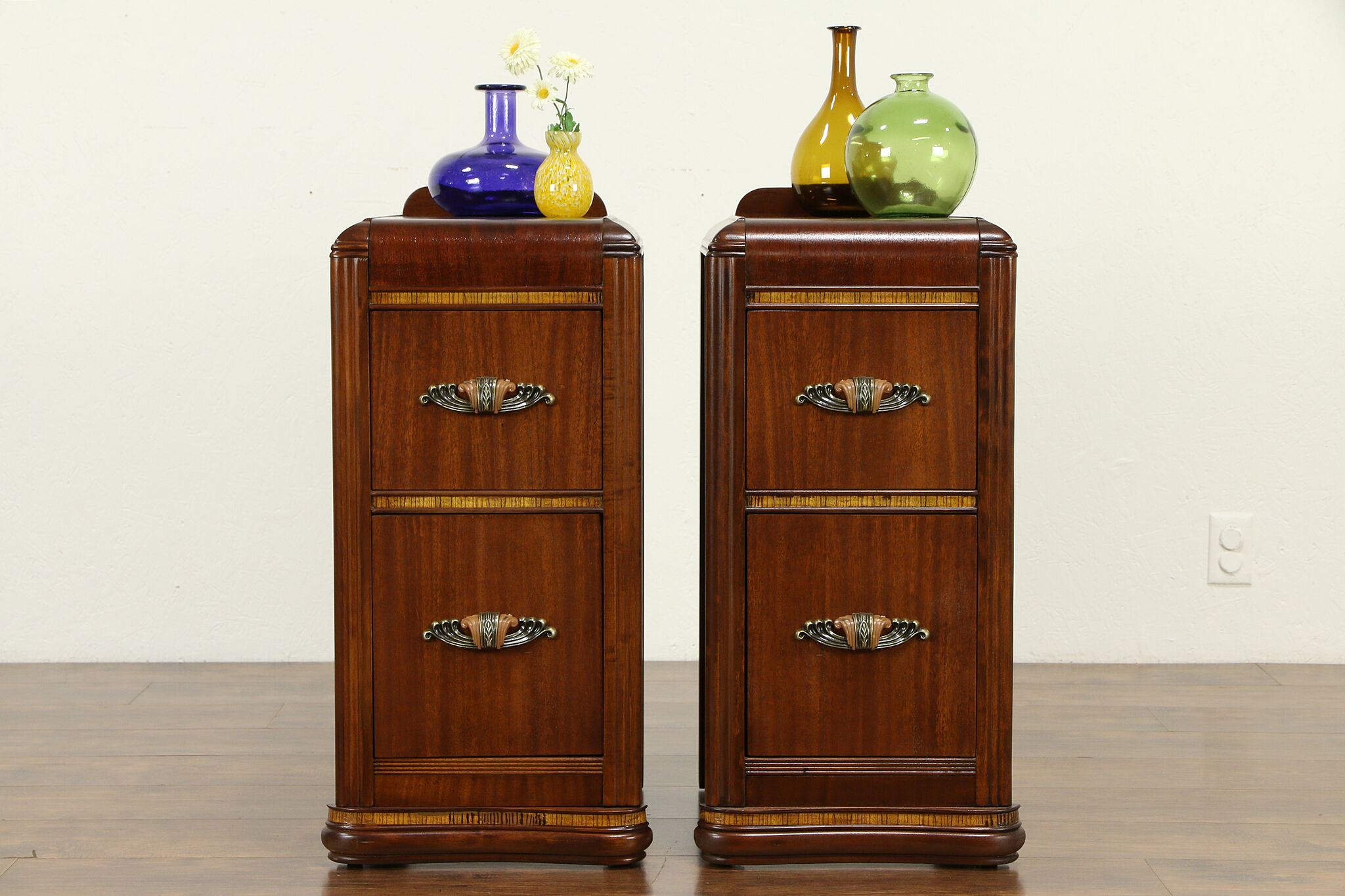 A pair of Art Deco nightstands or end tables from the late 1930's are mahogany and maple with zebrawood banding.