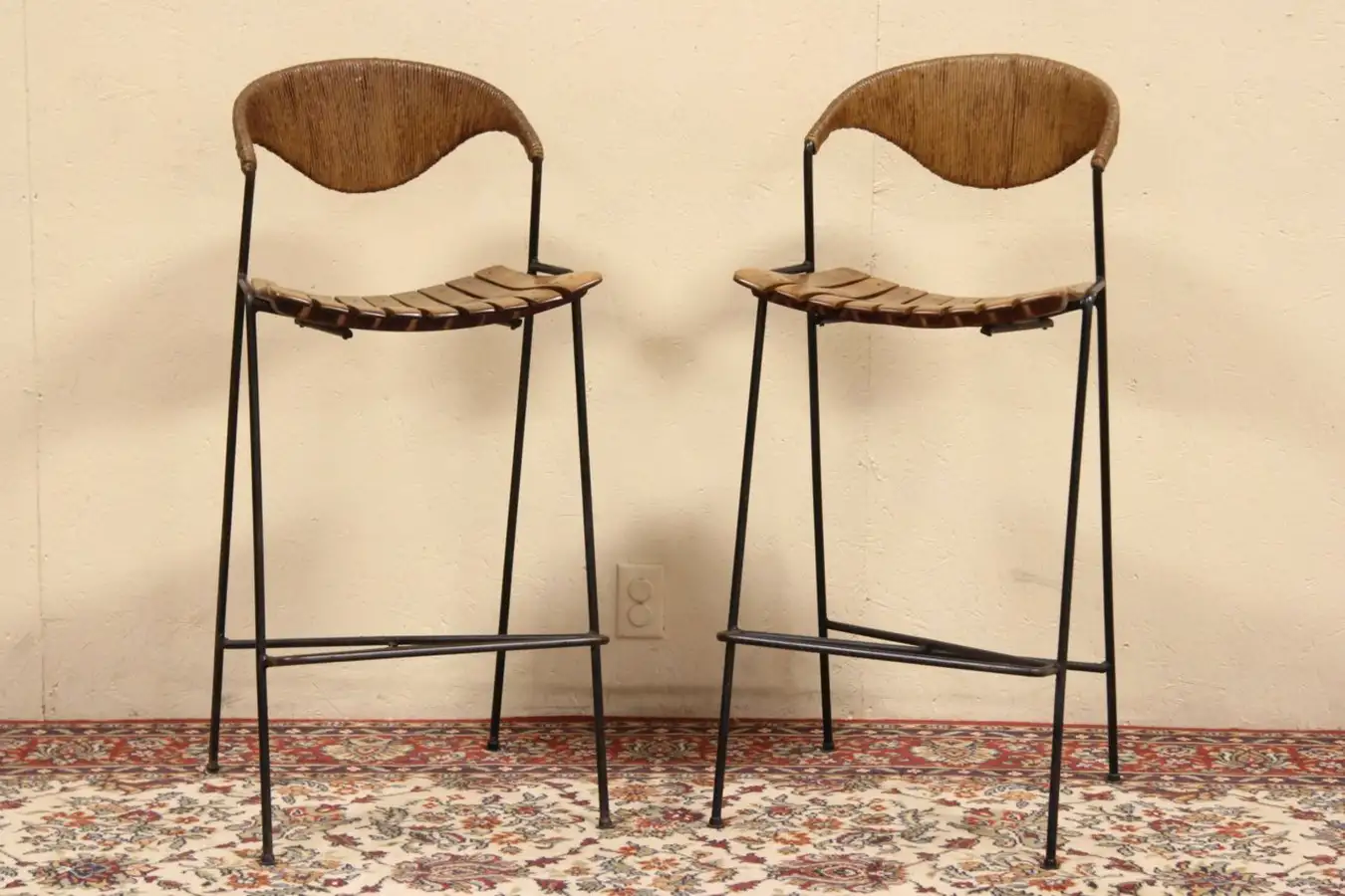 This pair of Midcentury Modern stools do not have signature labels, but are unmistakeably the work of noted designer, Arthur Umanoff. Many photos of these stools are available on line, google "Images for Umanoff."