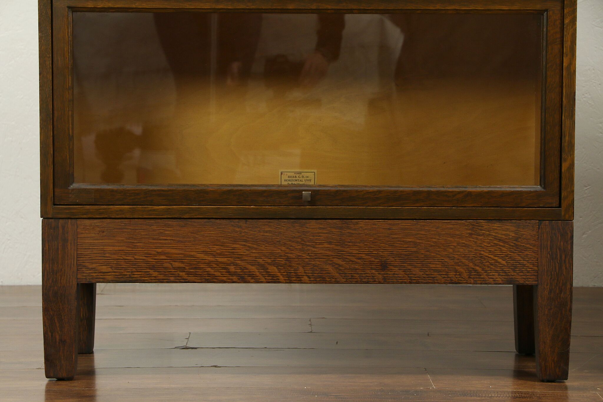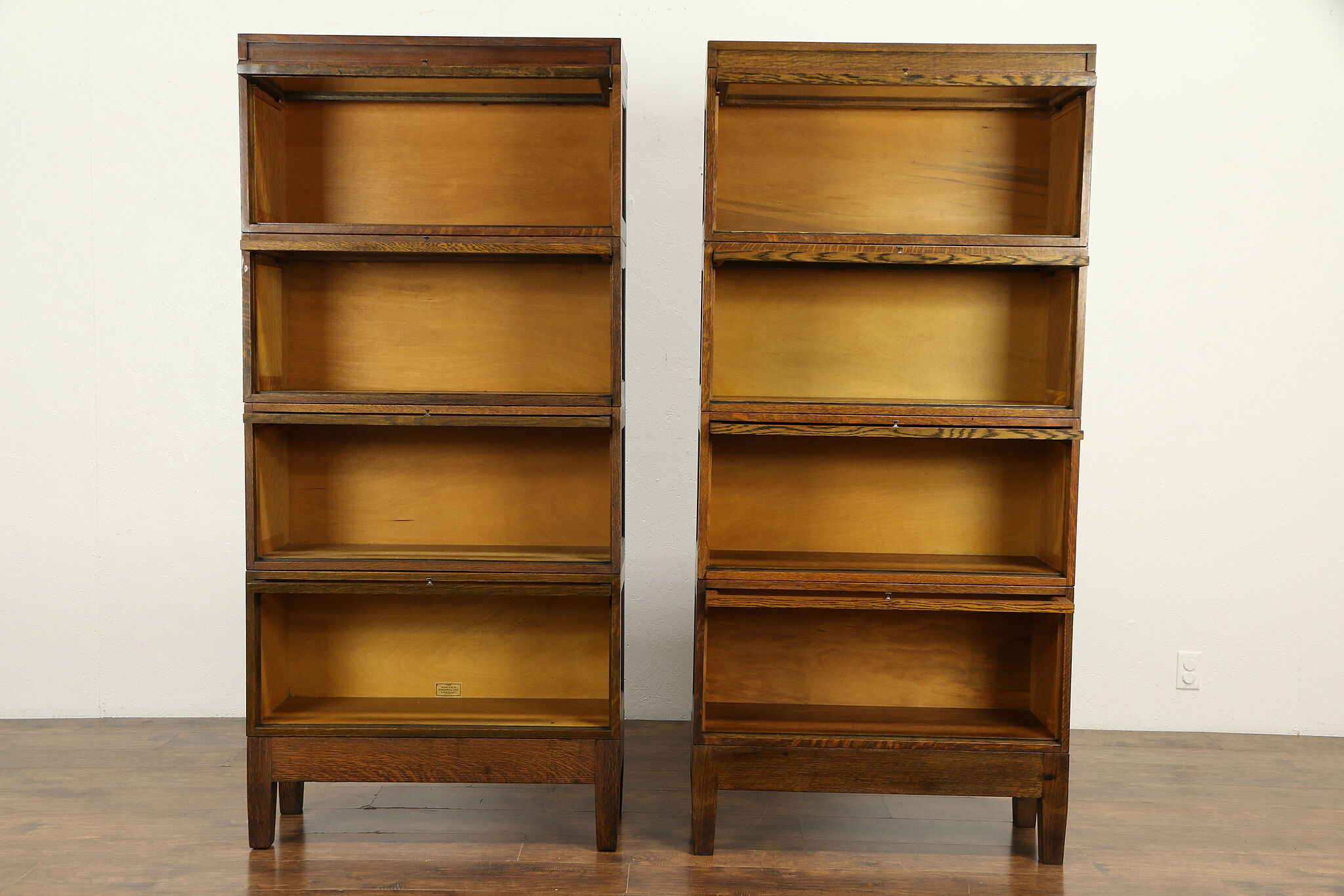 A pair of Arts and Crafts or Mission Oak period stacking "lawyer" bookcases from about 1910 are all original, except for one top crown section which was rebuilt. Four sections plus tops and bases are separate stacking modules, all in quarter sawn oak. Doors have wavy glass and square patinated brass knobs.