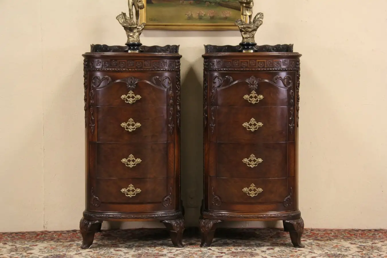 Tops have been revarnished for durability, the rest has a very fine old finish with warm antique patina. Waxed and buffed, only an occasional wipe with a soft dry cloth is needed to maintain their luster. Gracefully bowed drawer fronts have dovetailed joints on this palatial American made furniture.