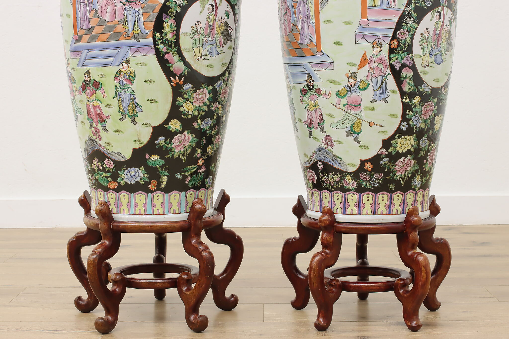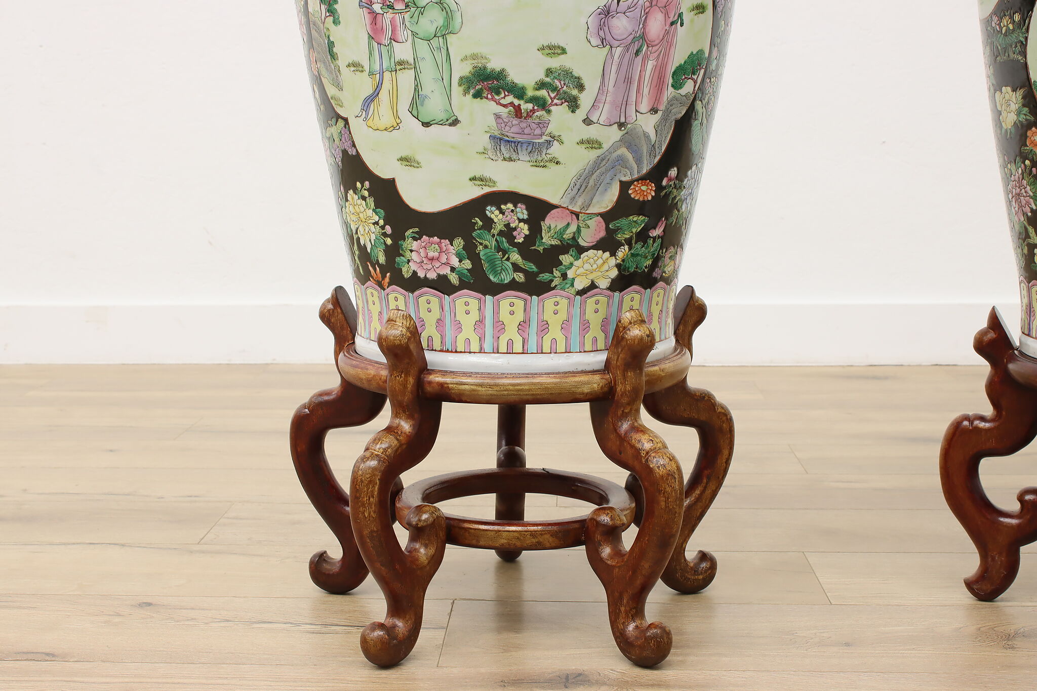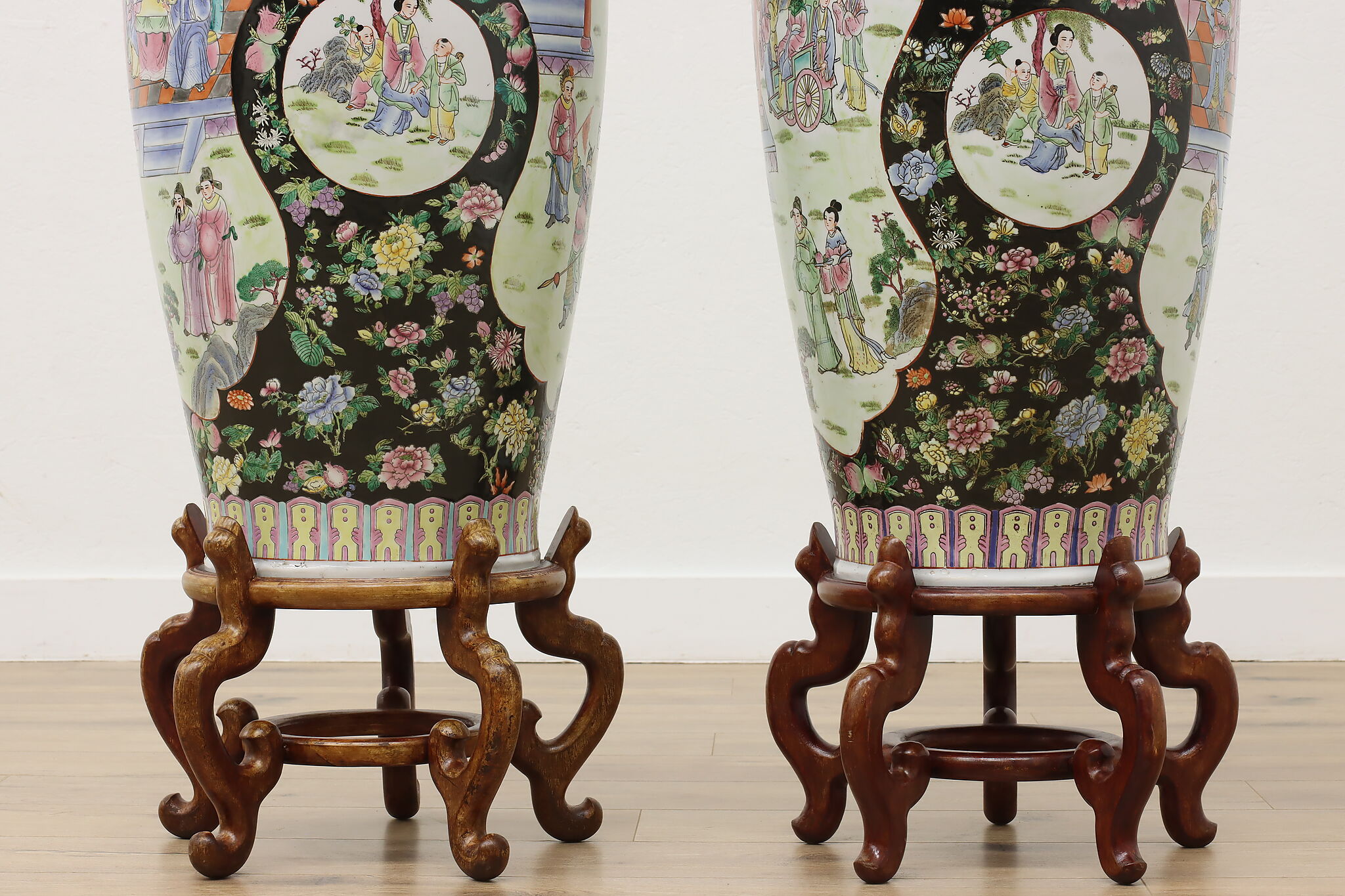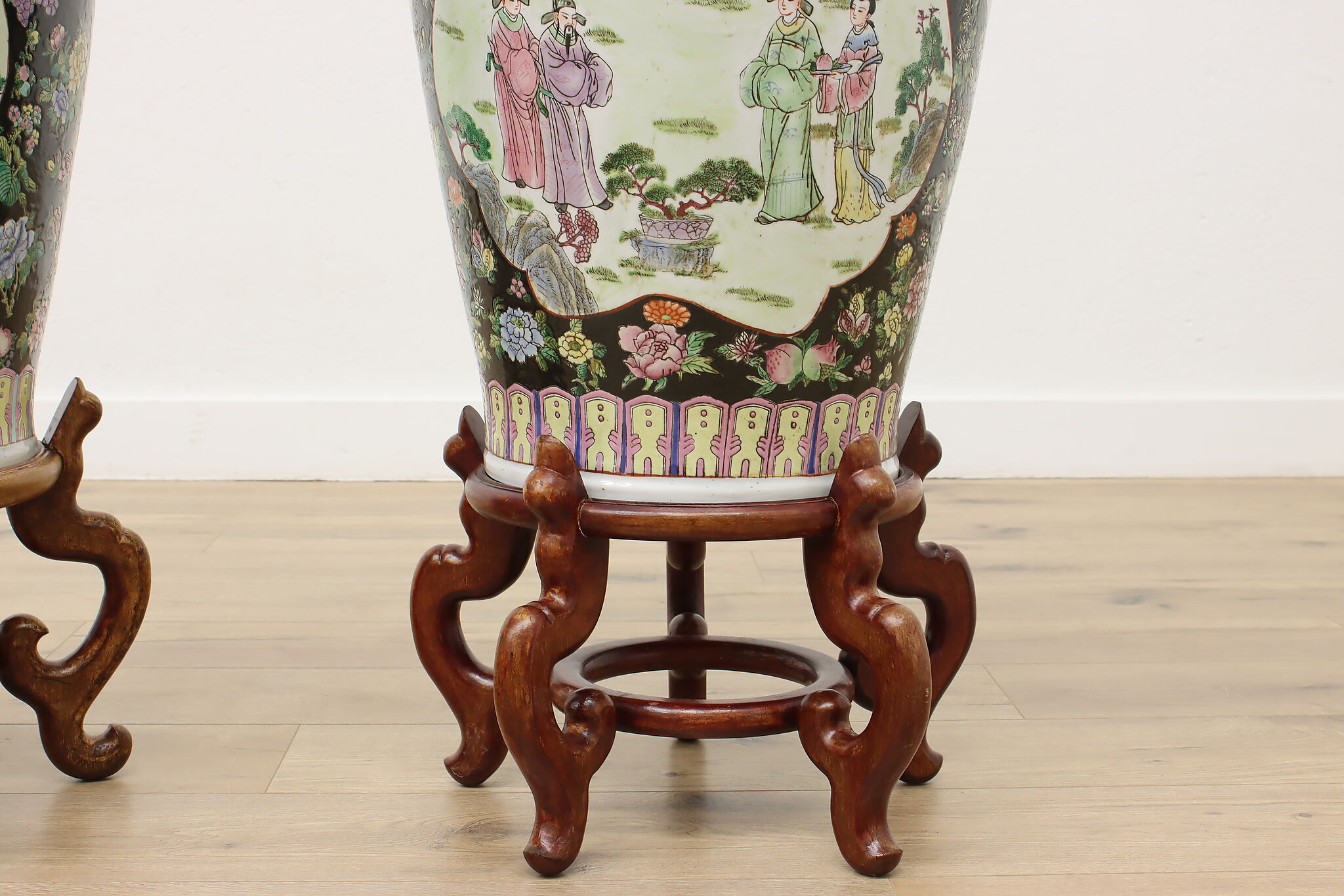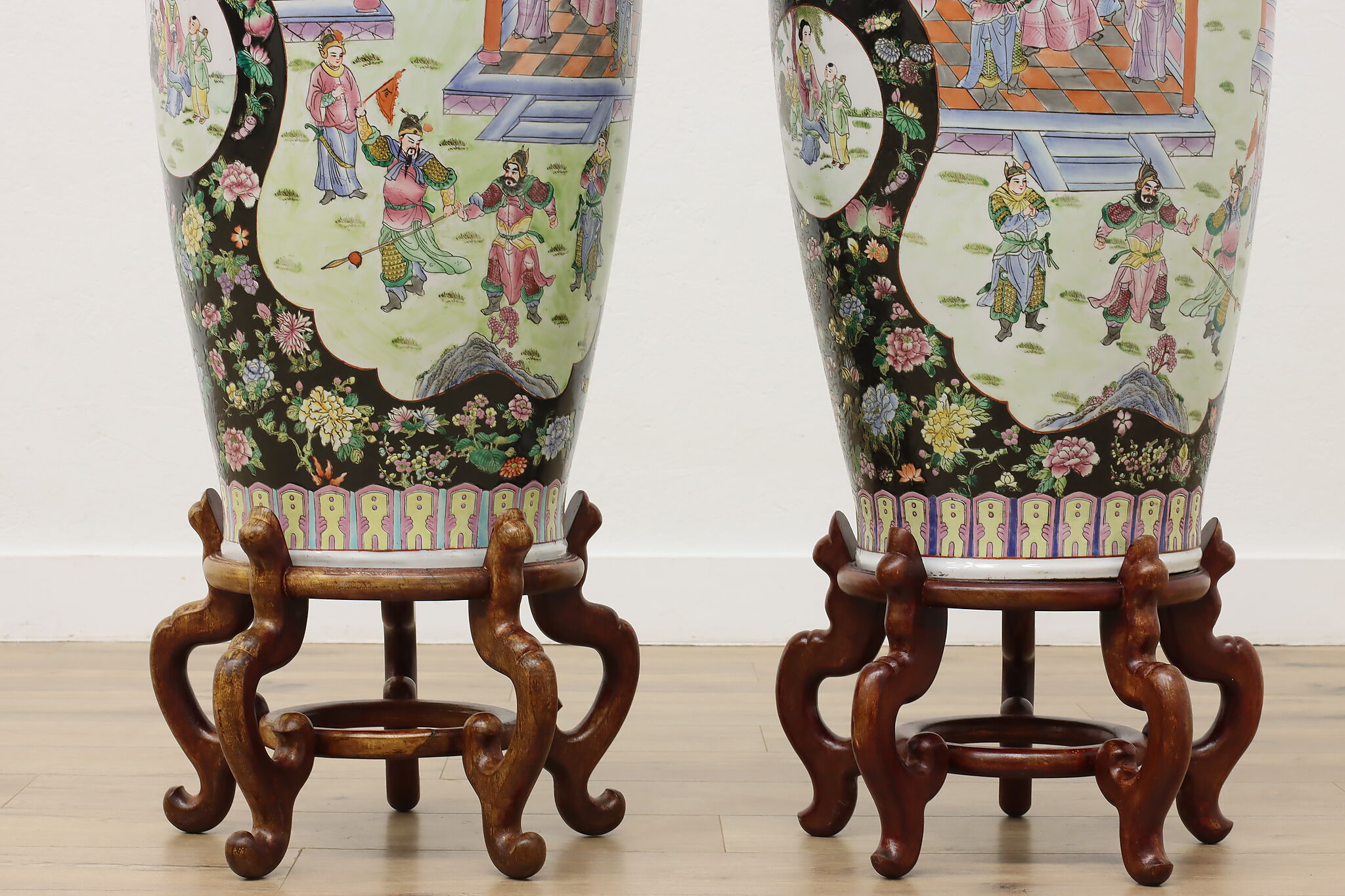 This gorgeous pair of Chinese hand-painted, embossed and glazed decorative porcelain vases with carved stands would be beautiful in an entryway or library.