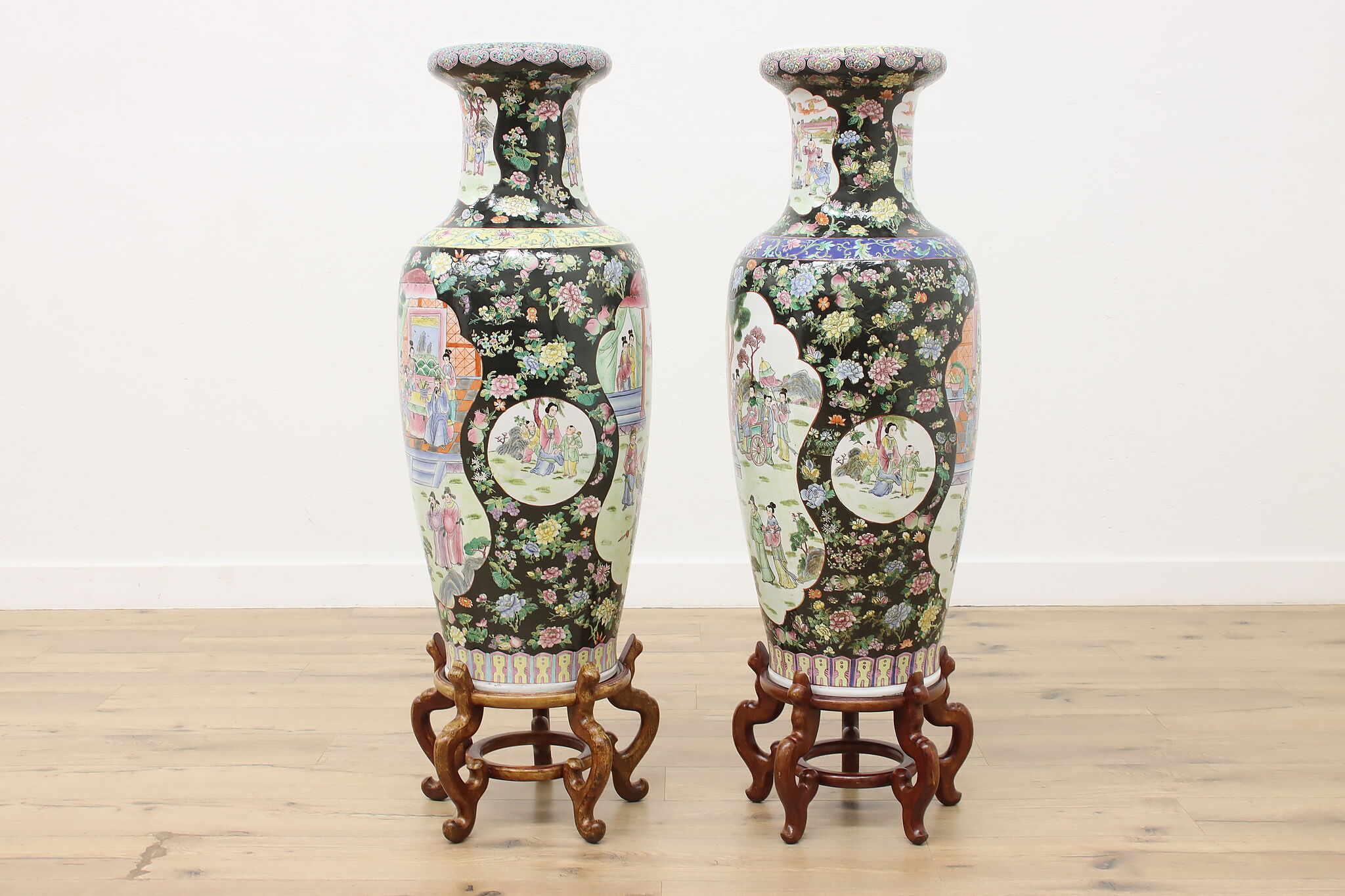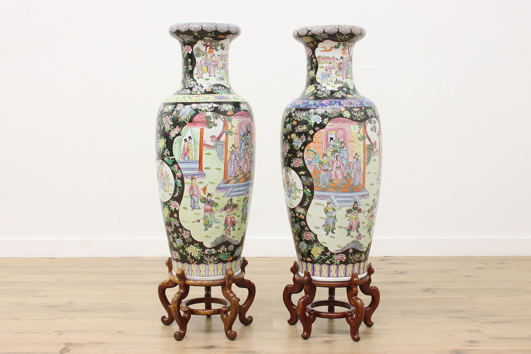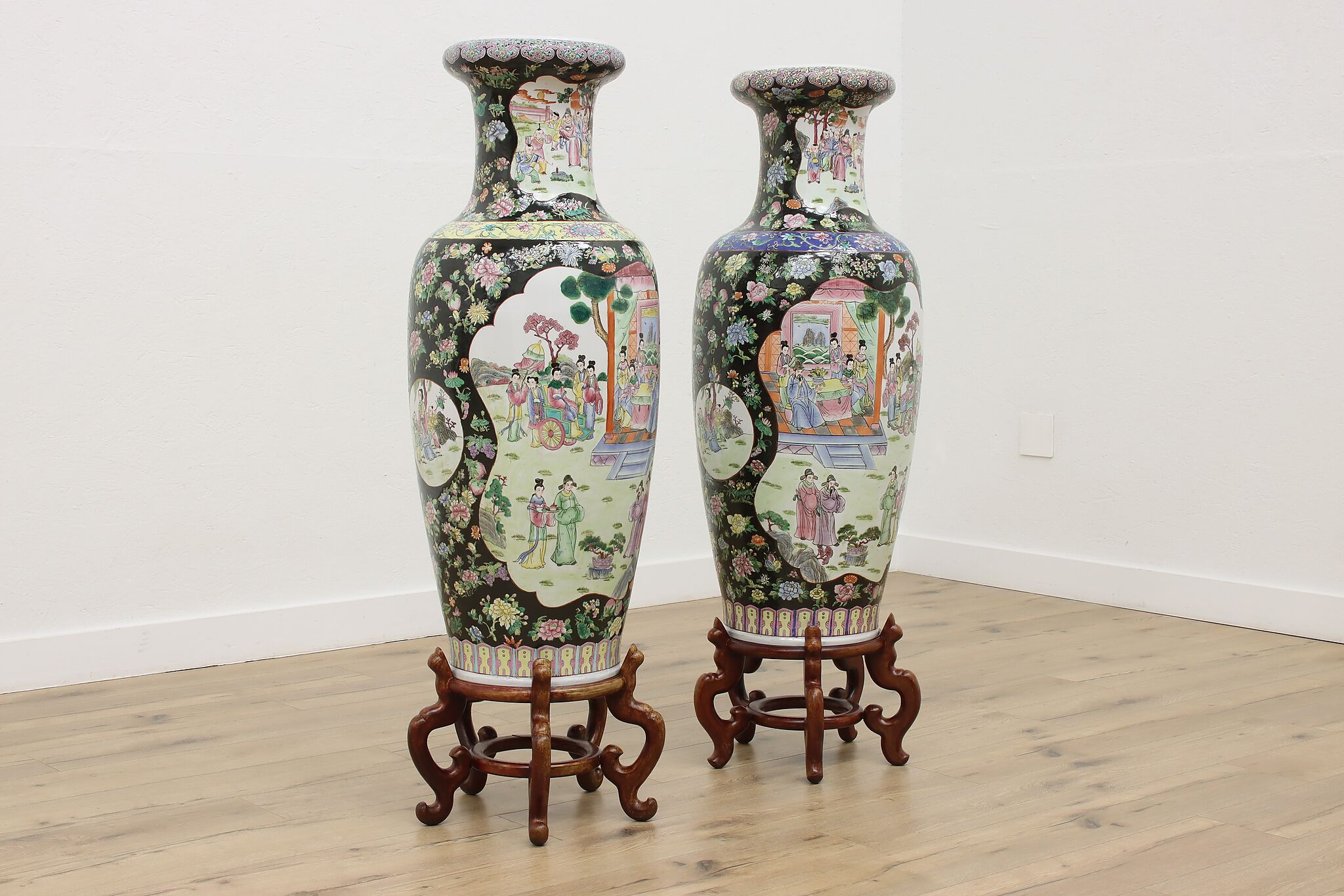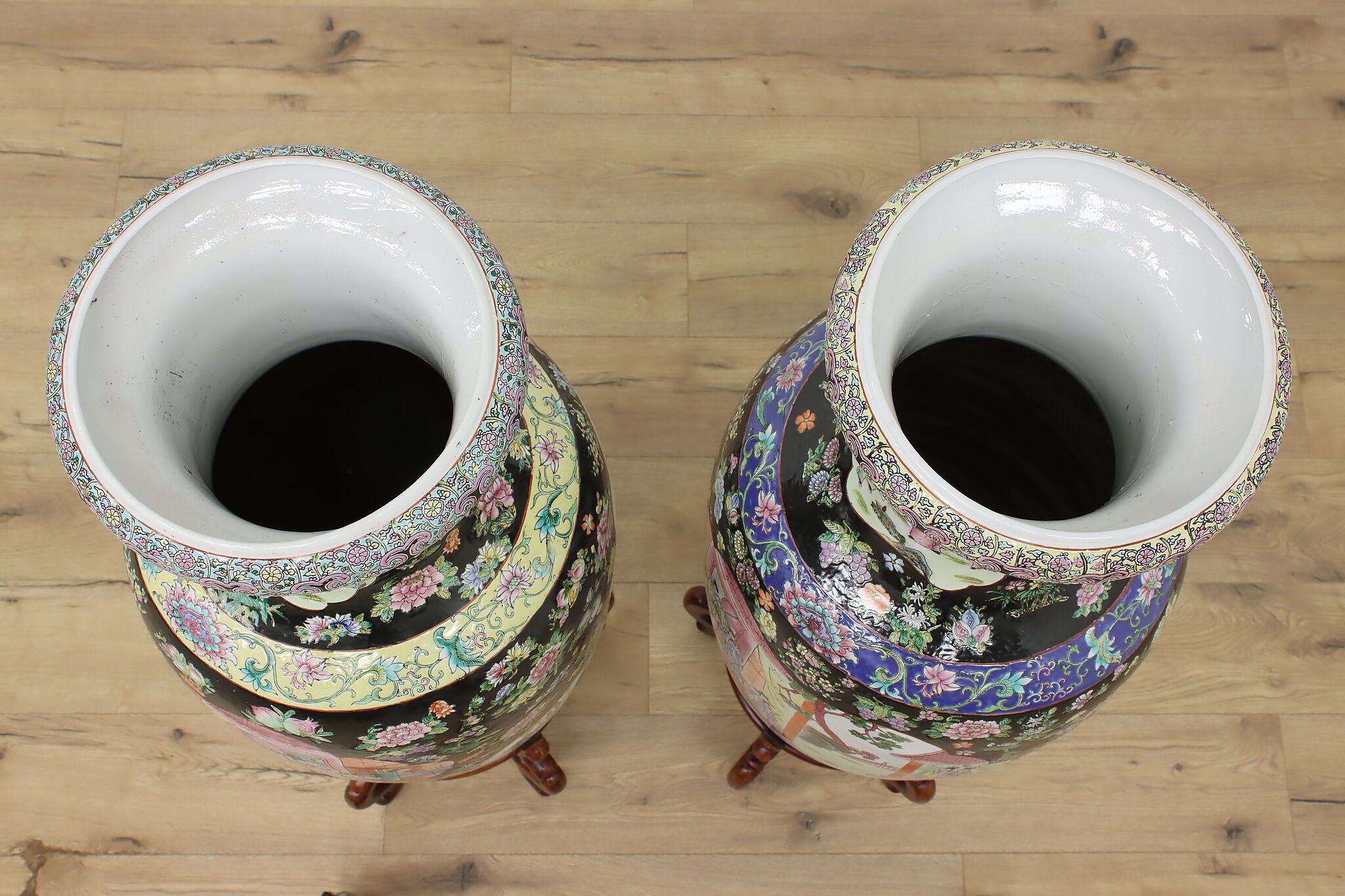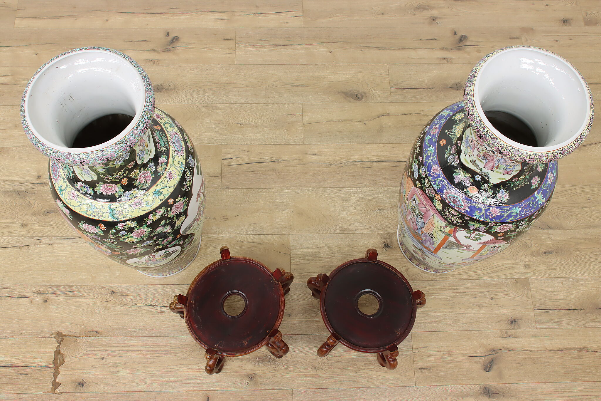 This gorgeous pair of Chinese hand-painted, embossed and glazed decorative porcelain vases with carved stands would be beautiful in an entryway or library.