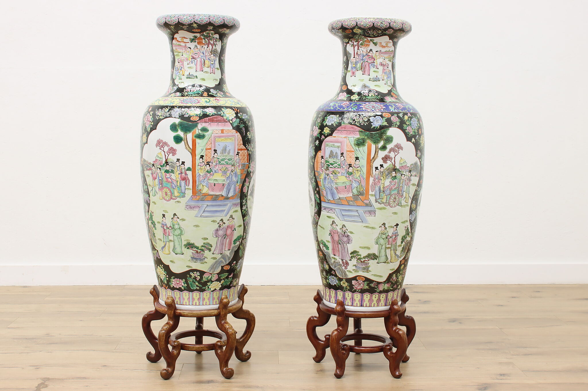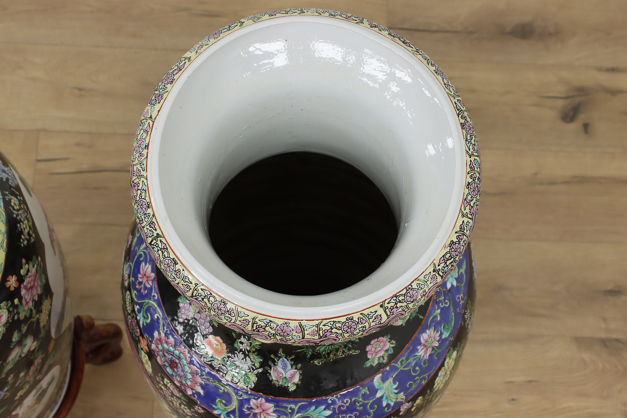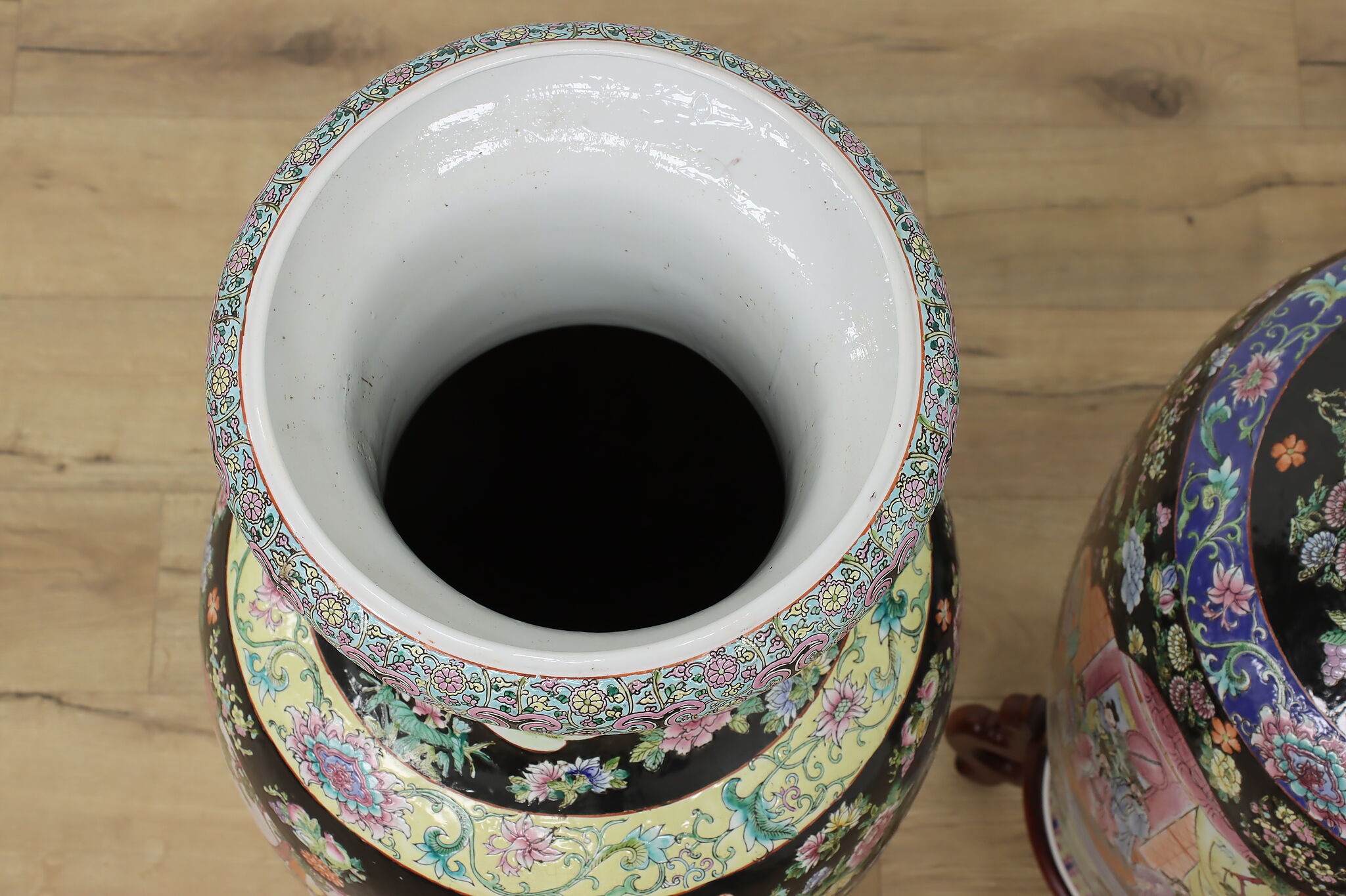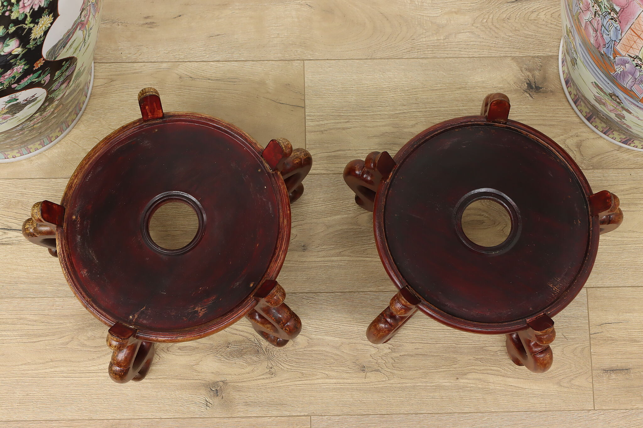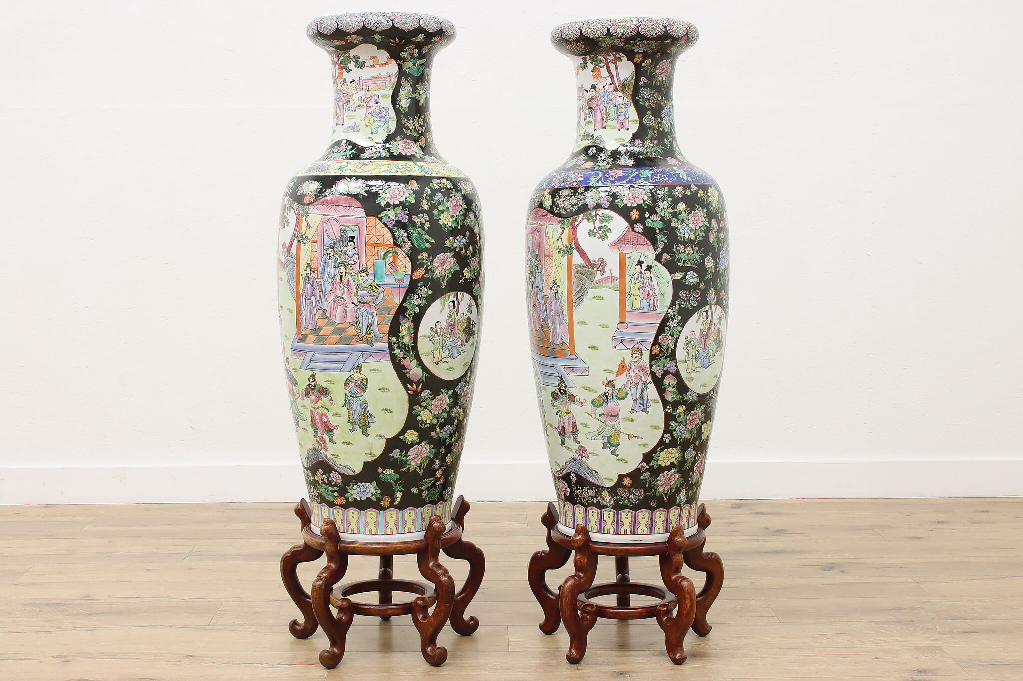 This gorgeous pair of Chinese hand-painted, embossed and glazed decorative porcelain vases with carved stands would be beautiful in an entryway or library.
