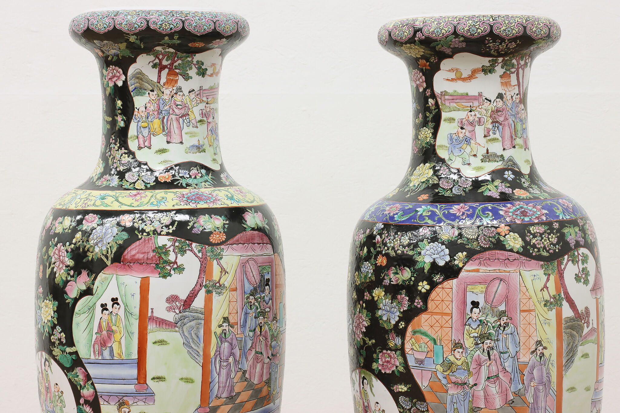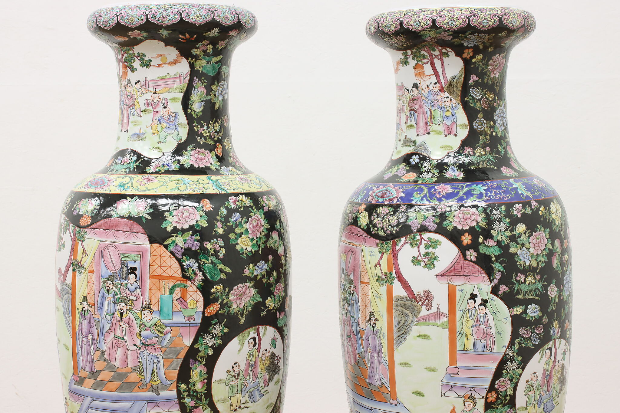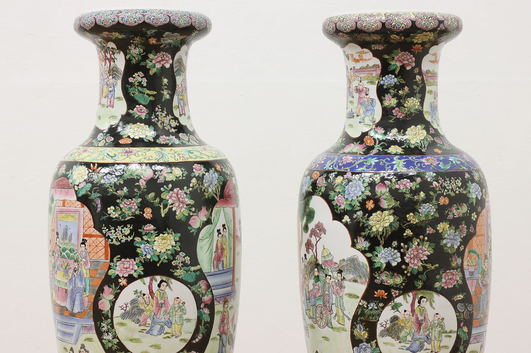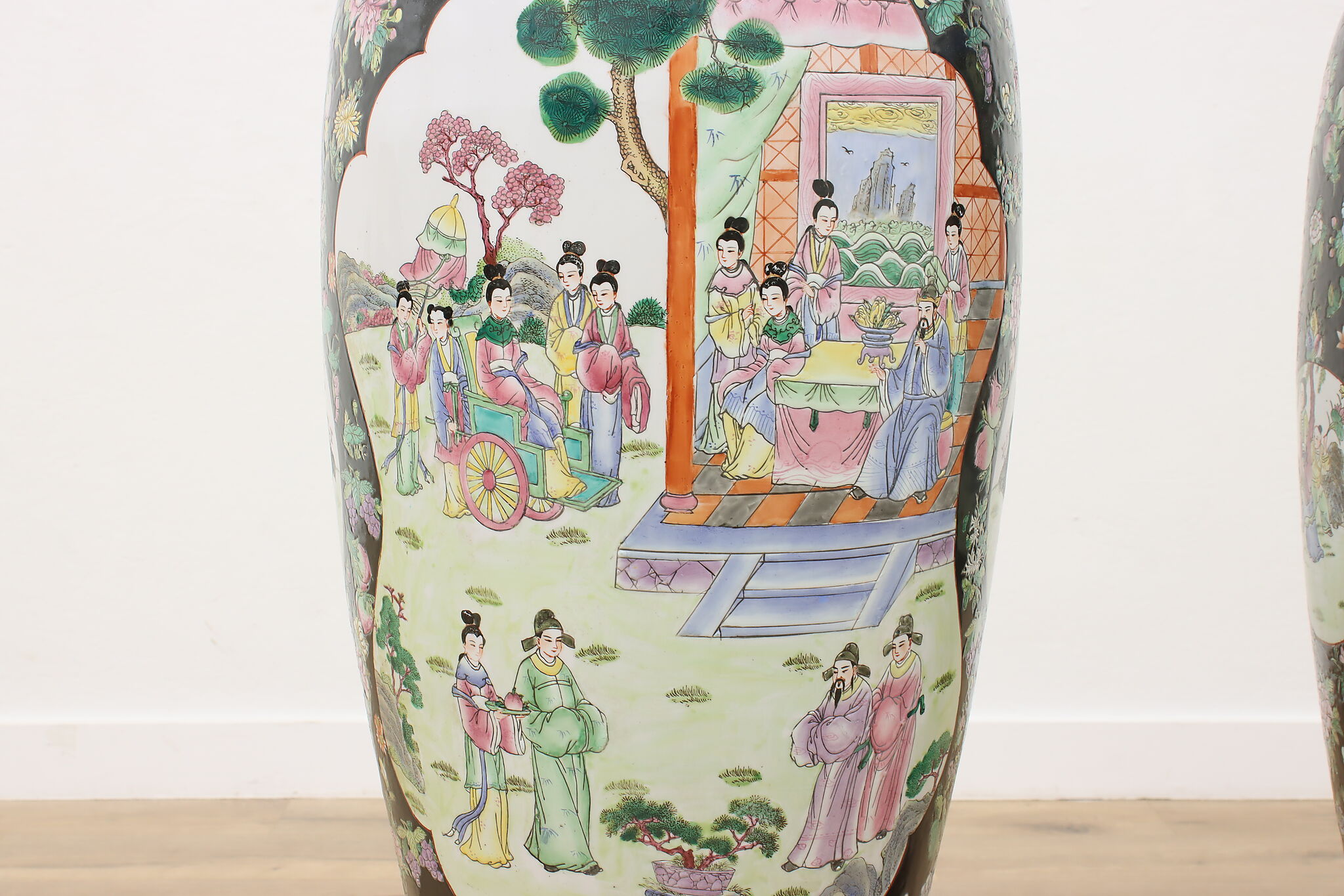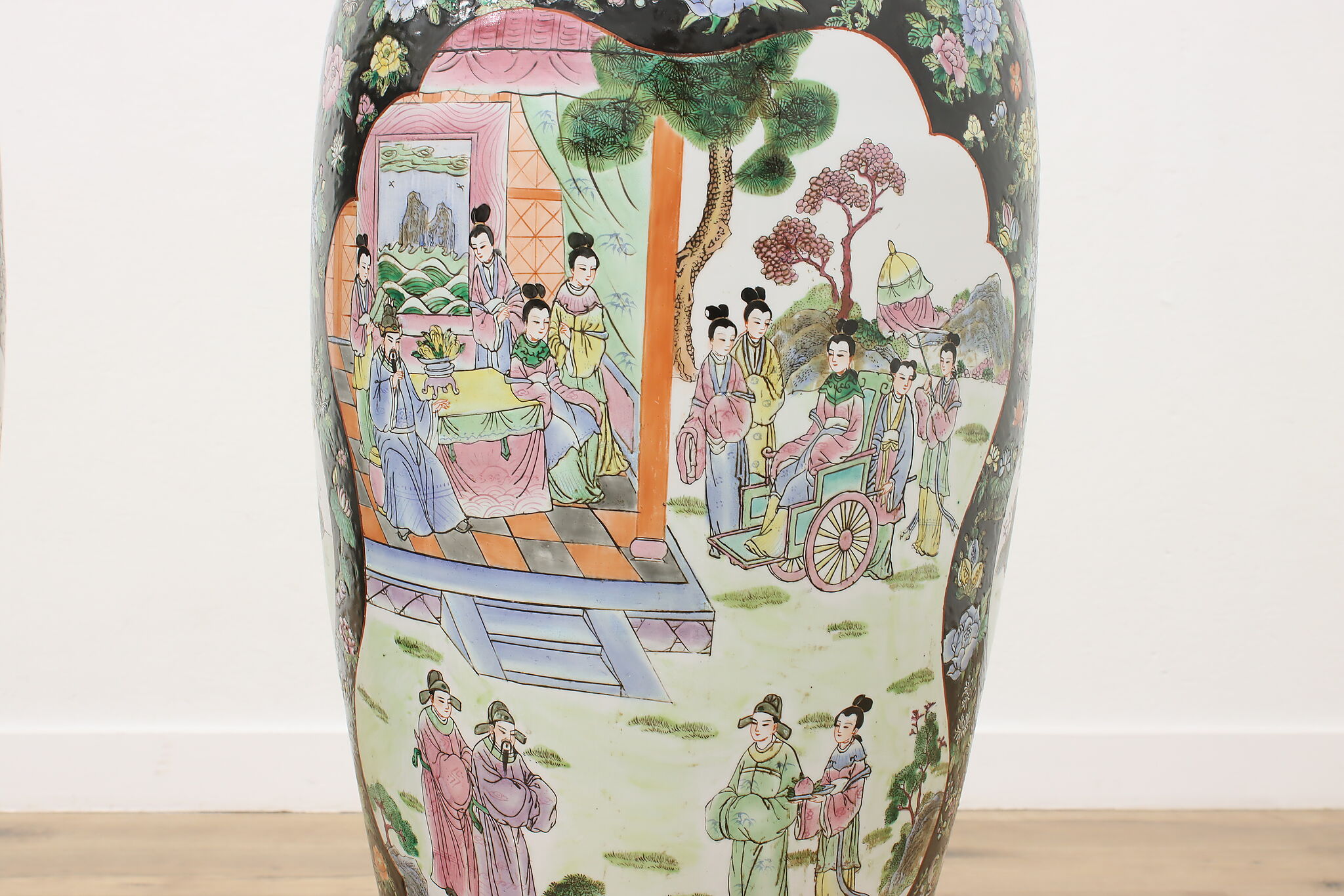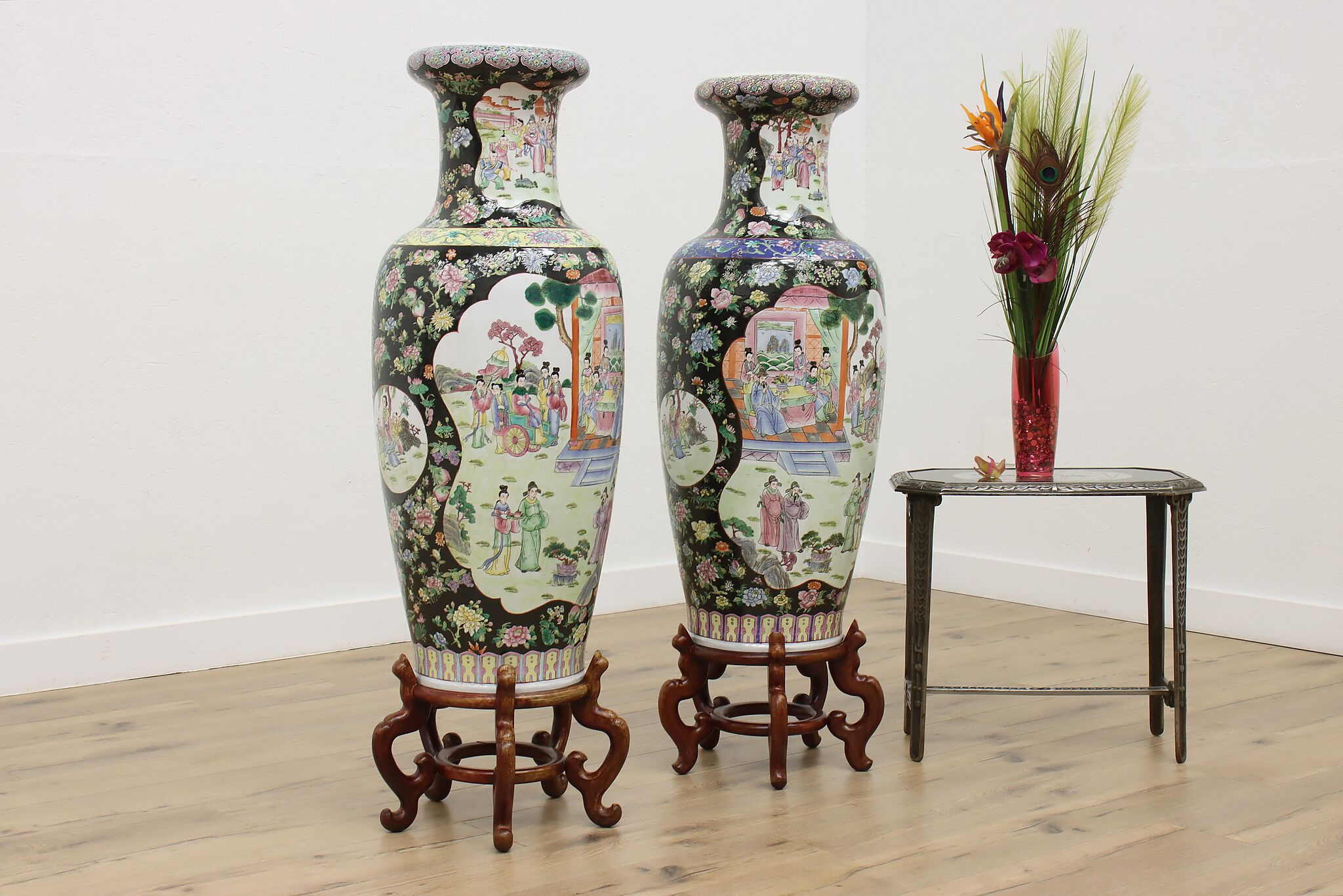 This gorgeous pair of Chinese hand-painted, embossed and glazed decorative porcelain vases with carved stands would be beautiful in an entryway or library.