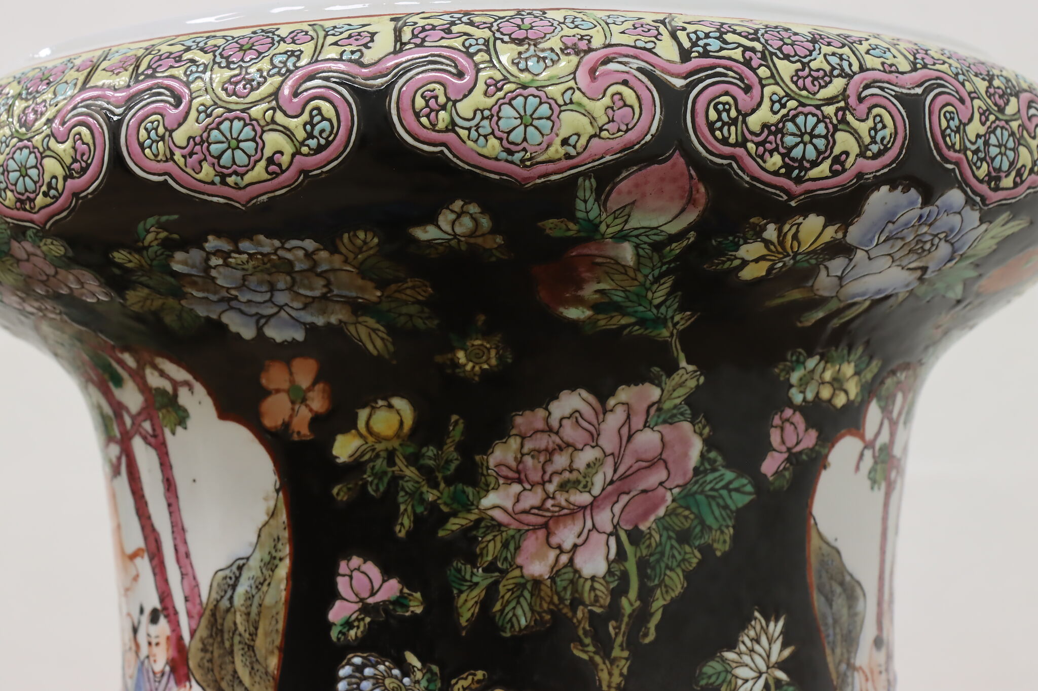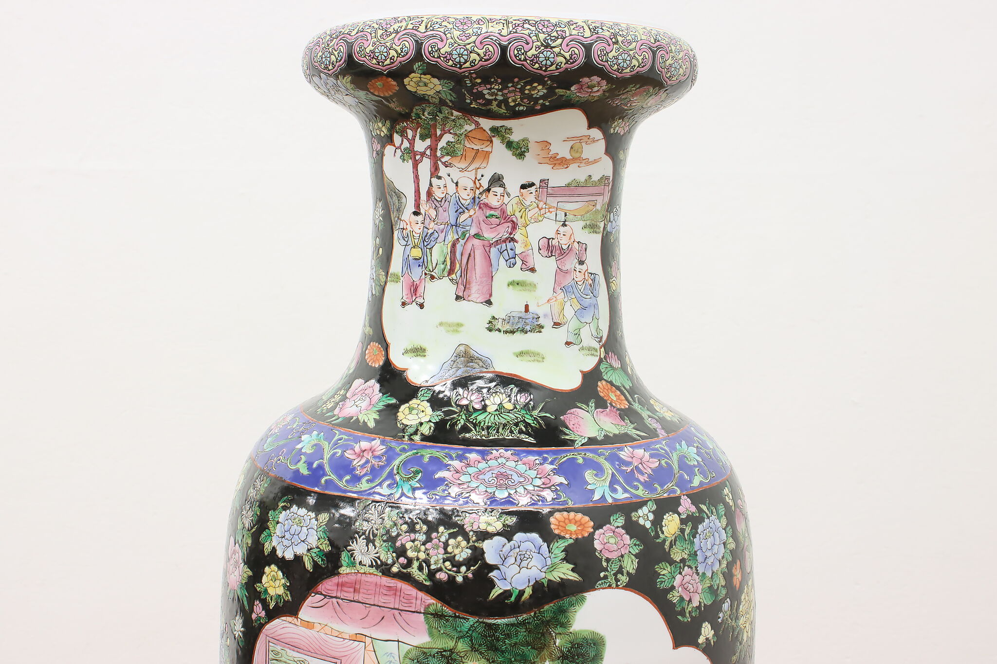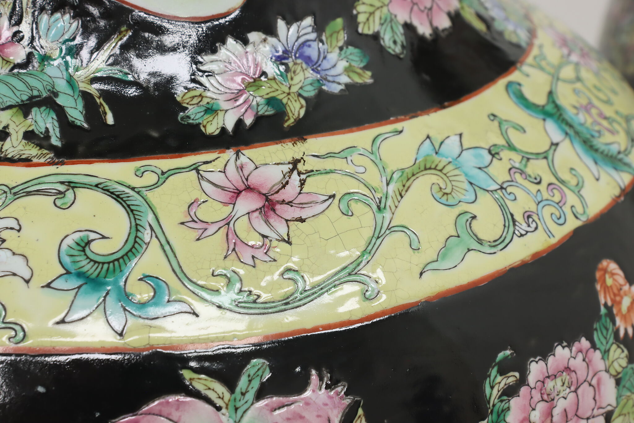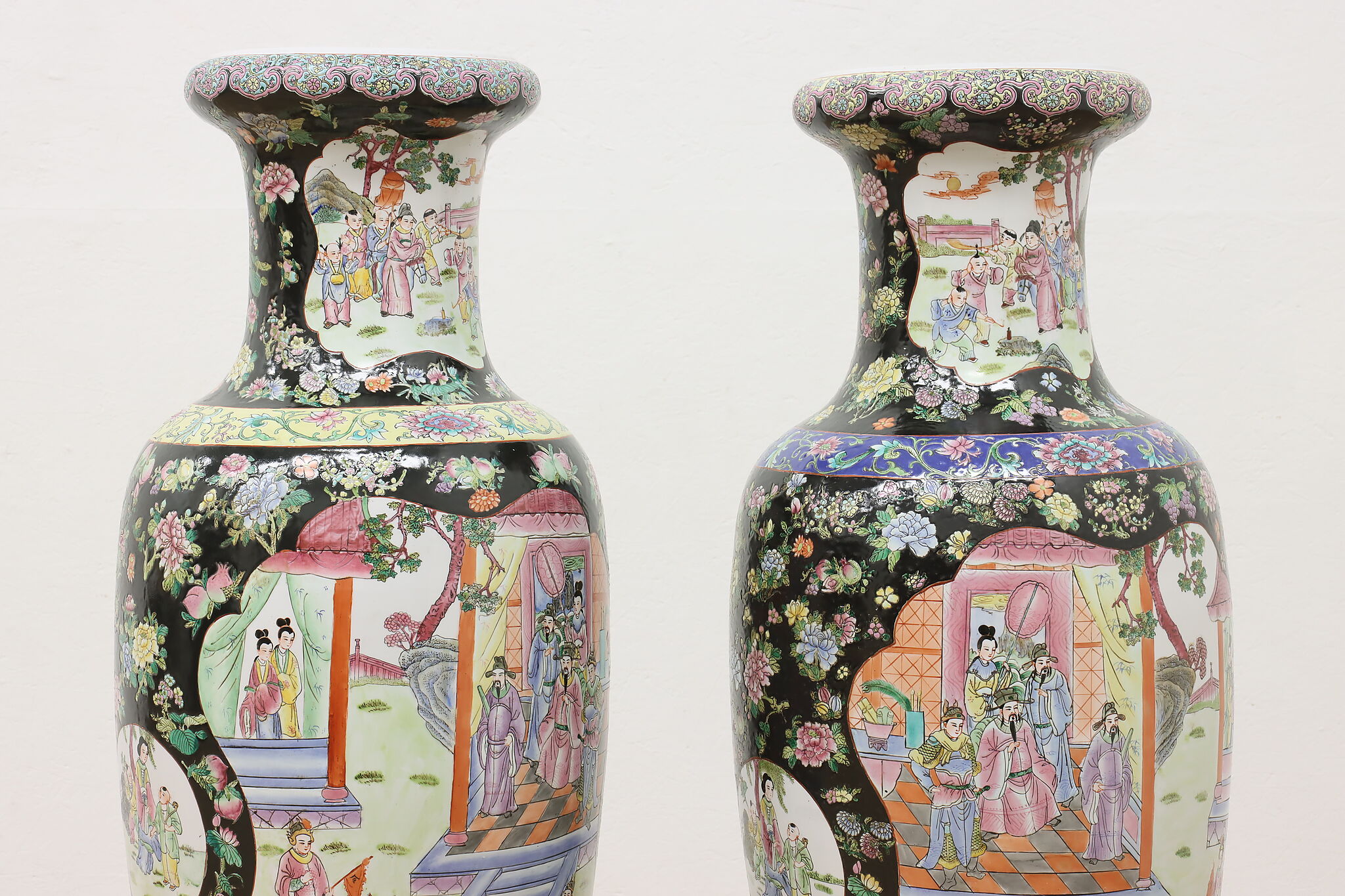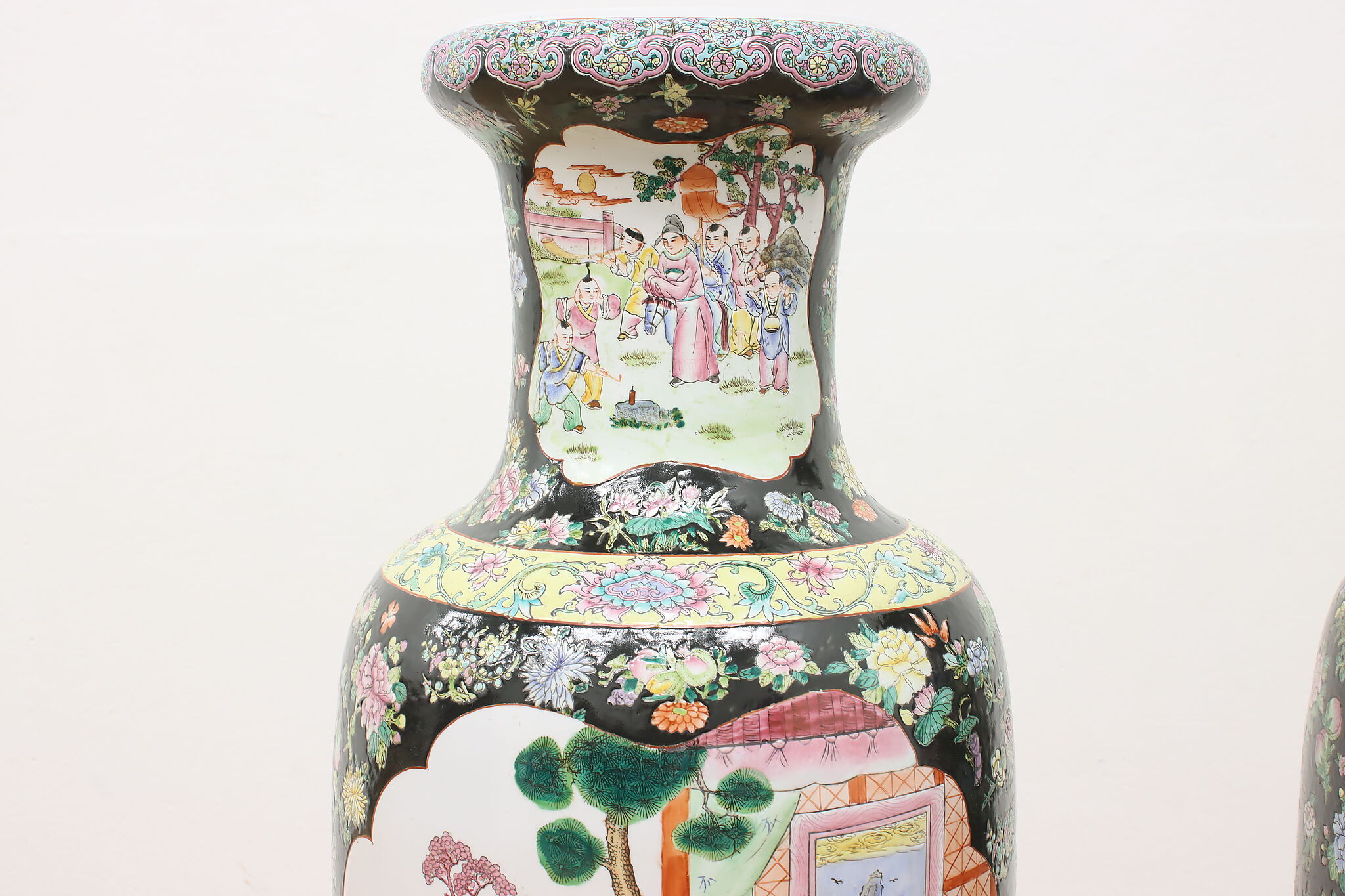 This gorgeous pair of Chinese hand-painted, embossed and glazed decorative porcelain vases with carved stands would be beautiful in an entryway or library.