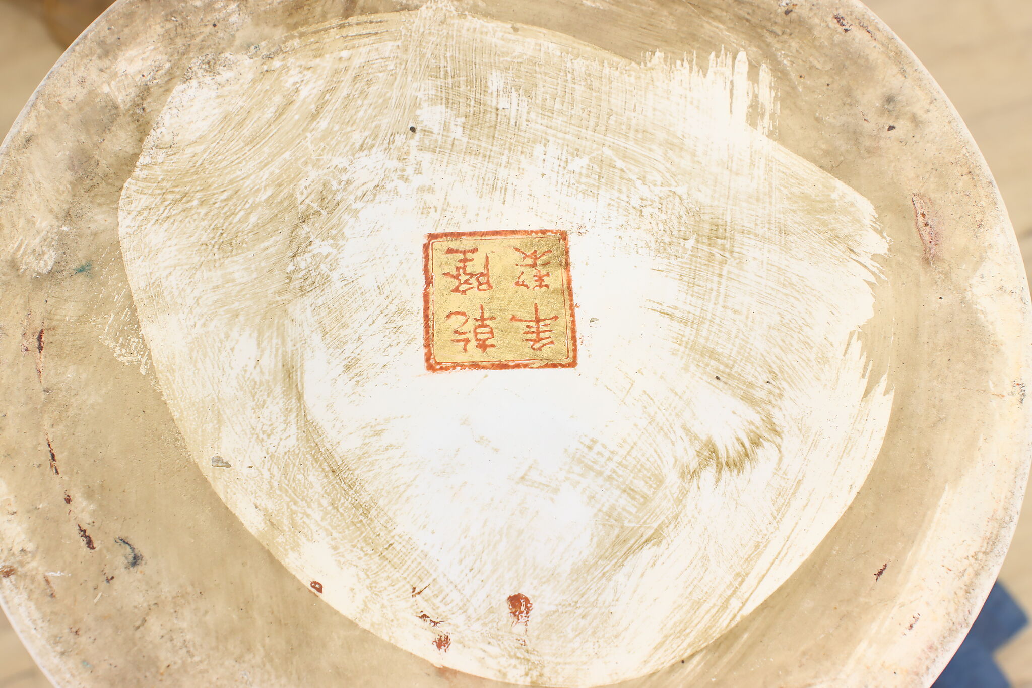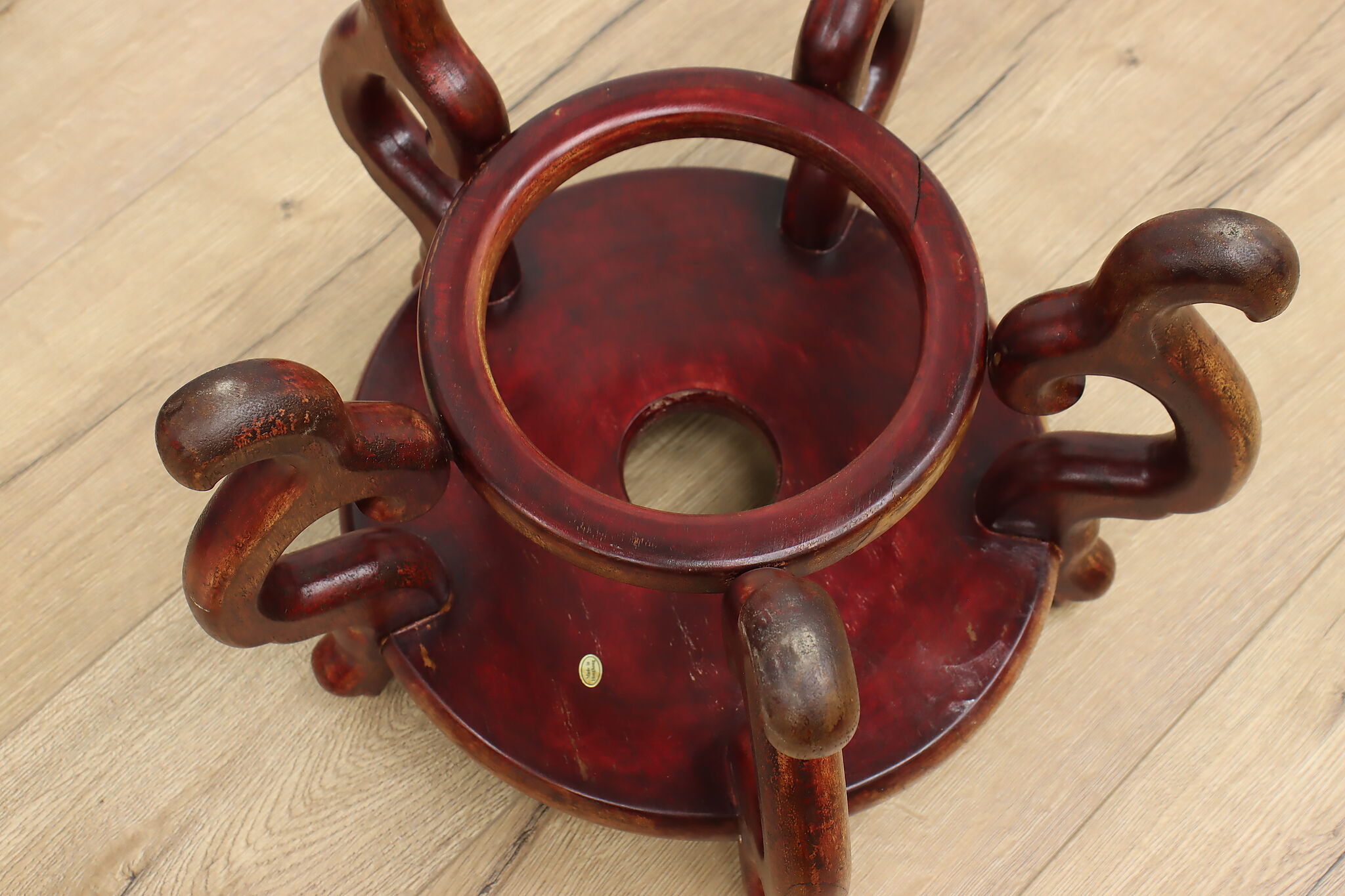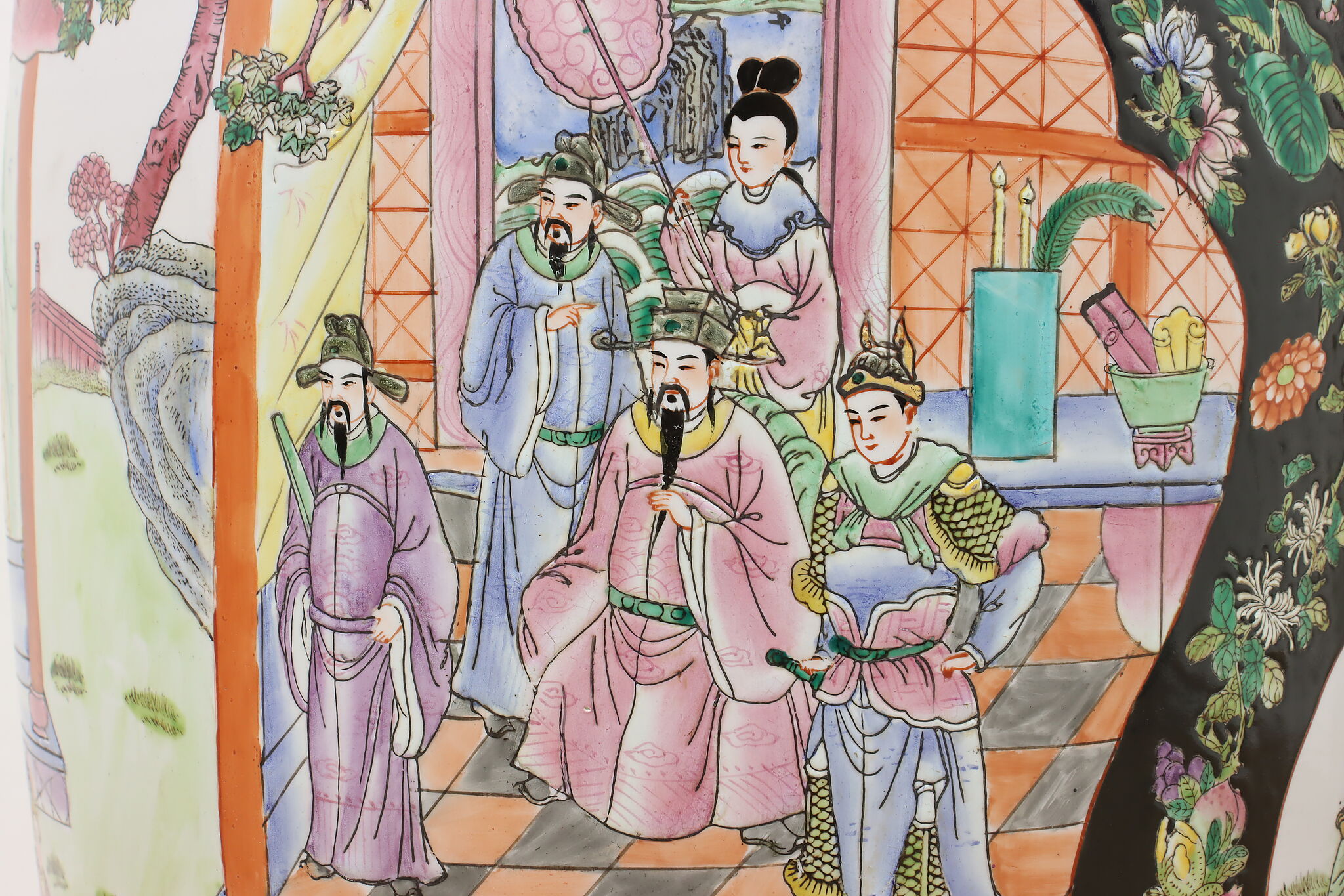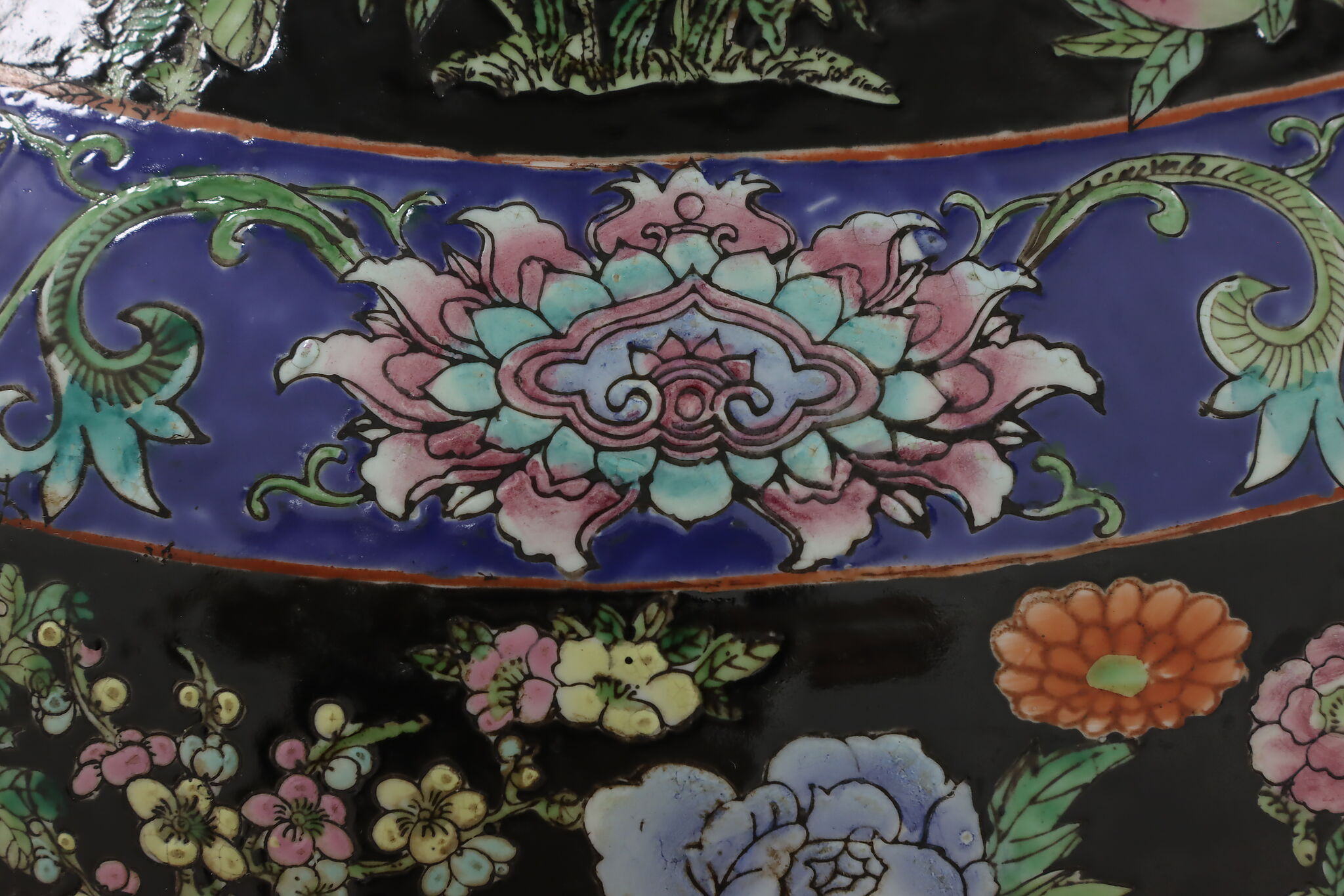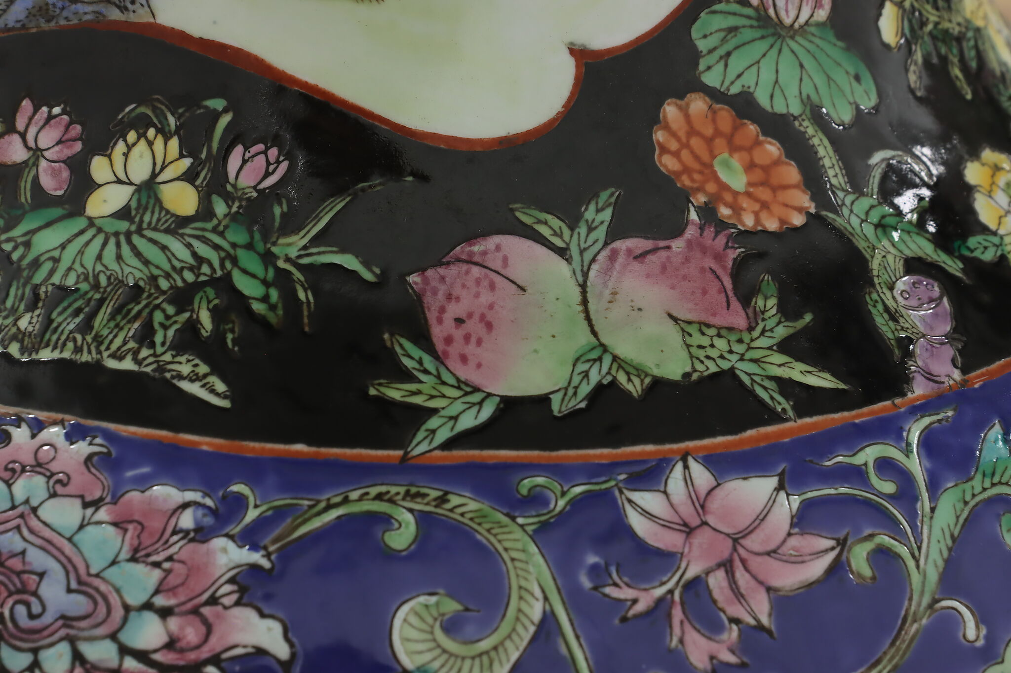 This gorgeous pair of Chinese hand-painted, embossed and glazed decorative porcelain vases with carved stands would be beautiful in an entryway or library.