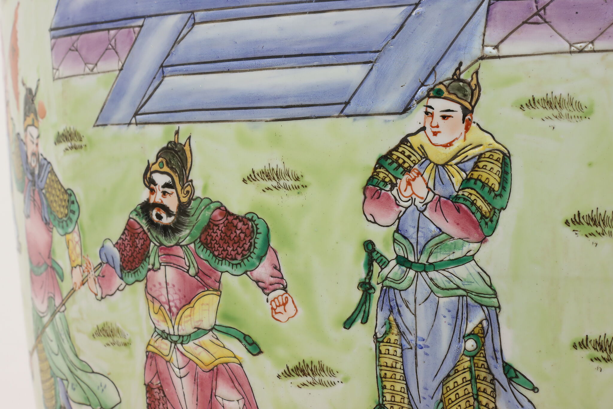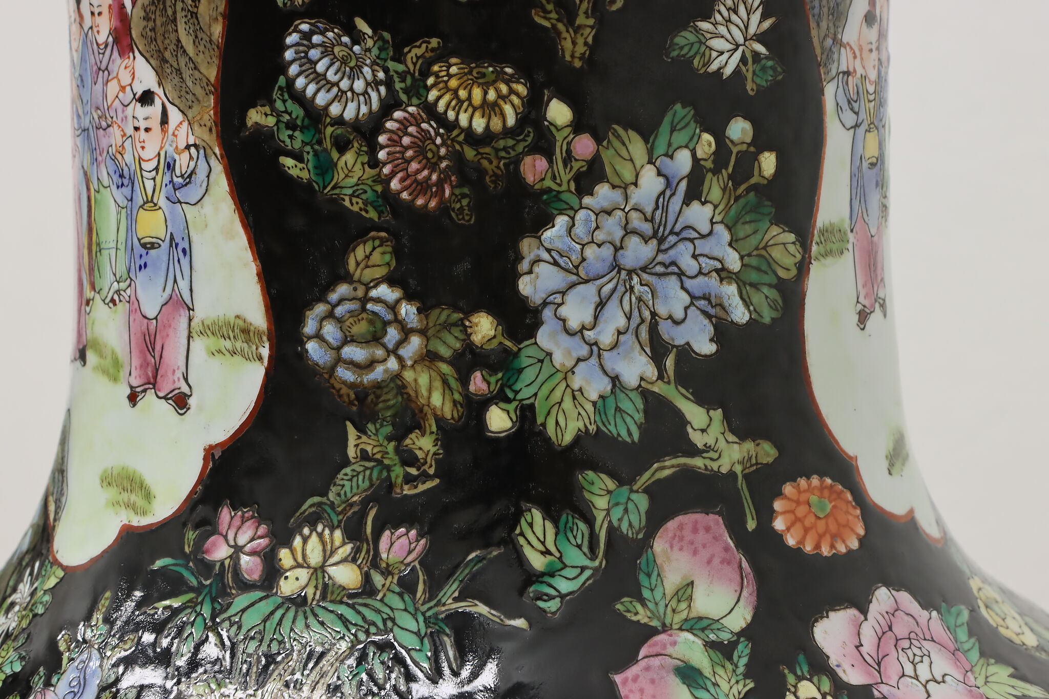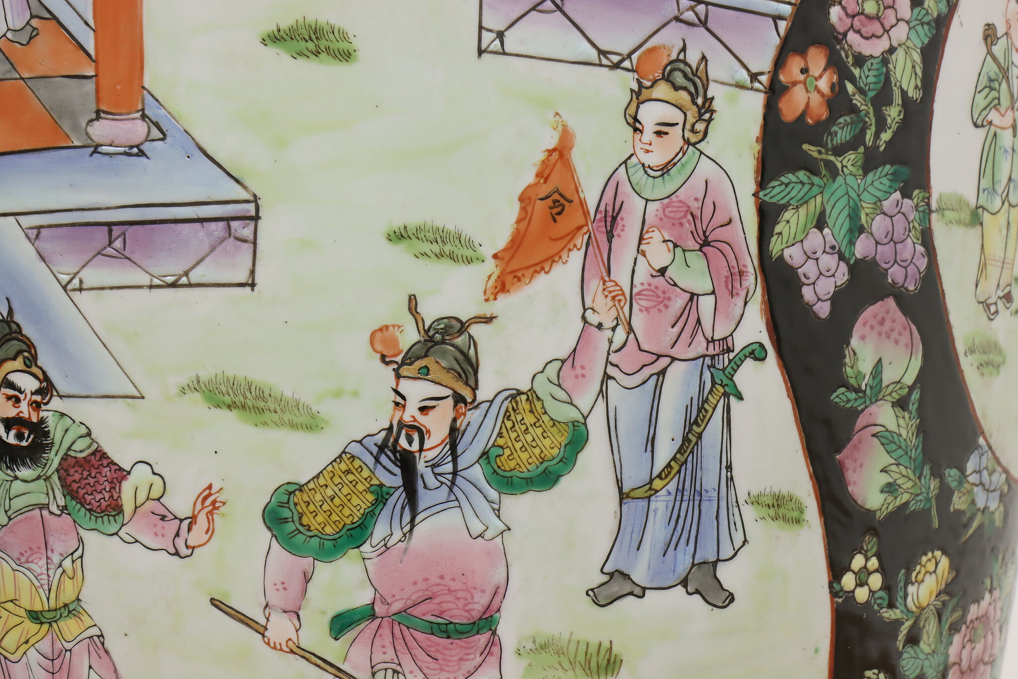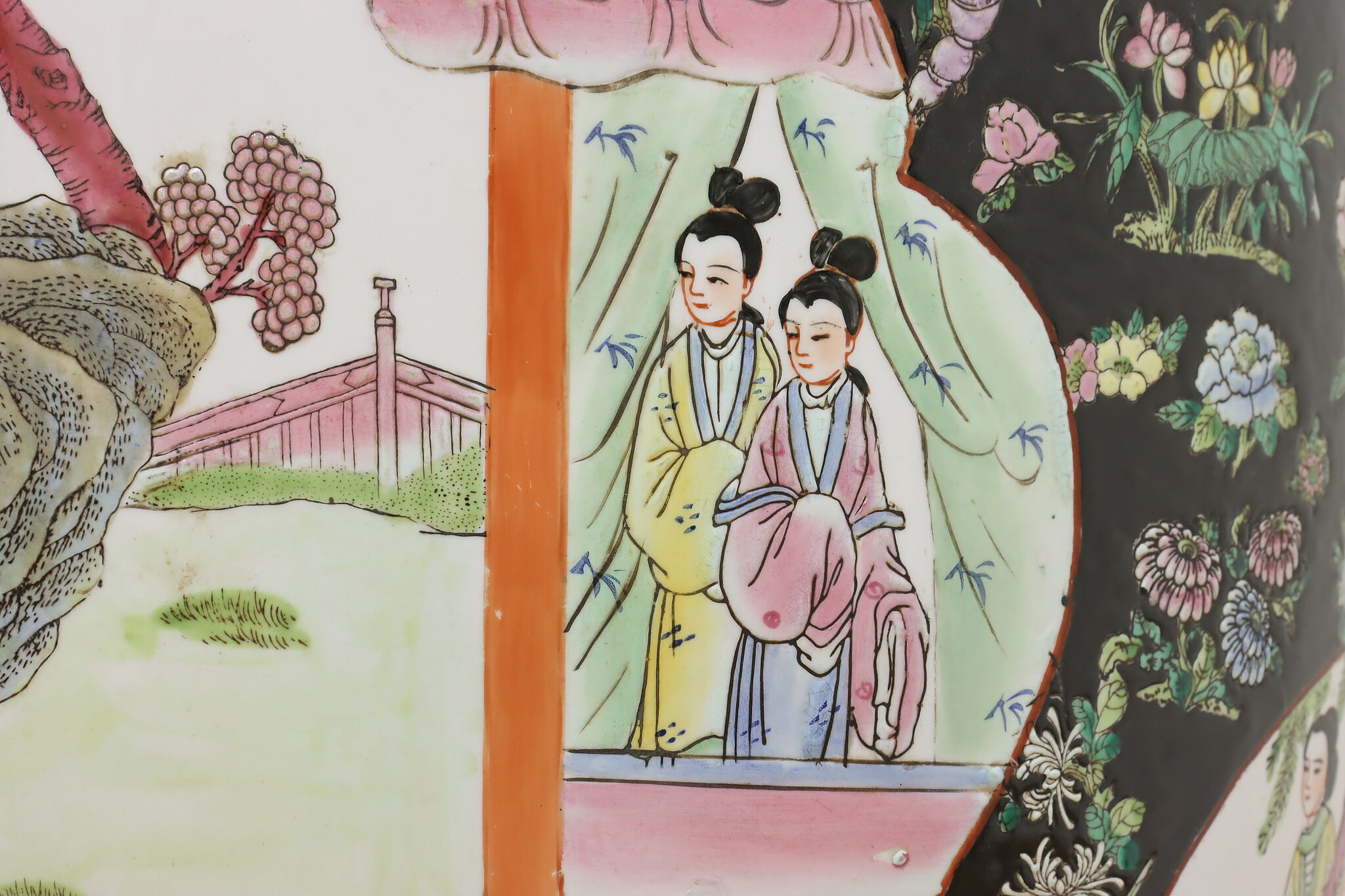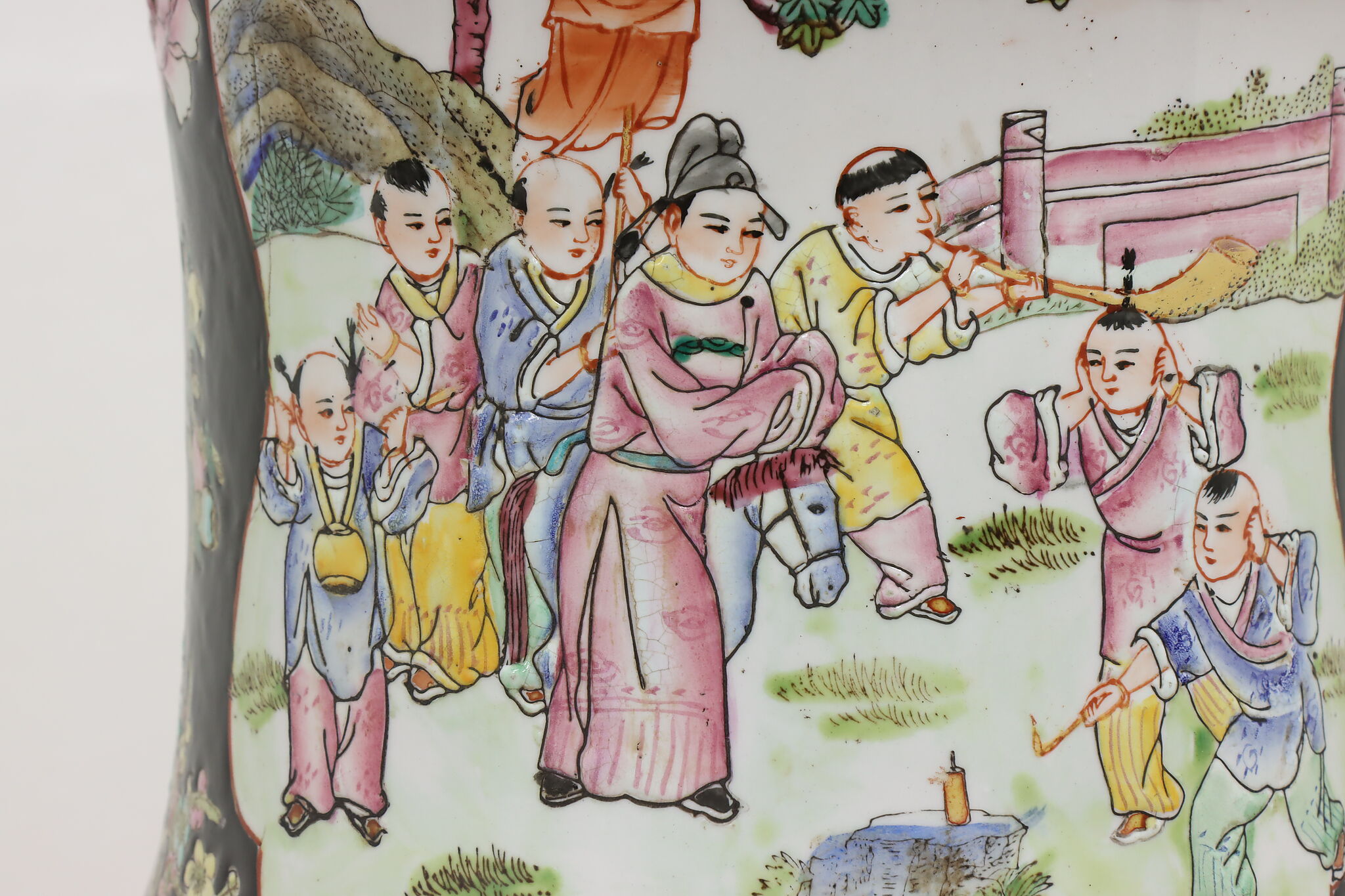 This gorgeous pair of Chinese hand-painted, embossed and glazed decorative porcelain vases with carved stands would be beautiful in an entryway or library.