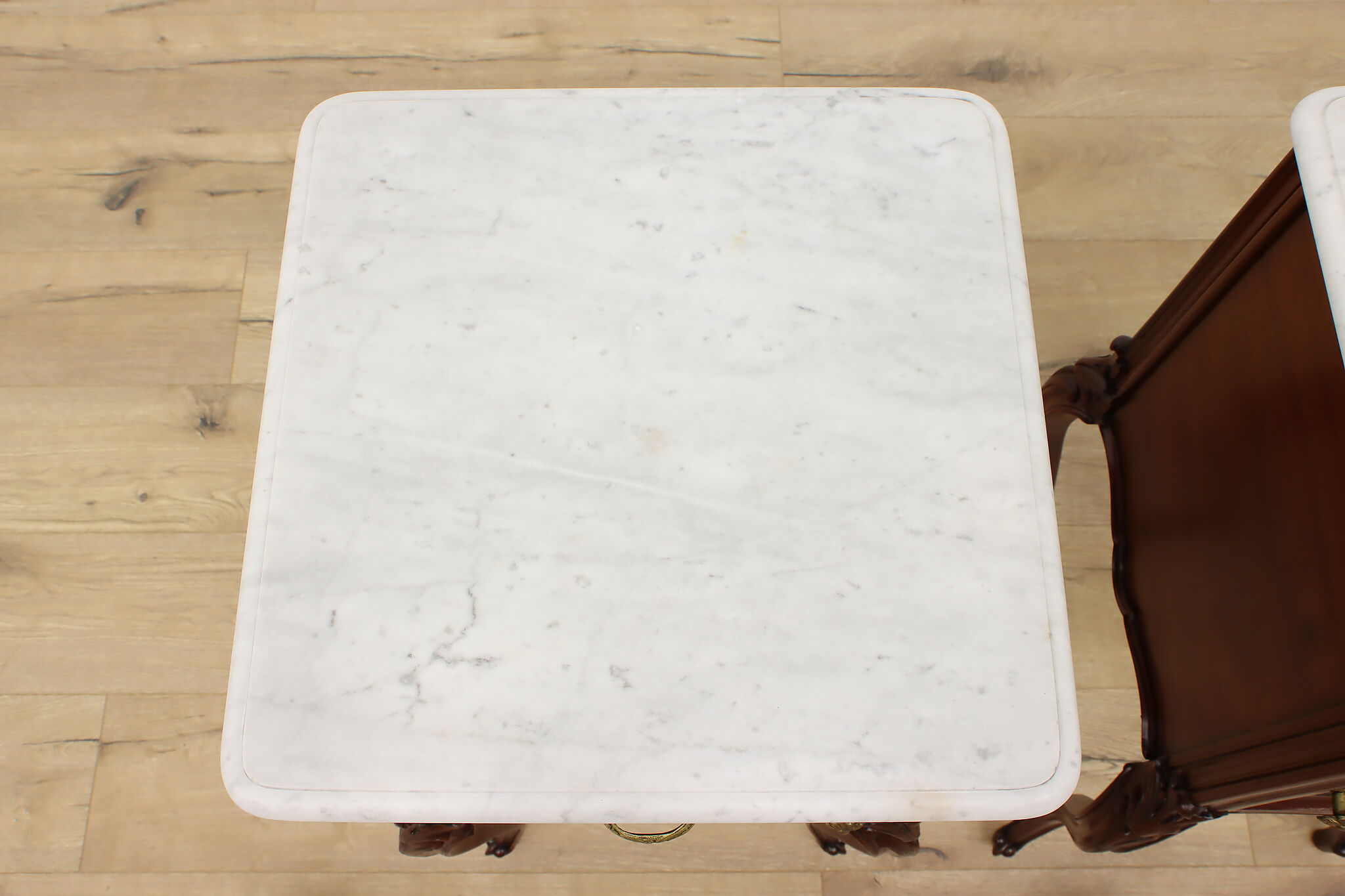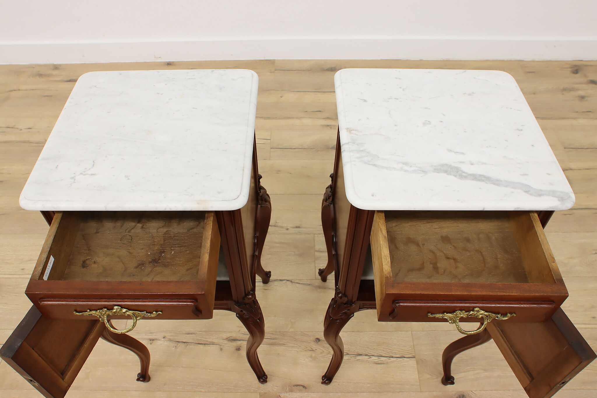 A pair of French nightstands, end, or side tables have beautiful white marble tops.