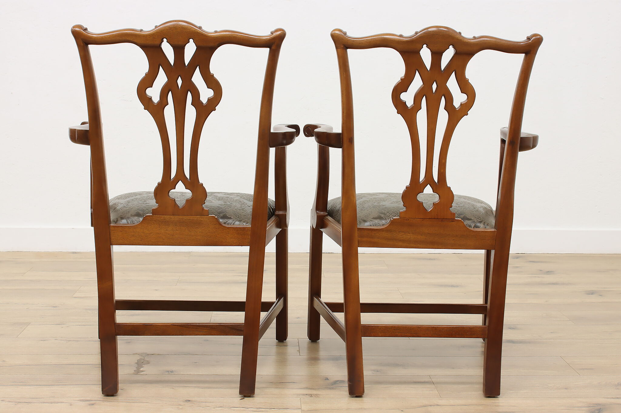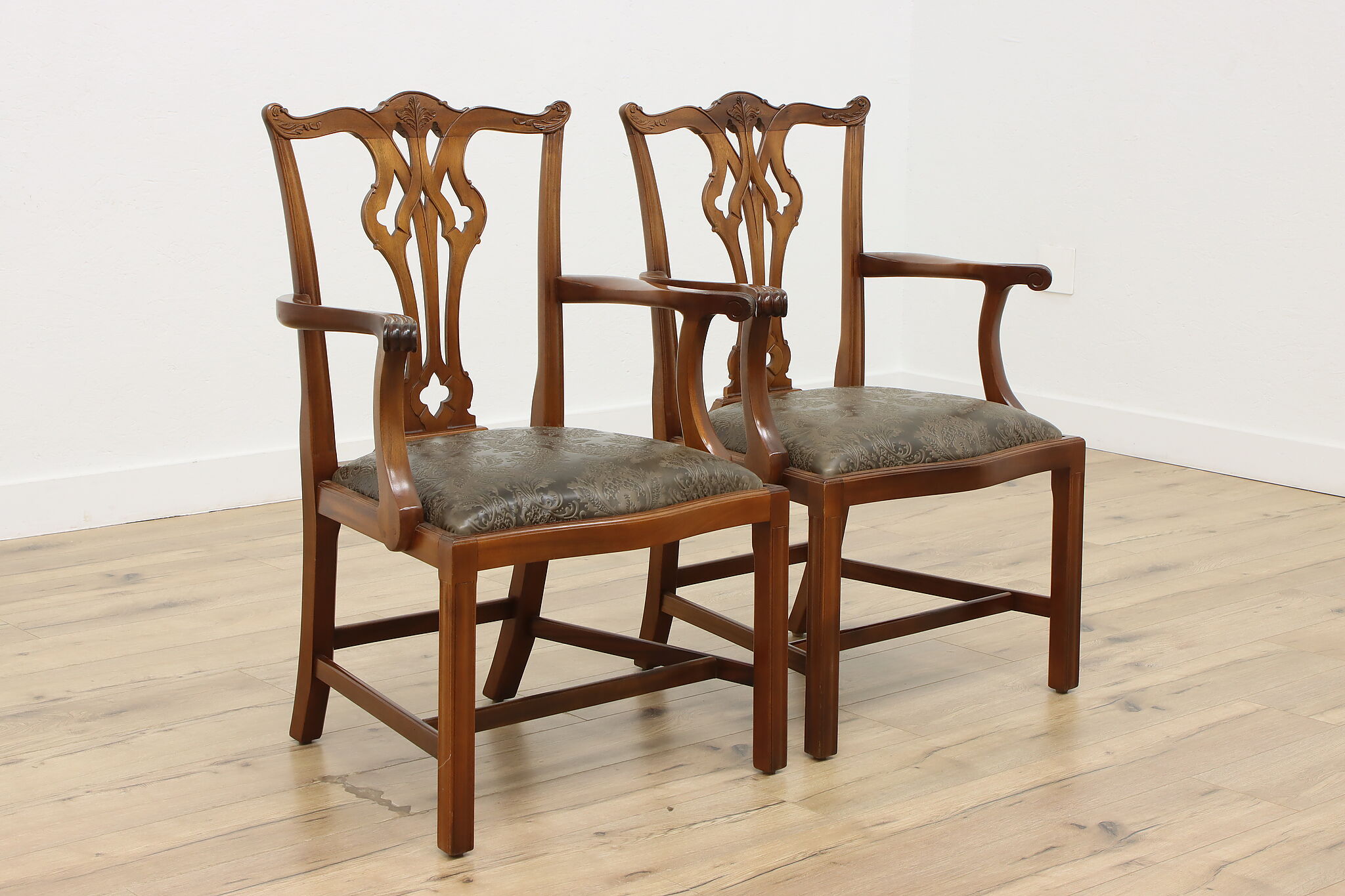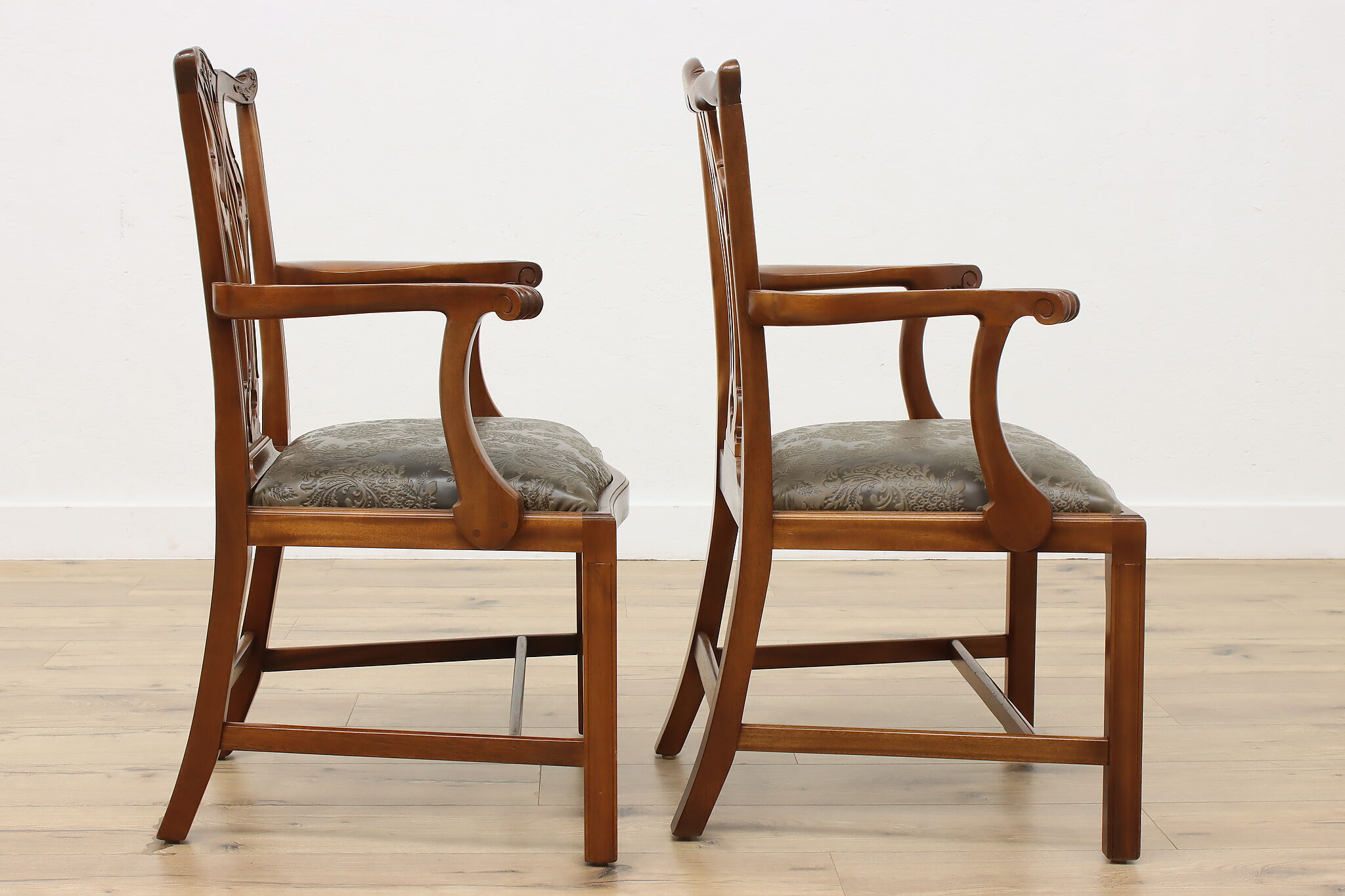 This pair of Georgian design armchairs could be placed on the sides of a console, office, or dining table.