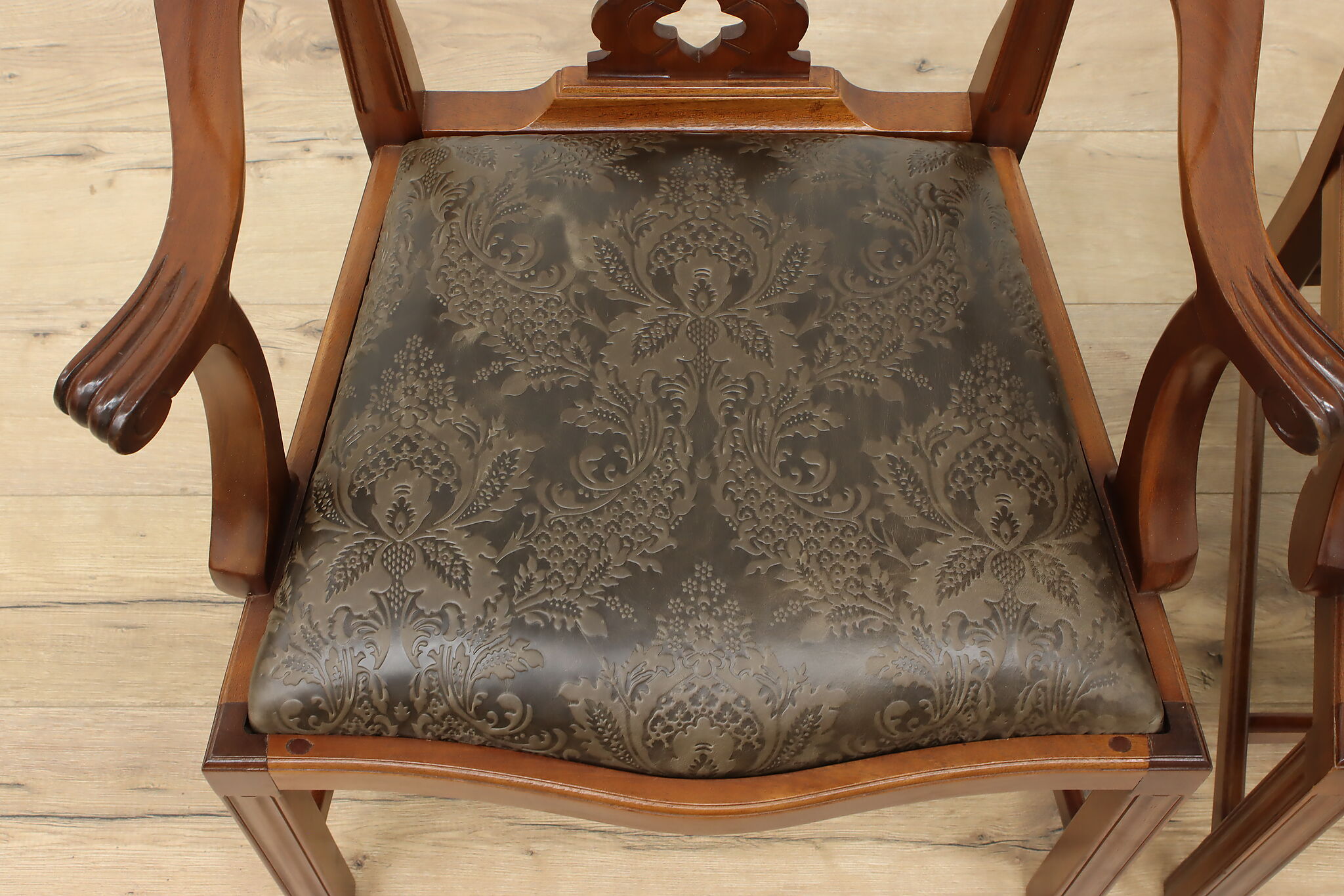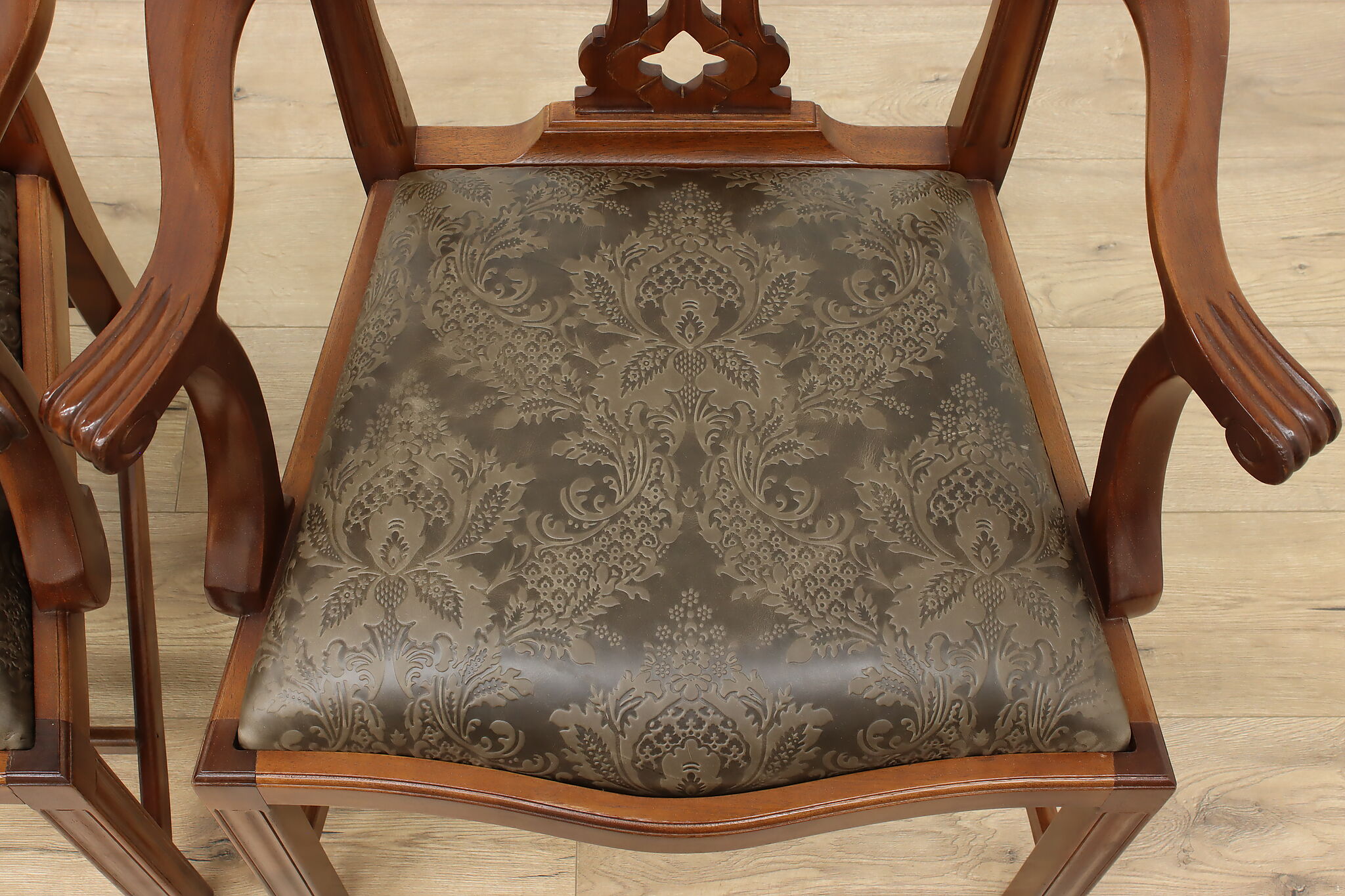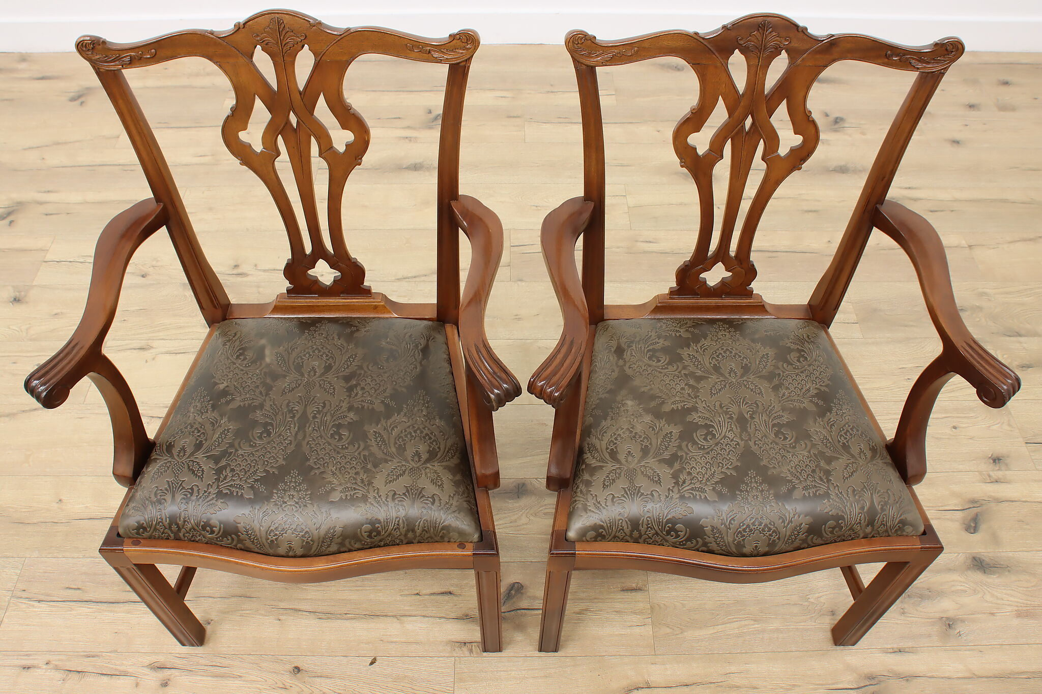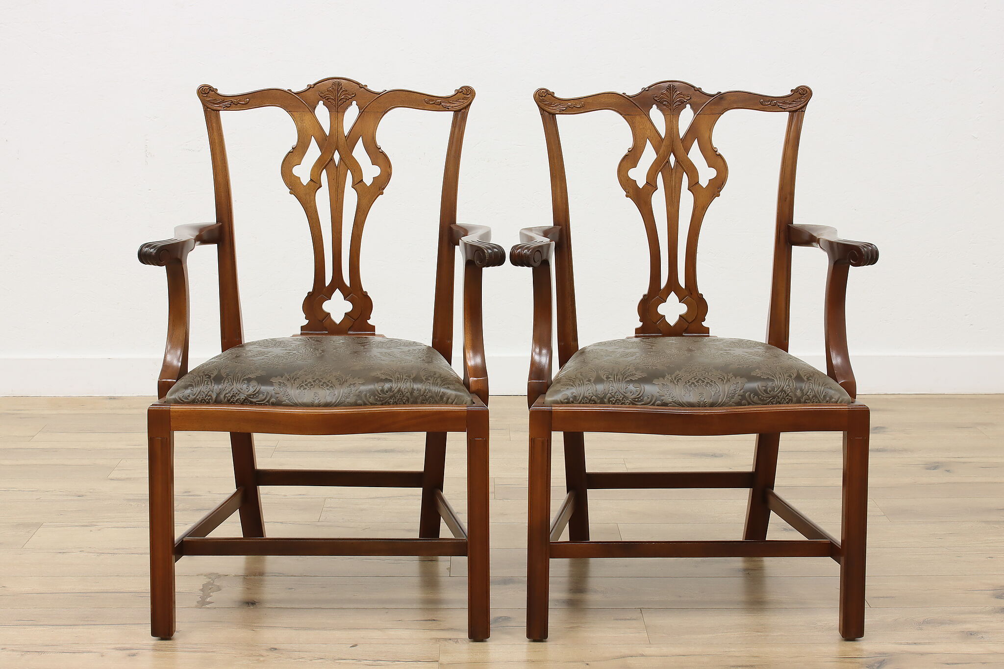 This pair of Georgian design armchairs could be placed on the sides of a console, office, or dining table.
