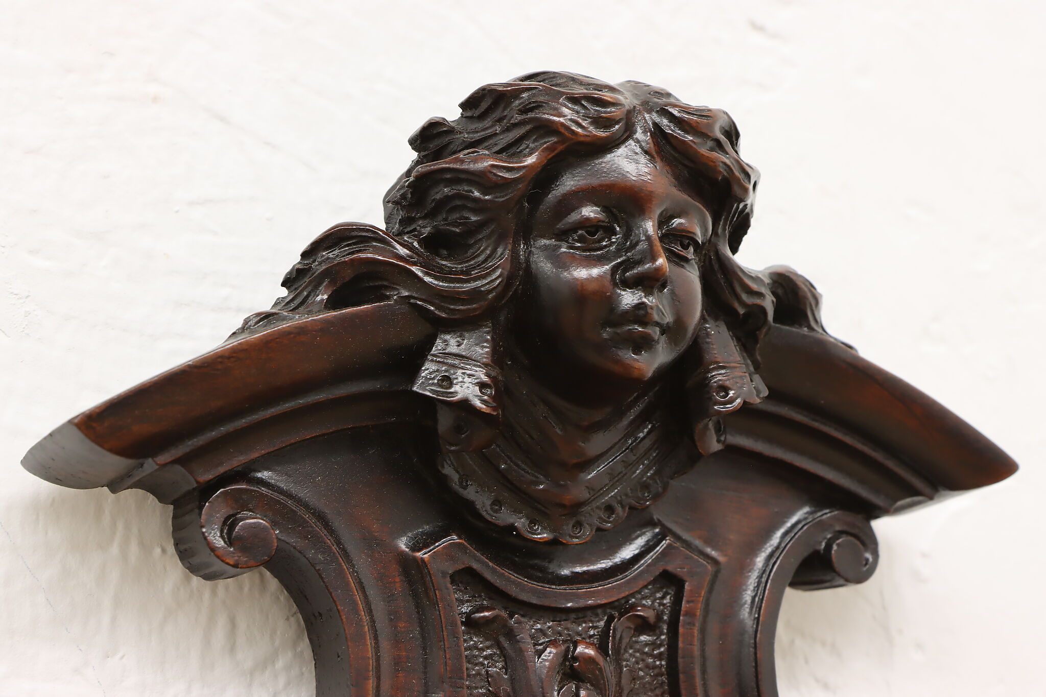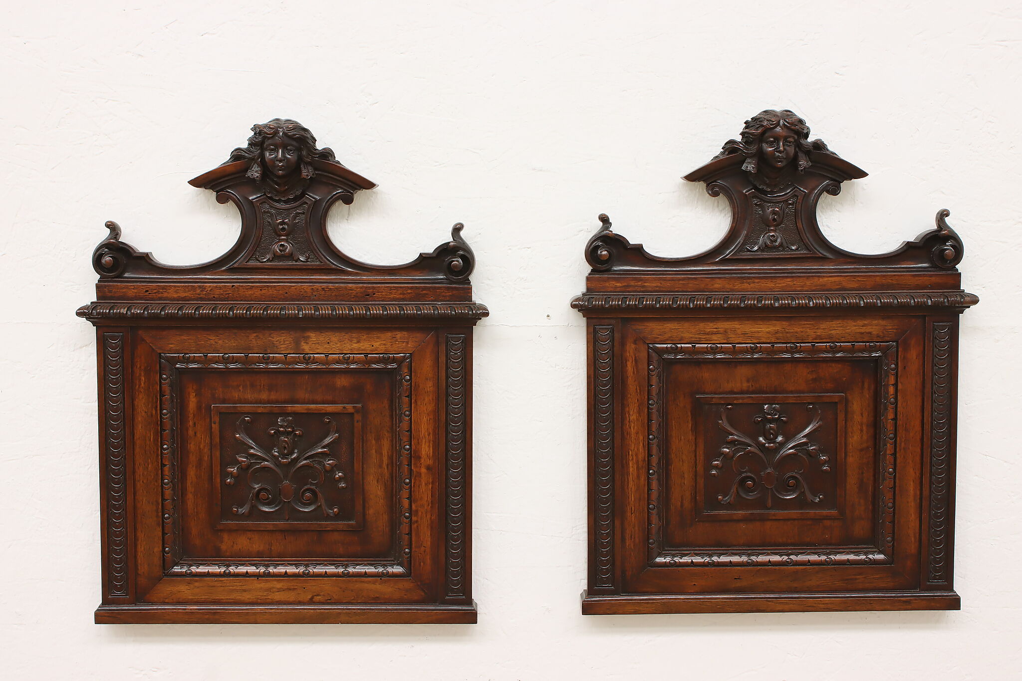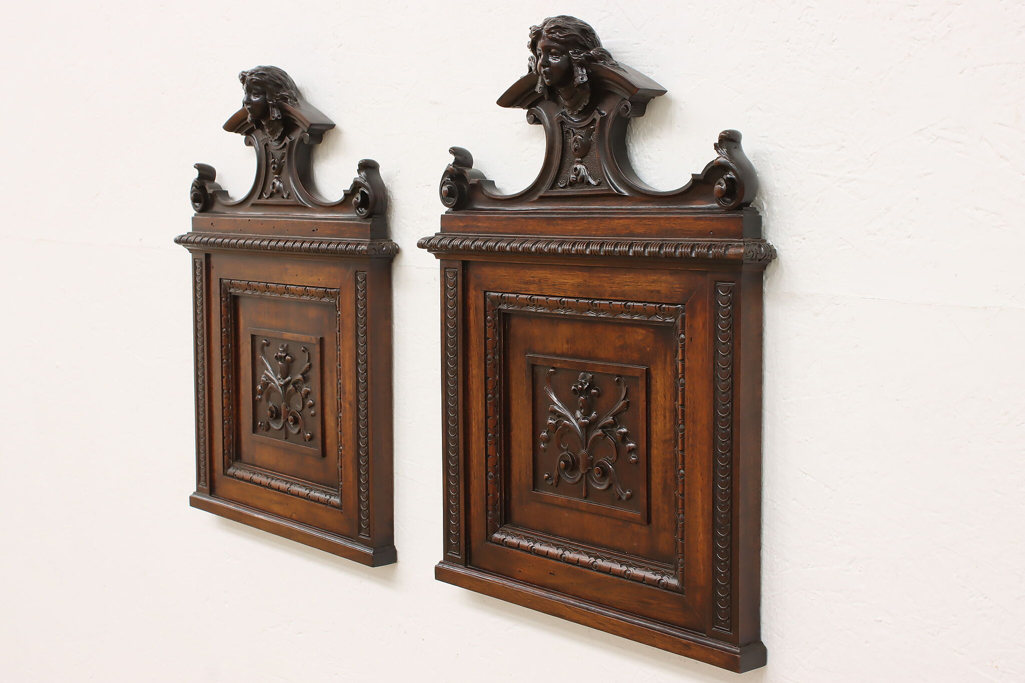 This pair of beautifully carved Renaissance design wall crests have carved women busts, perhaps of angels!