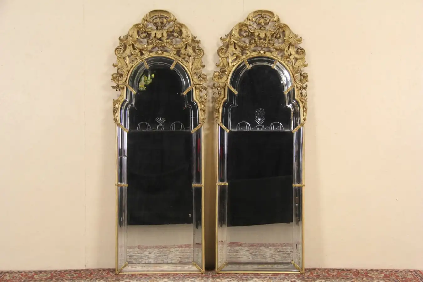 There is diamond wheel cutting to the upper panes of glass mirror, some of the silvering has losses at the edges. There are several small hairline cracks at the edges, see photos. Antique "smoke" and slight waviness shows the age of the early thick plate glass of this European furniture.