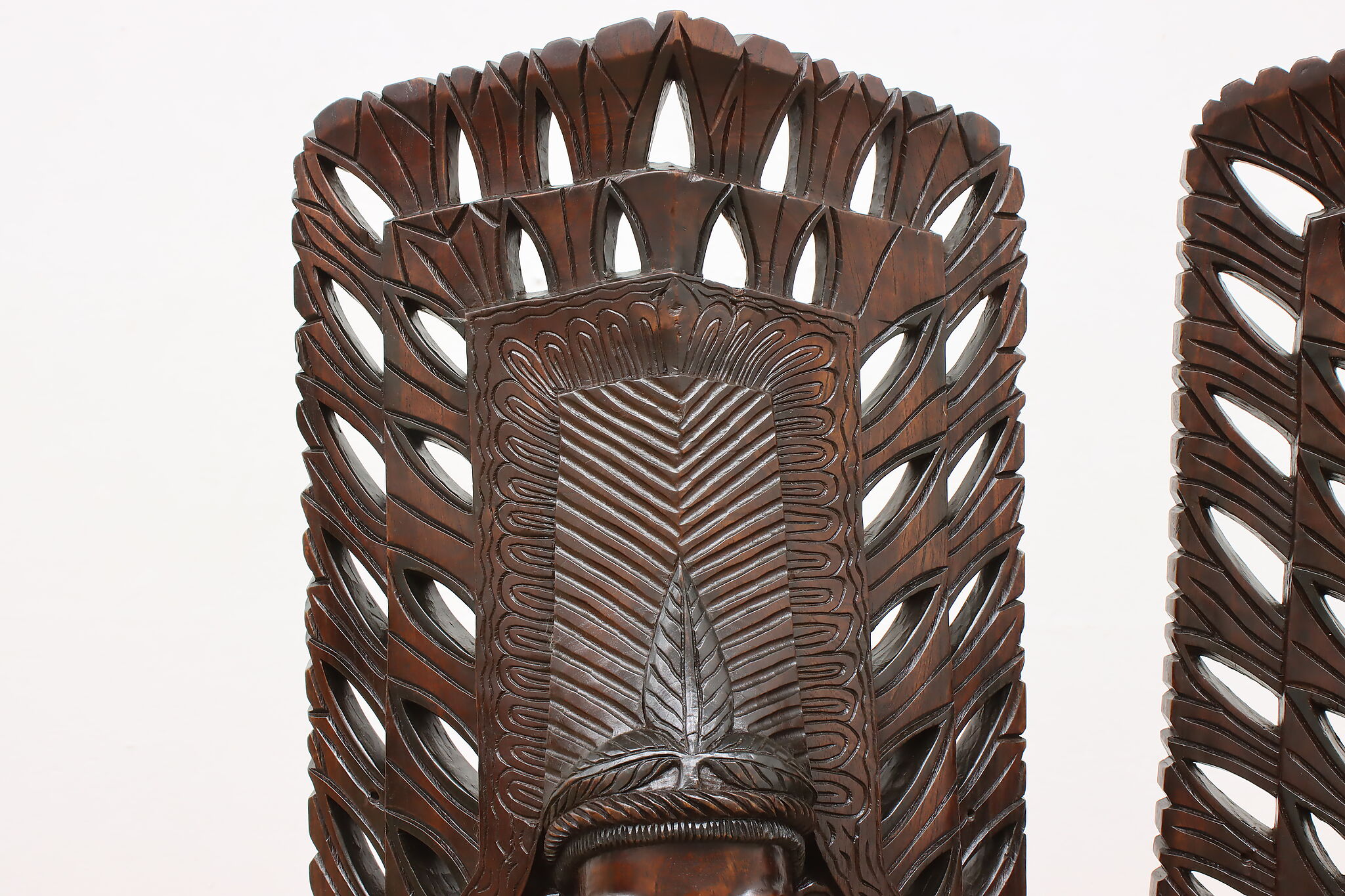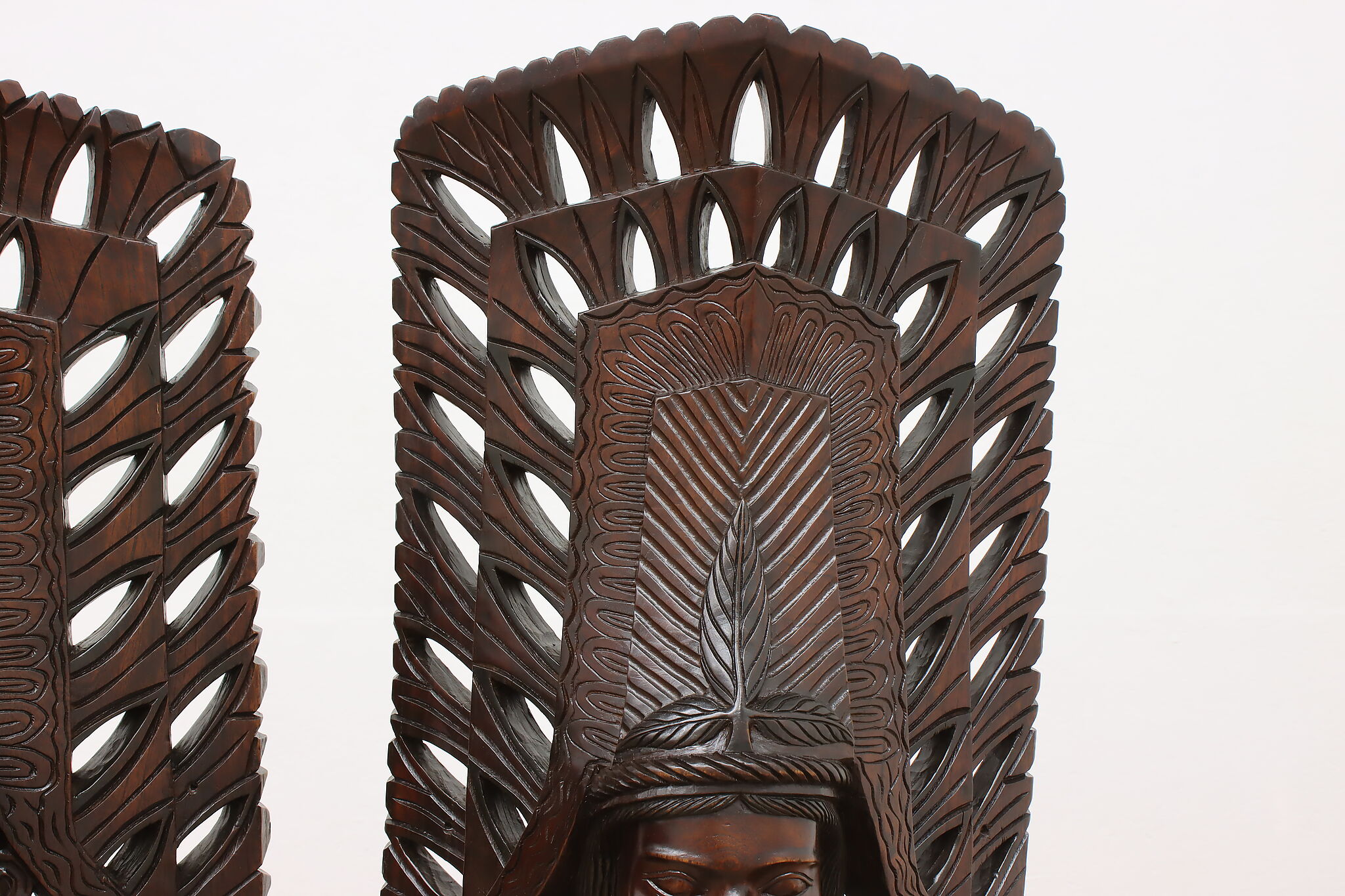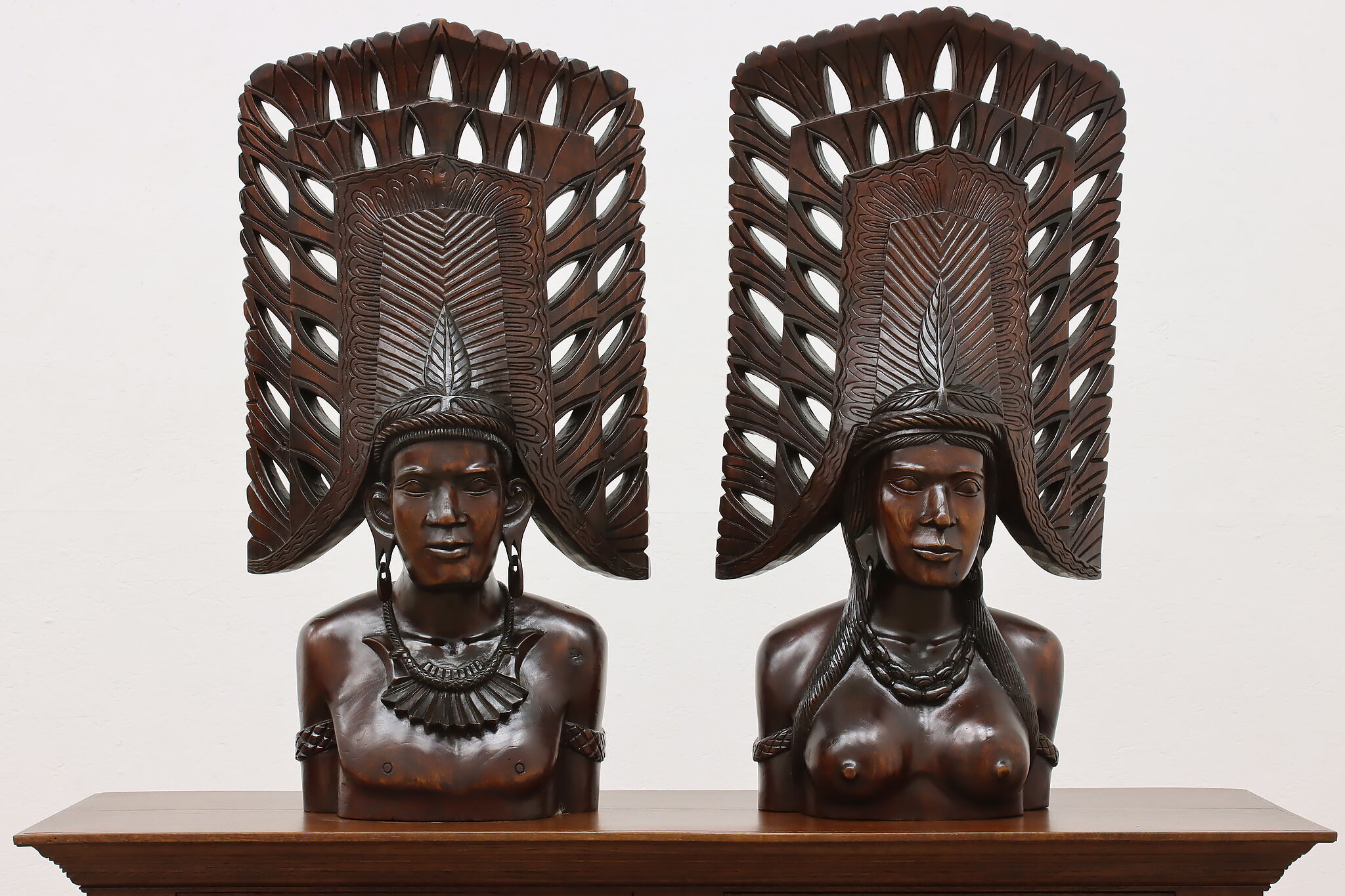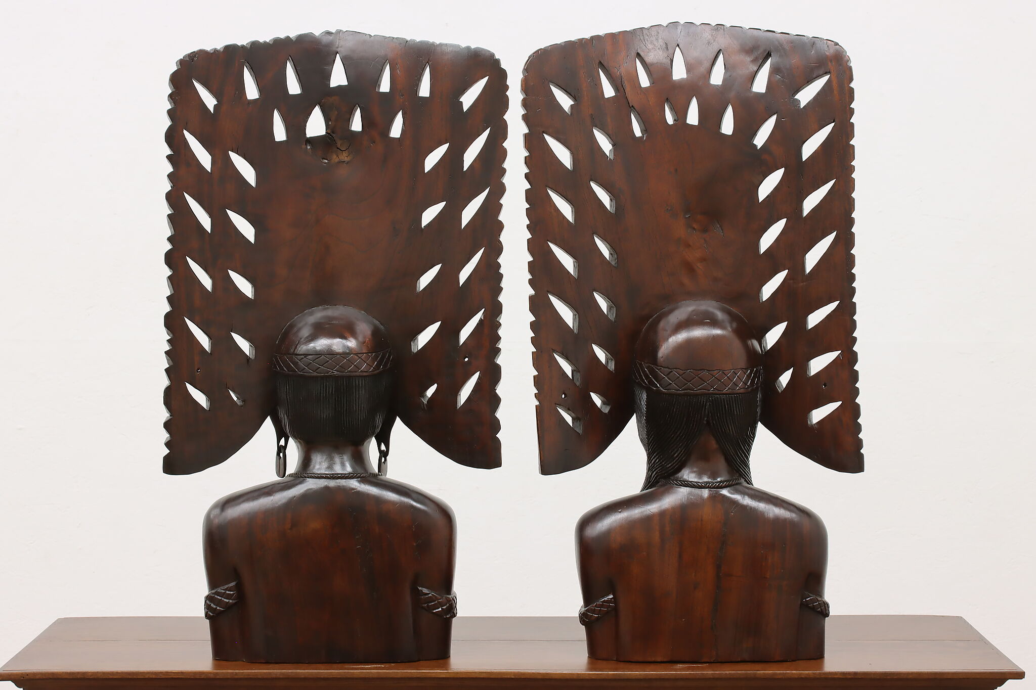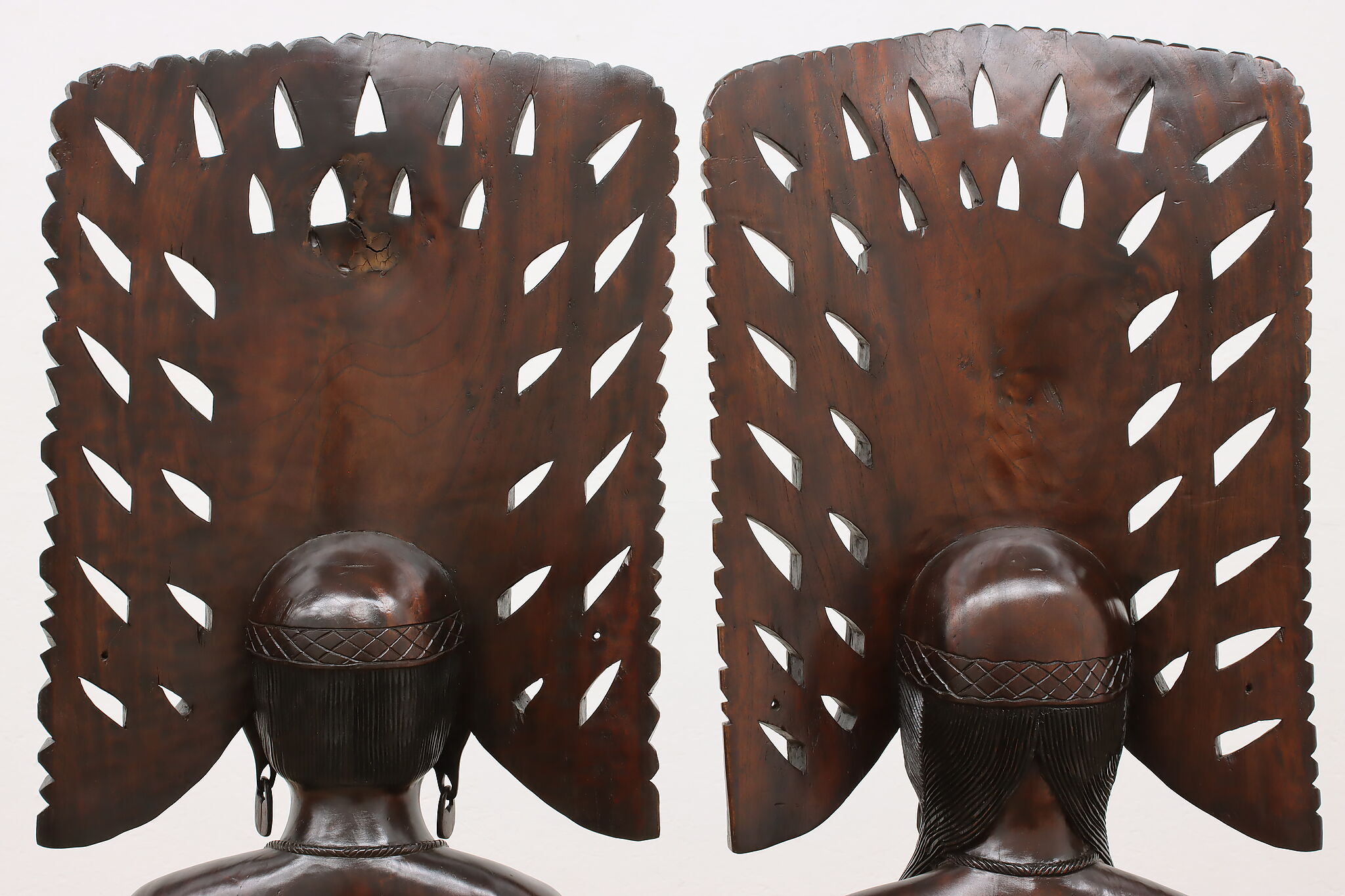 Fantastically carved with beautiful detailing, this masterful pair of sculptures represent the male and female leaders of a traditional African tribe.