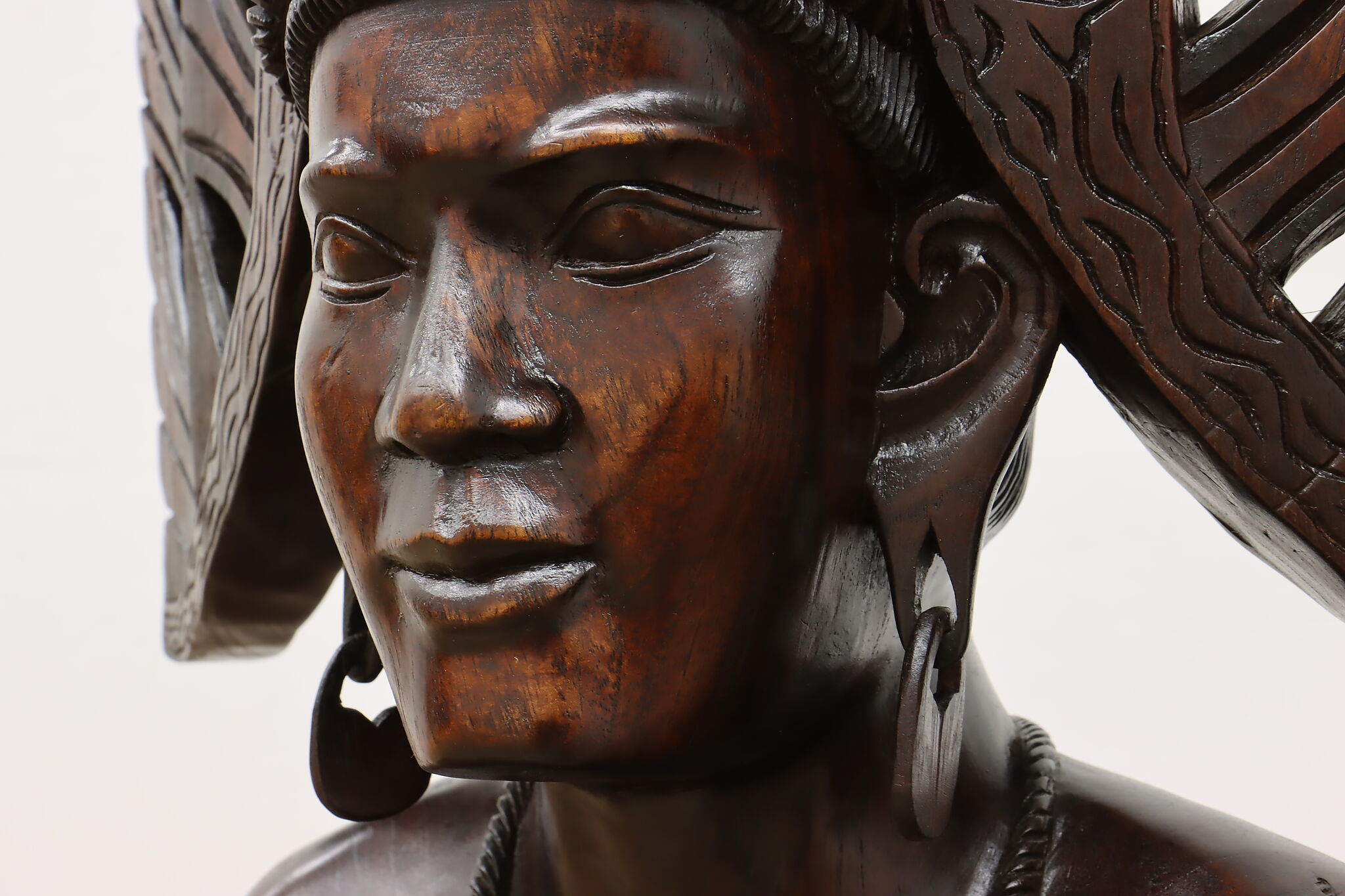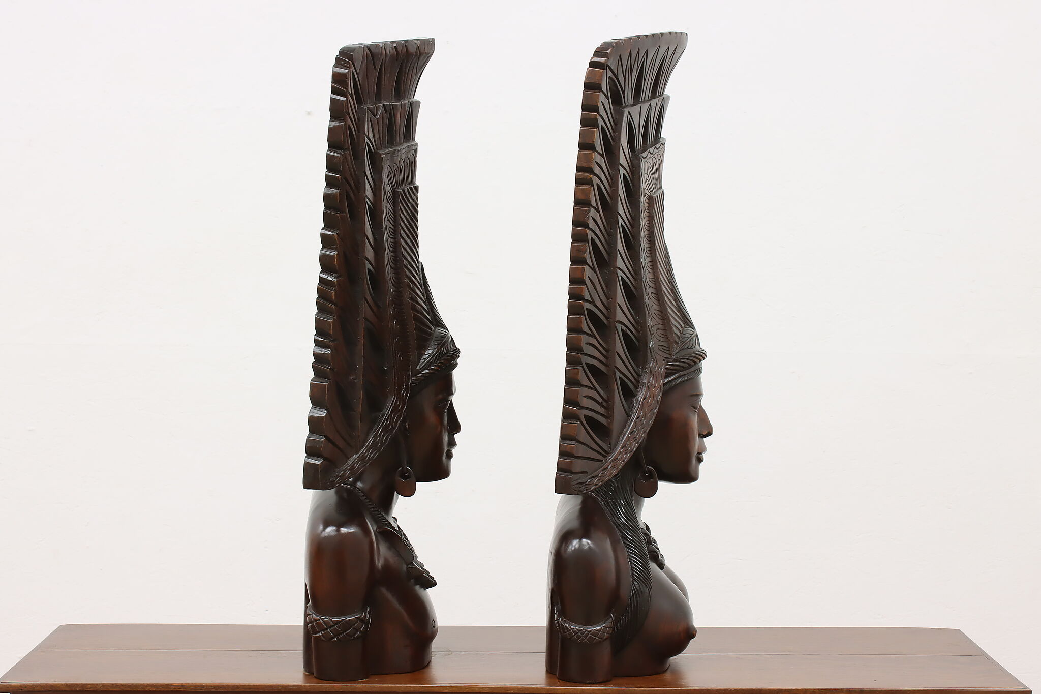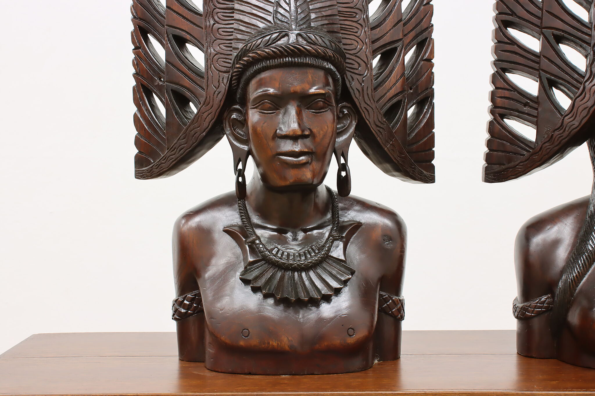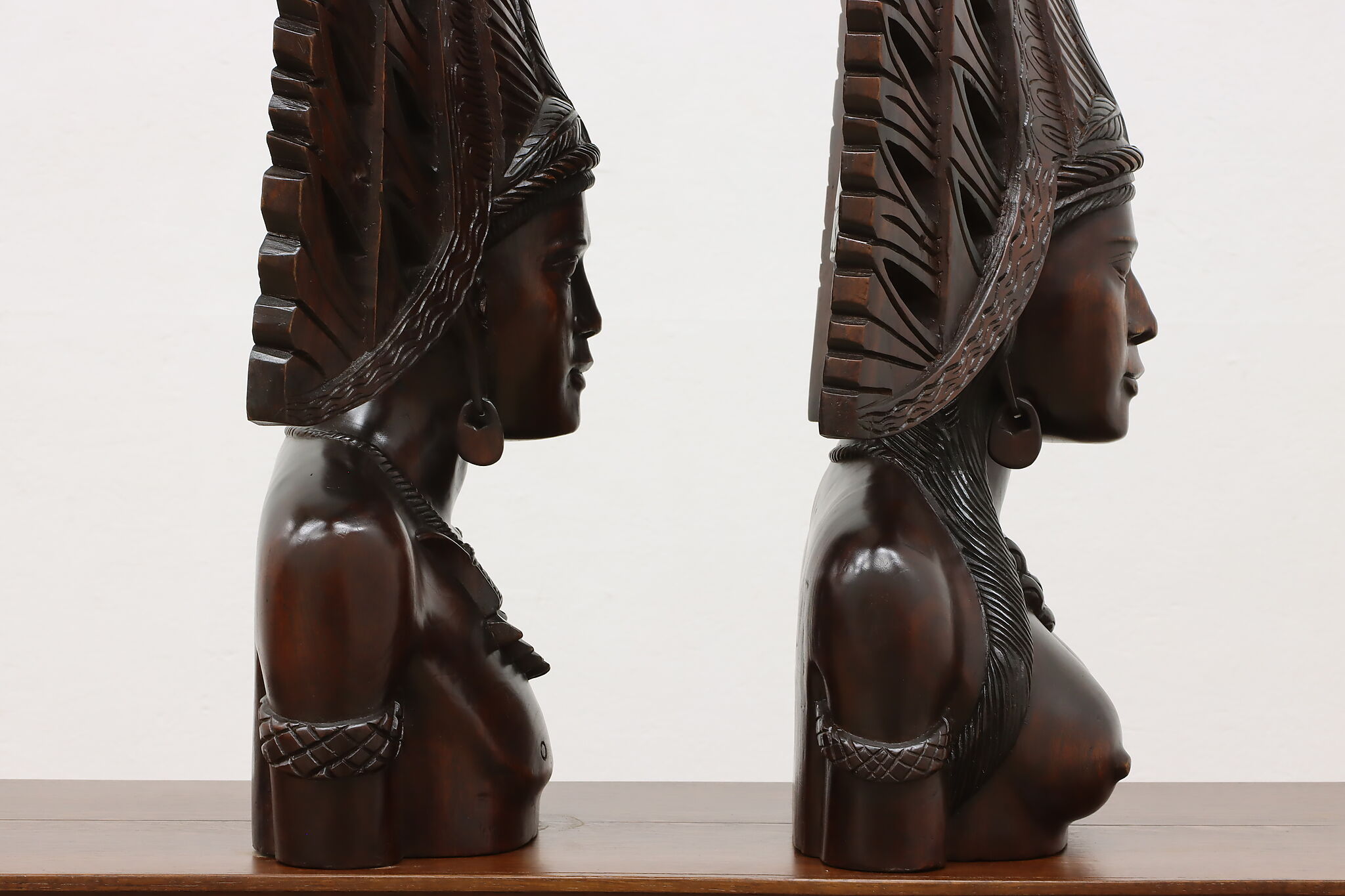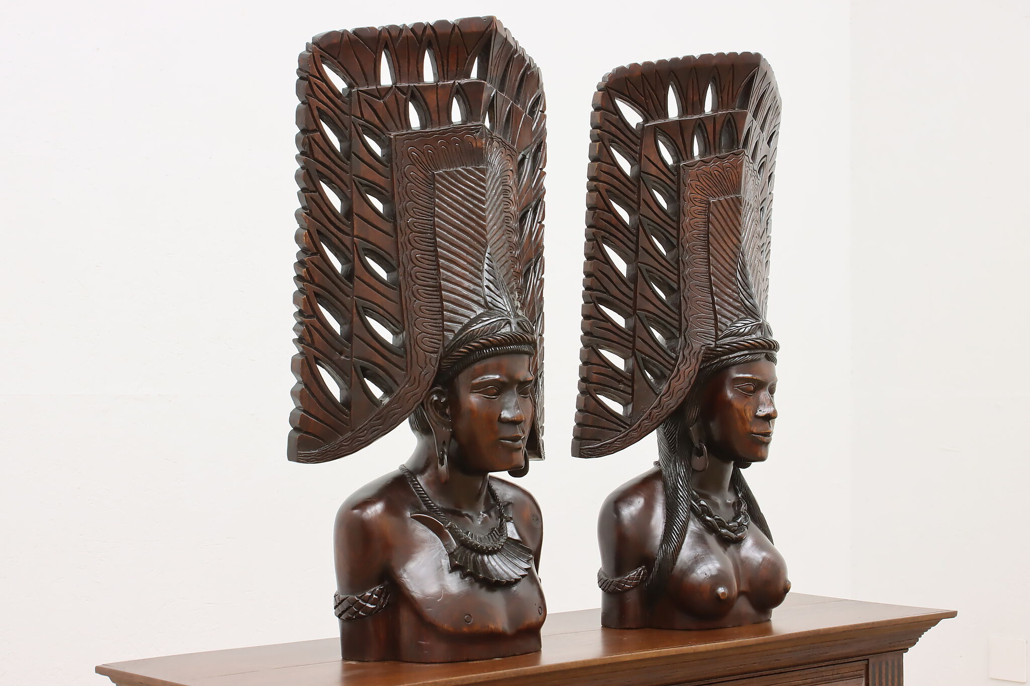 Fantastically carved with beautiful detailing, this masterful pair of sculptures represent the male and female leaders of a traditional African tribe.