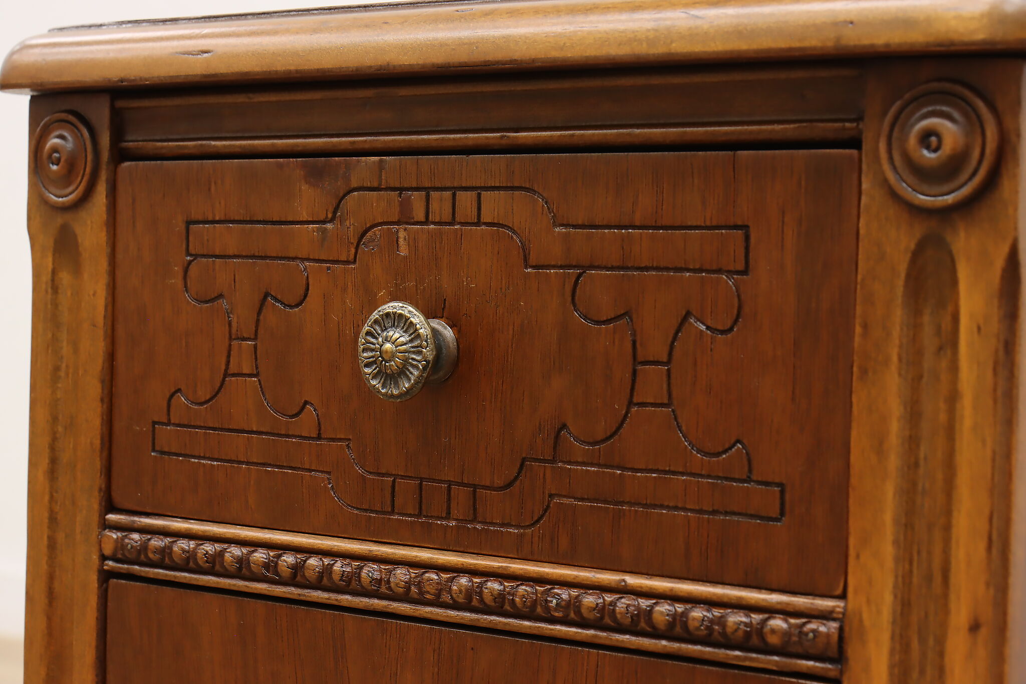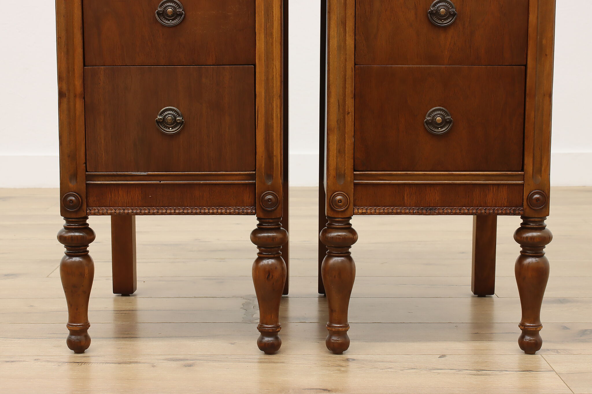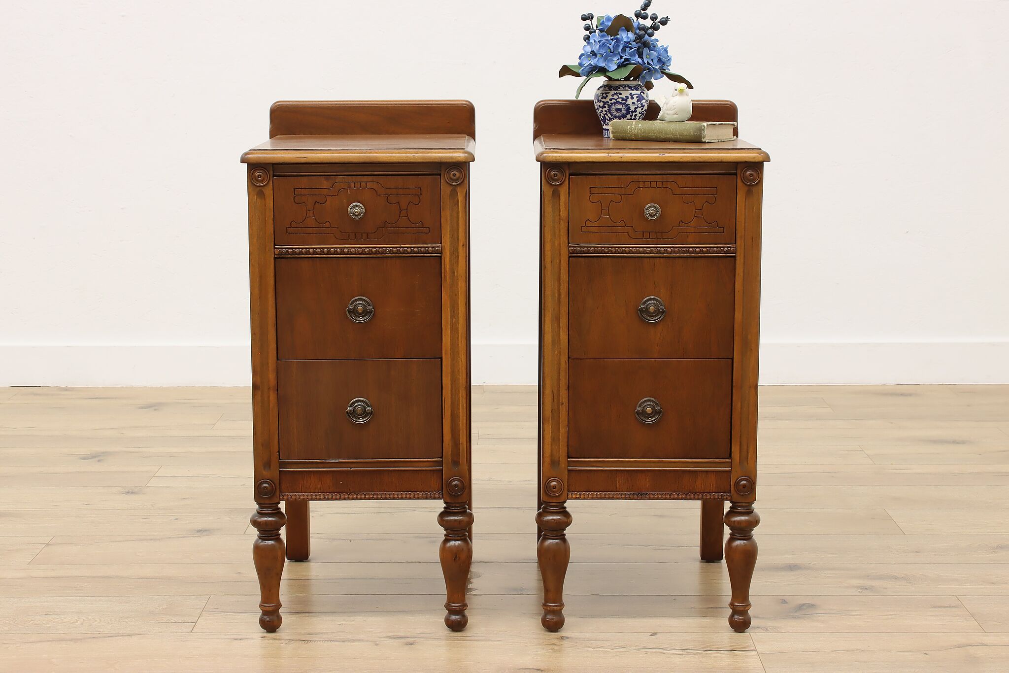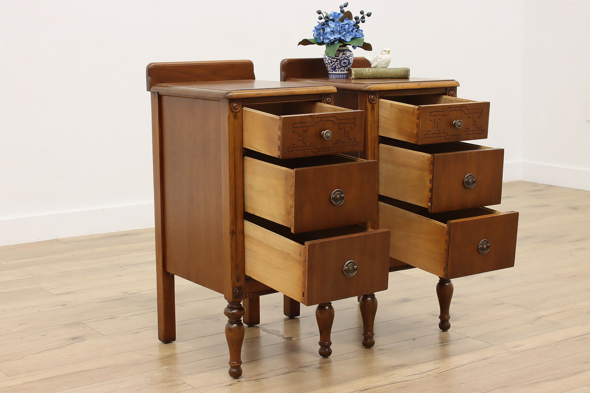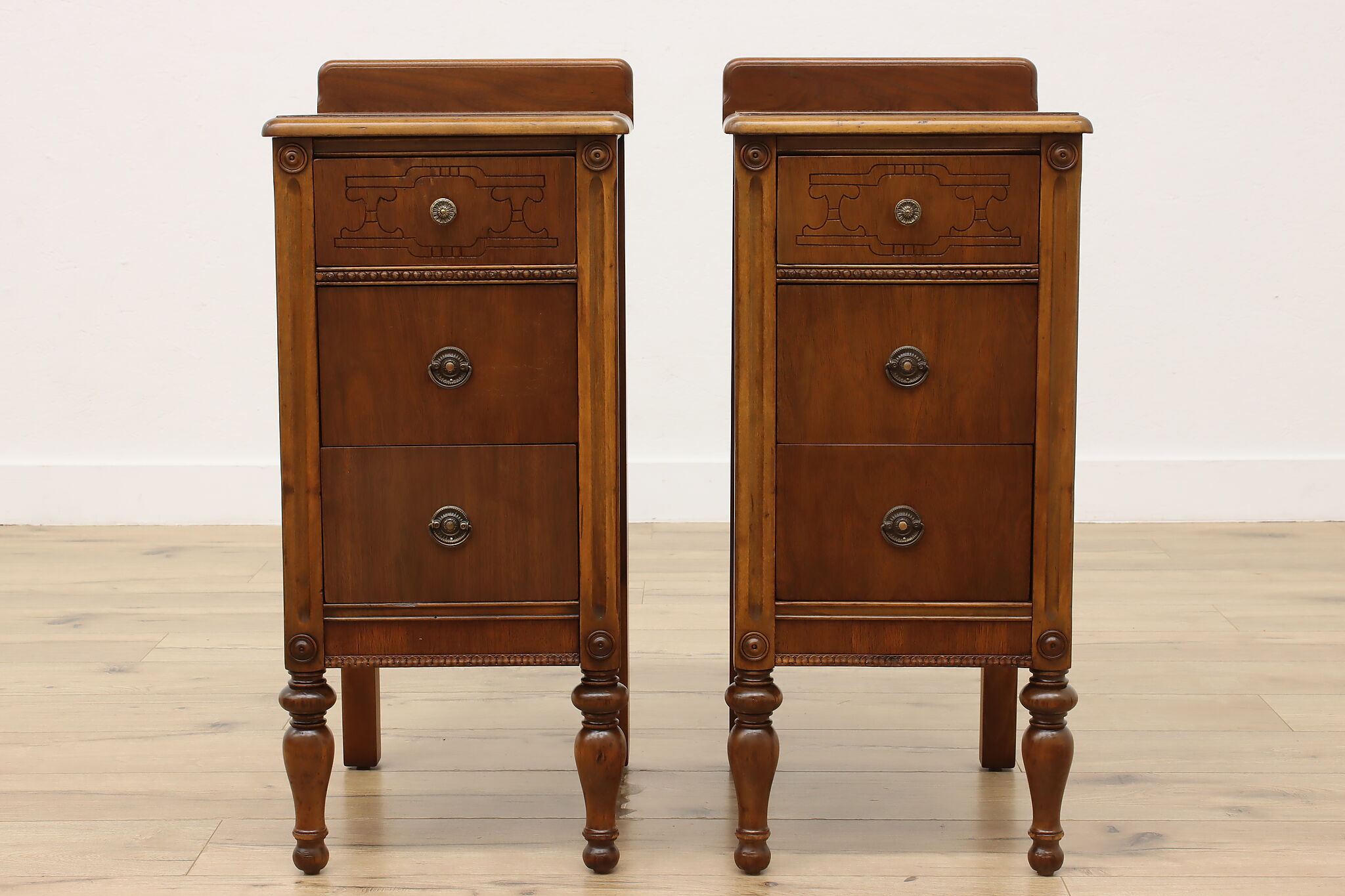 This delightful pair of nightstands or end tables reflect the beauty of the English Tudor period.