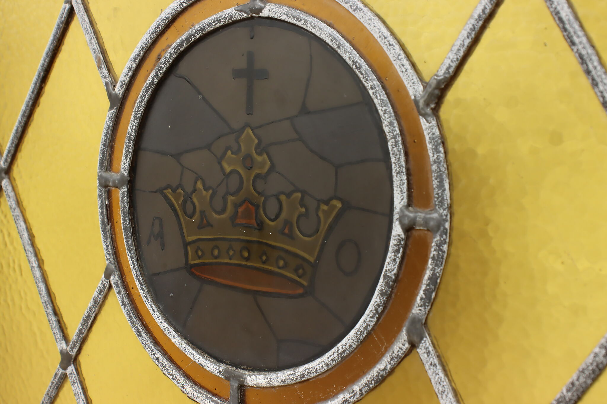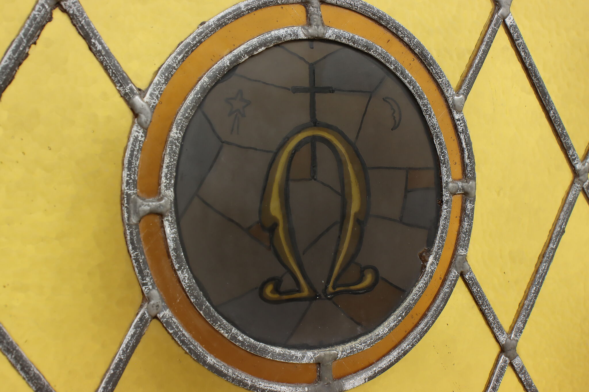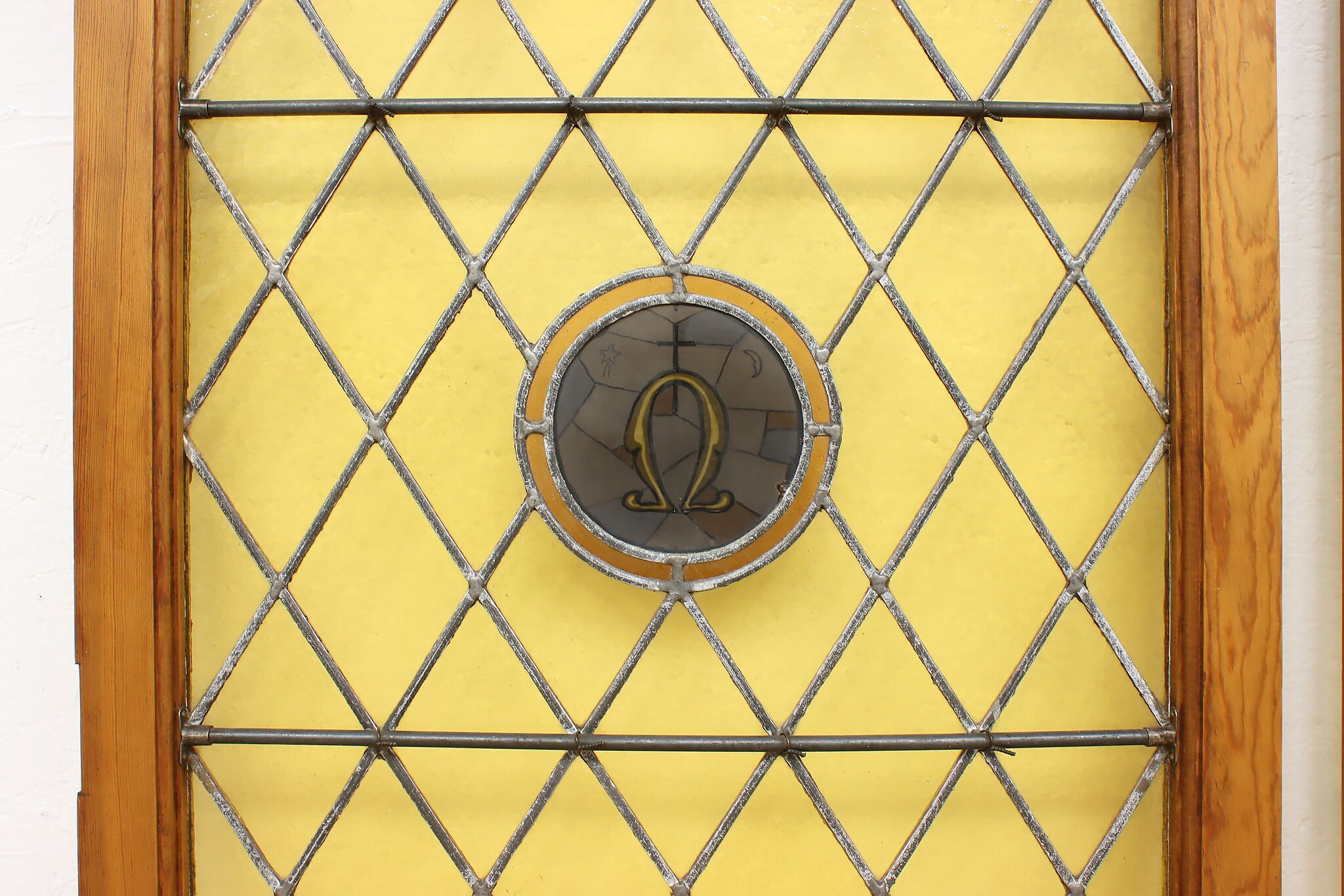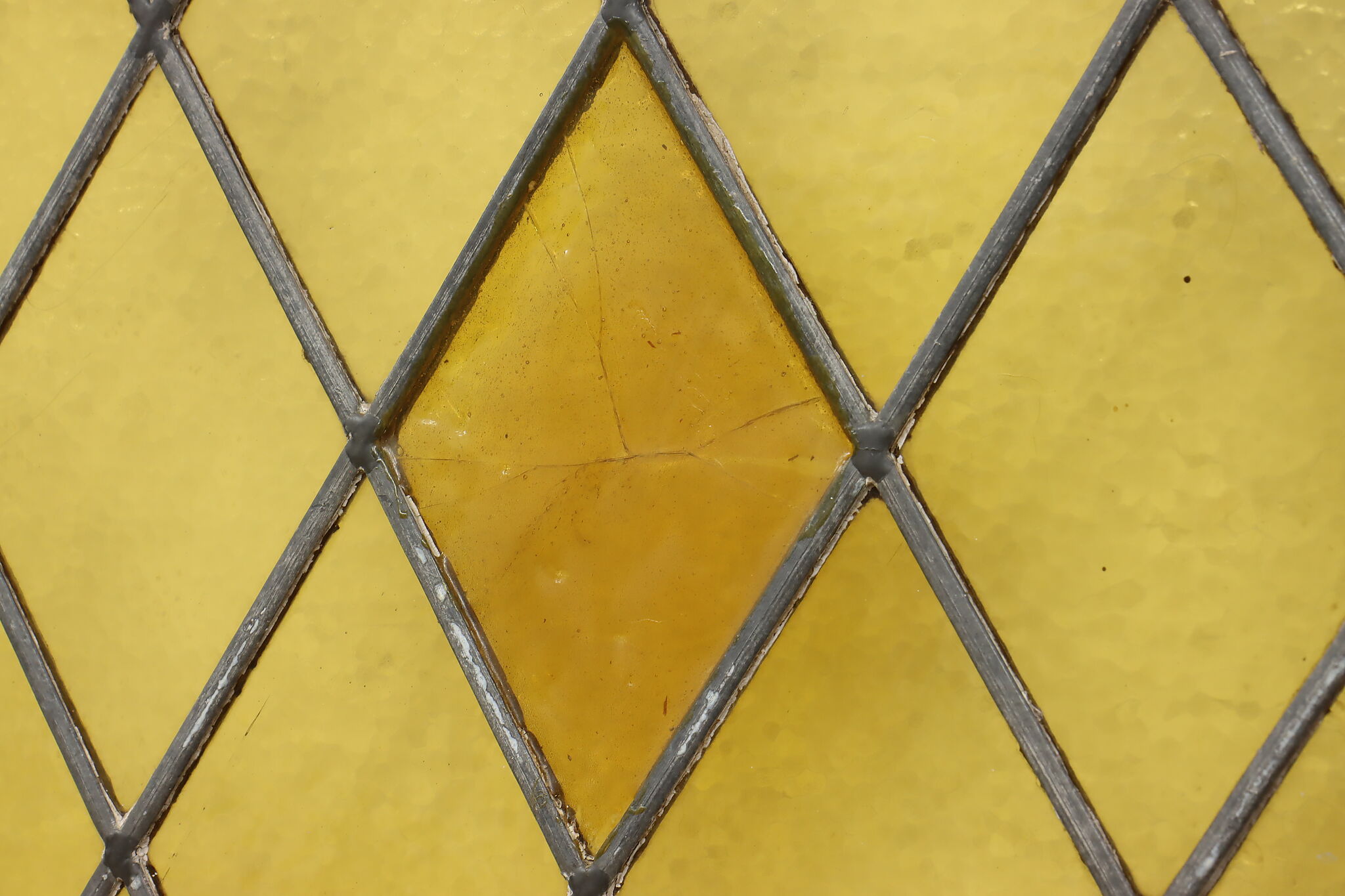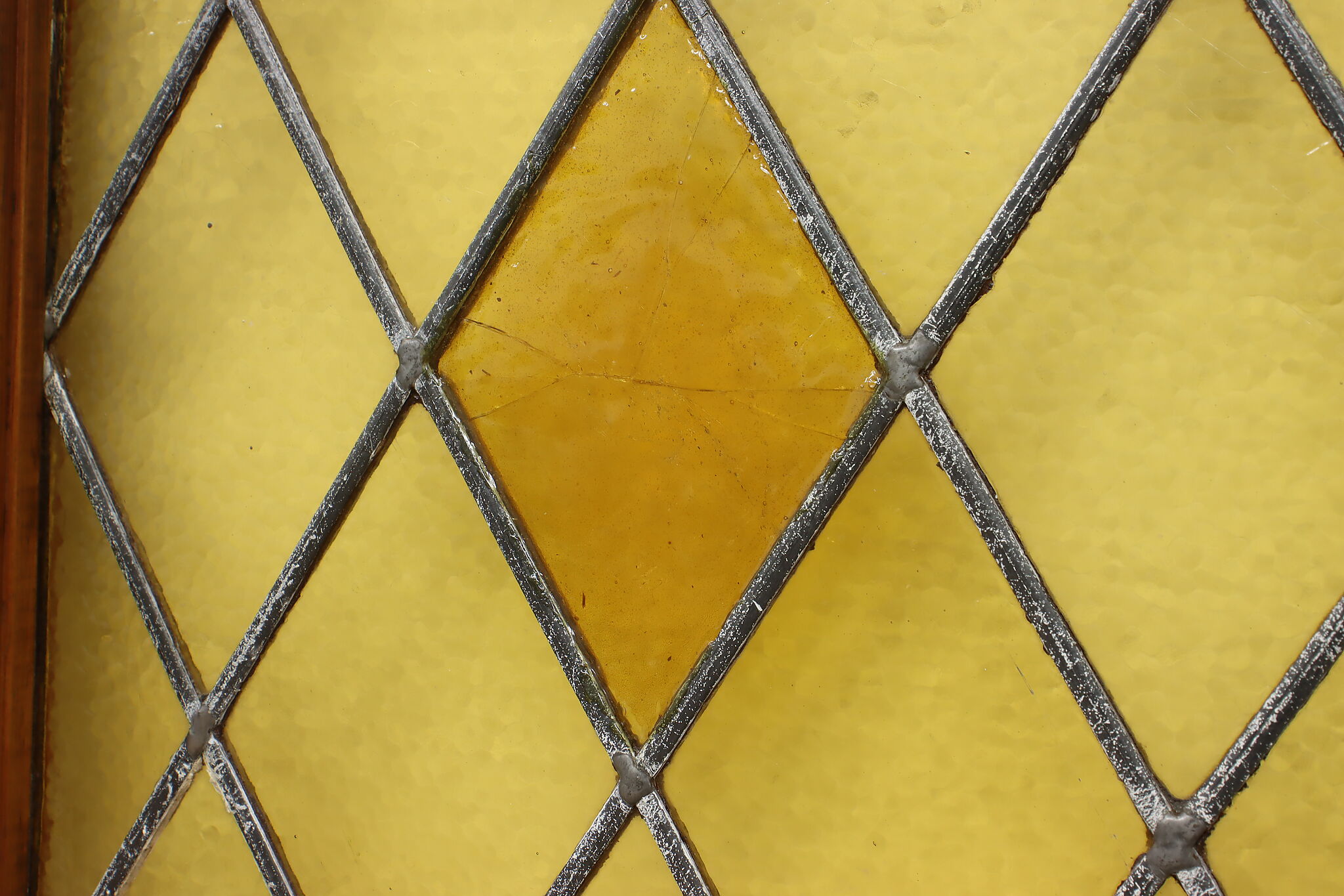 Salvaged from an Arts and Crafts period home, this pair of Craftsman windows or doors have beautiful textured hand leaded amber stained glass panes.