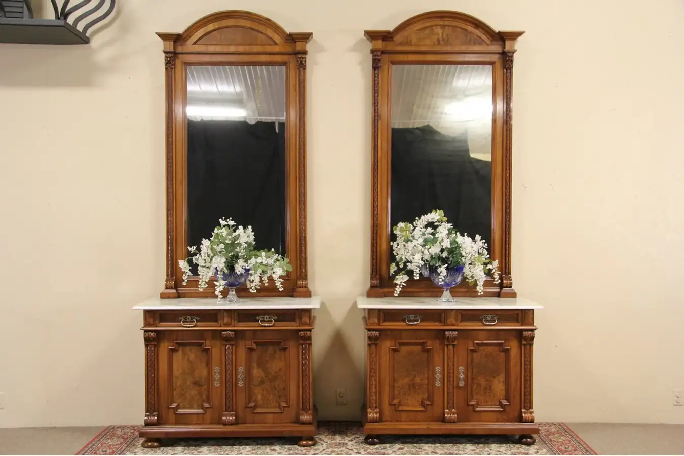 A palatial pair of console cabinets have marble tops and arched mirrors, they were hand carved in Austria about 1890.