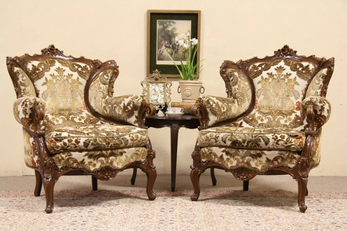 Lavishly hand carved in the Baroque manner by artisans in the north of Italy, this amazing pair of armchairs is about 60 years old.