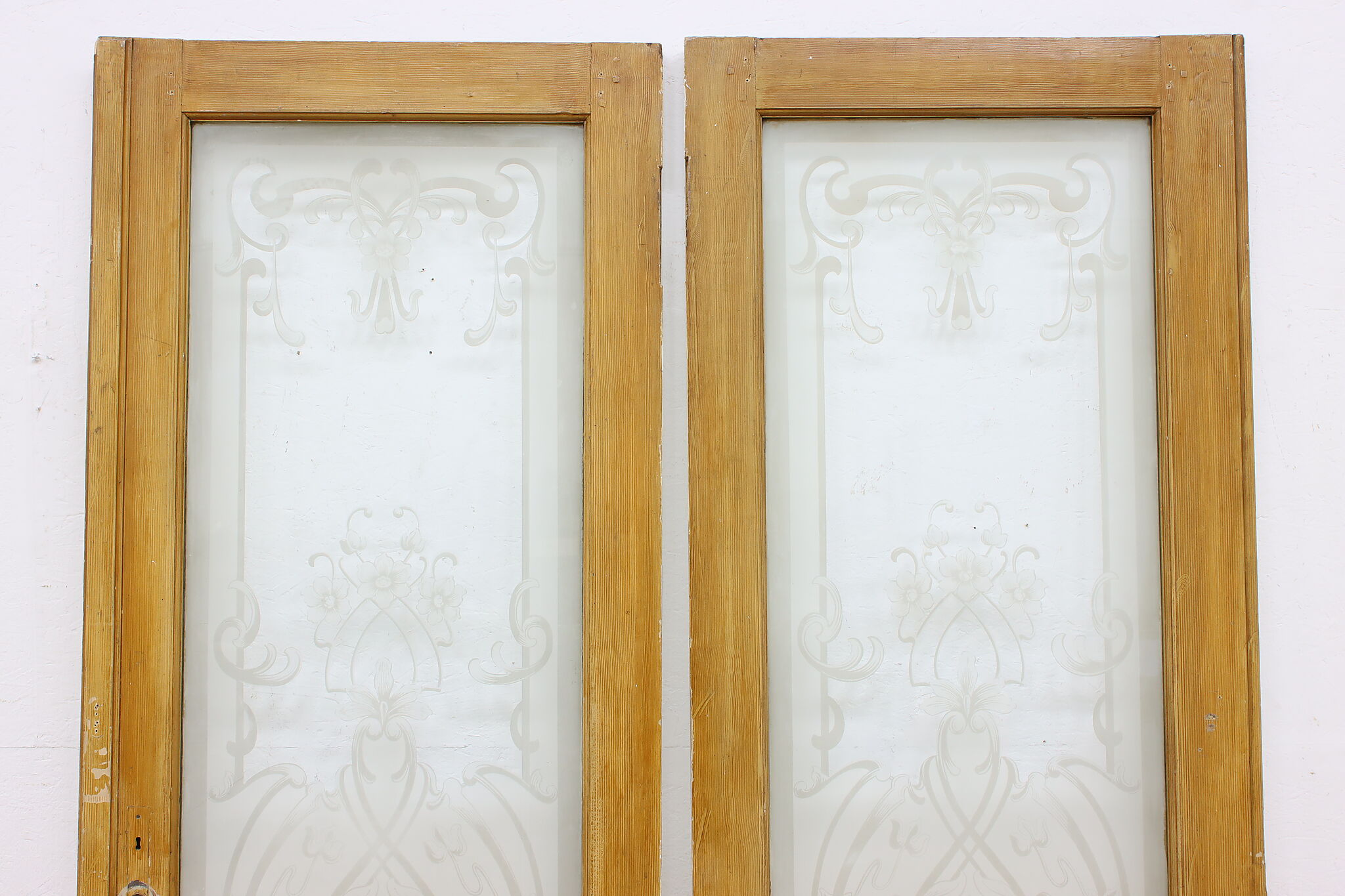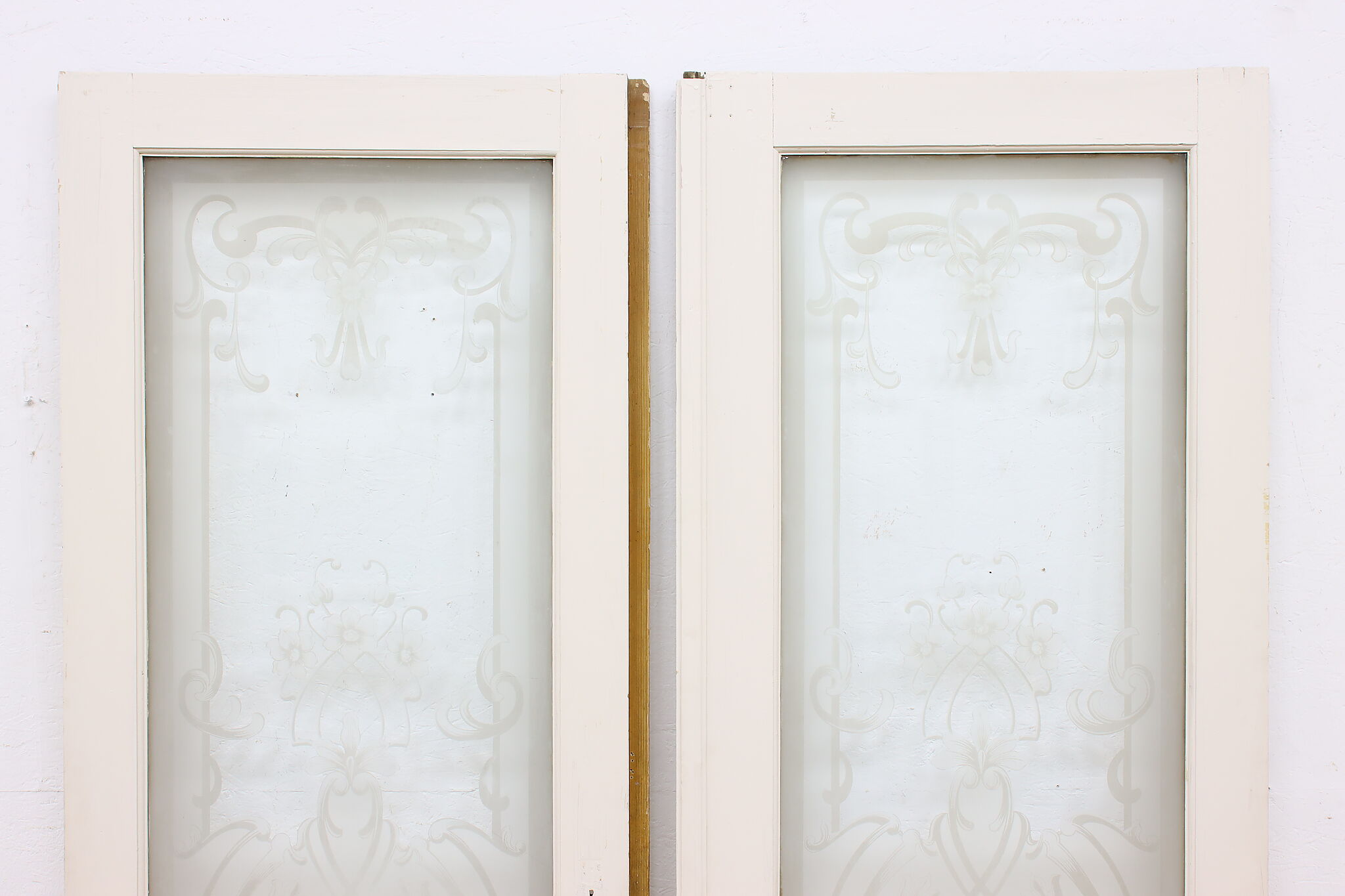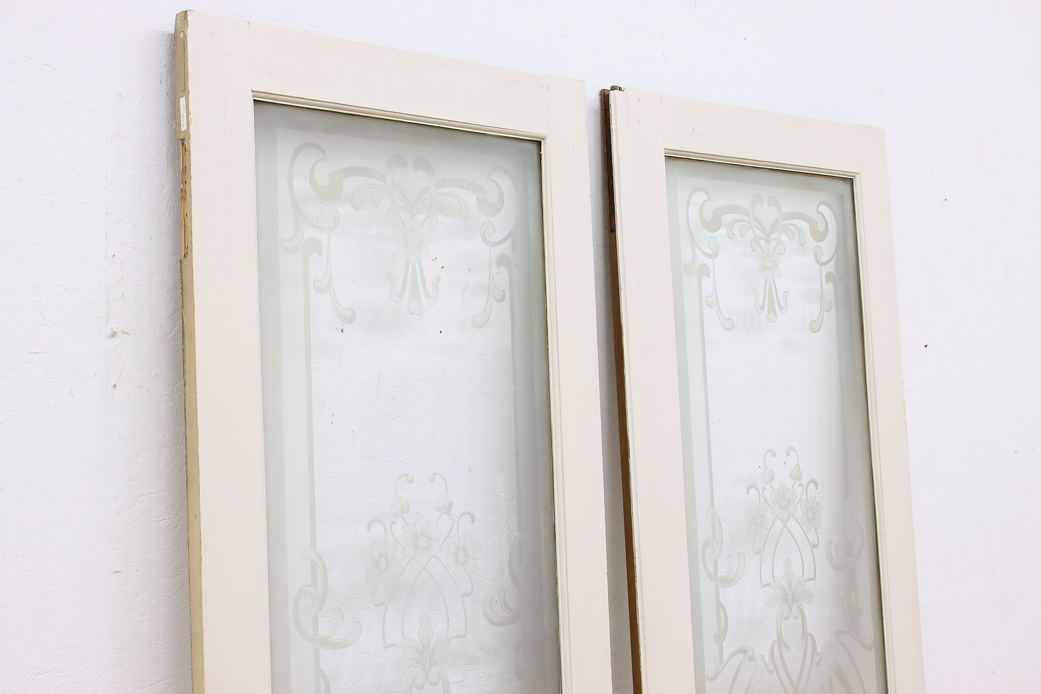 A pair of architectural salvage doors have beautiful etched and carved glass panels with floral motifs and could be hinged together to form a screen.