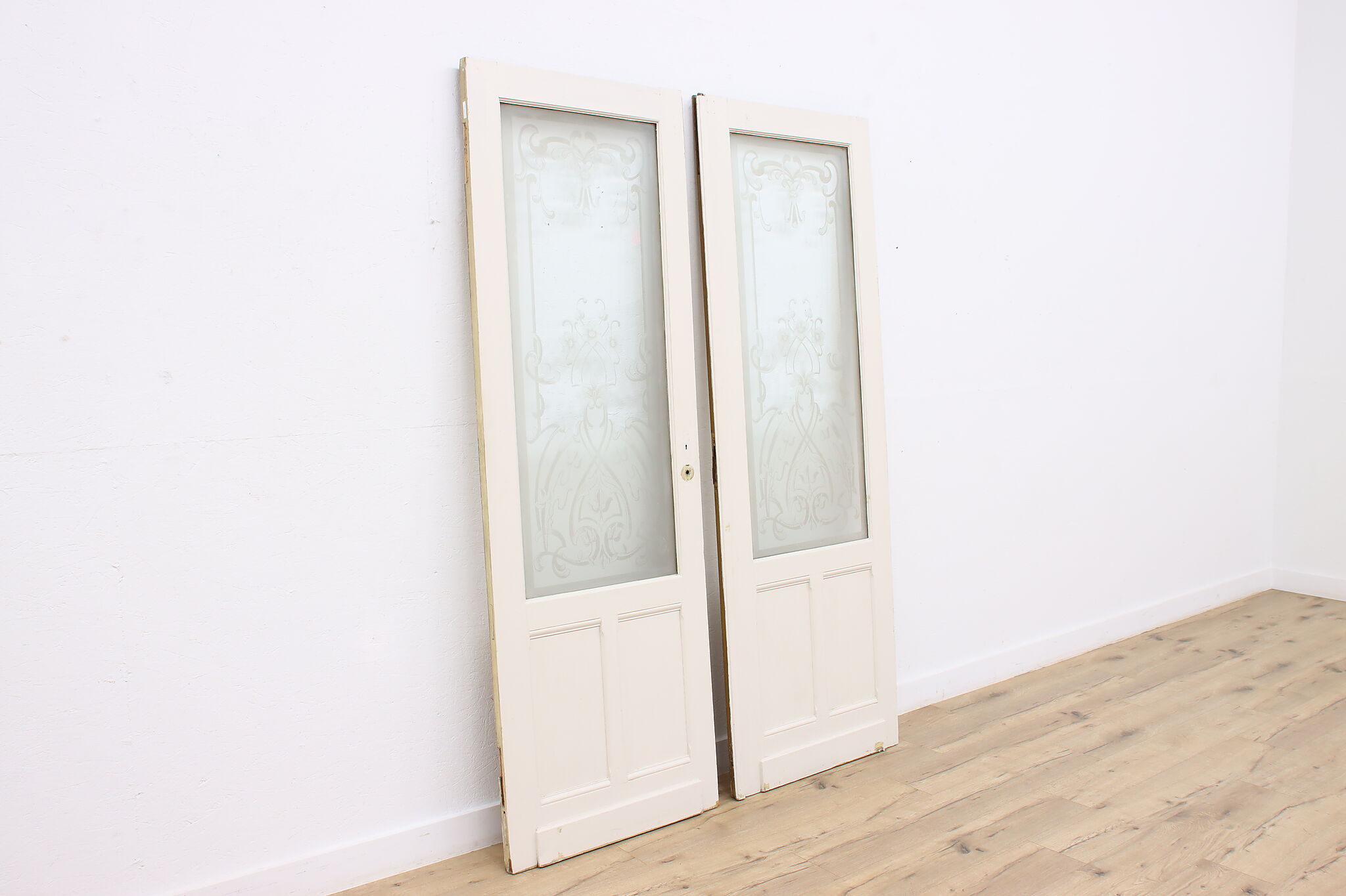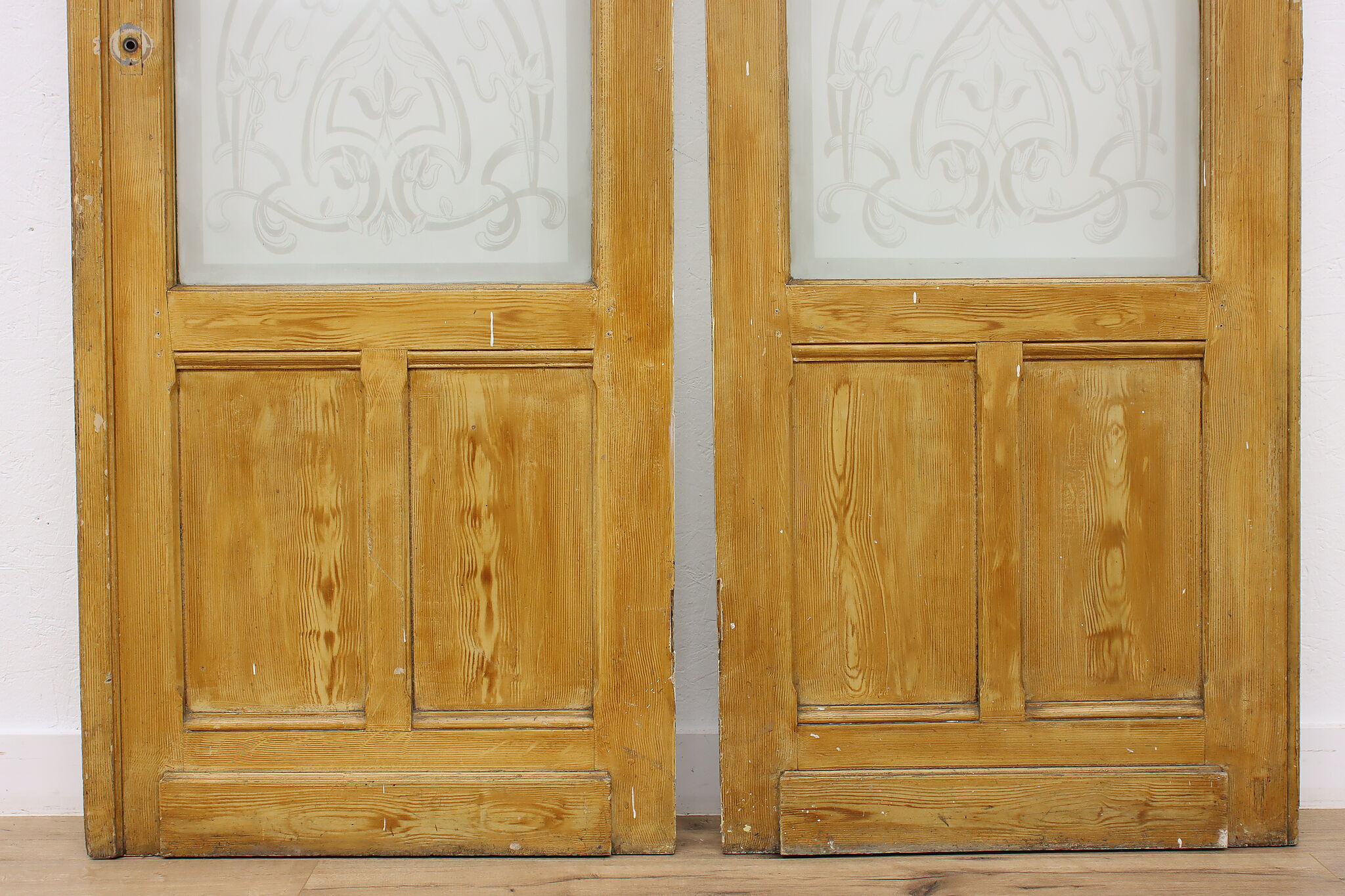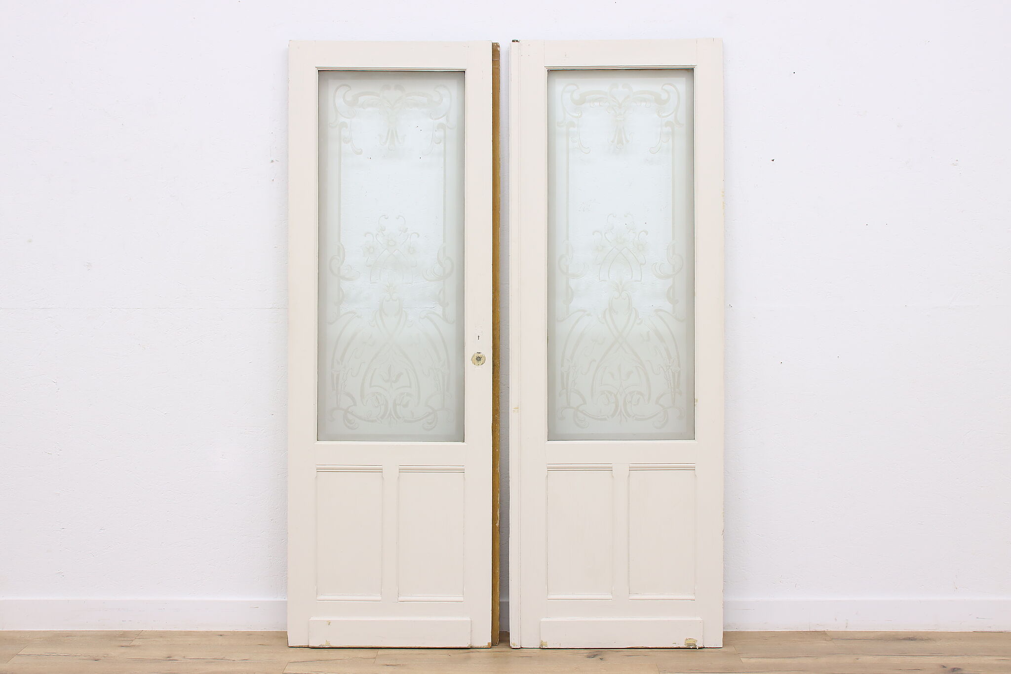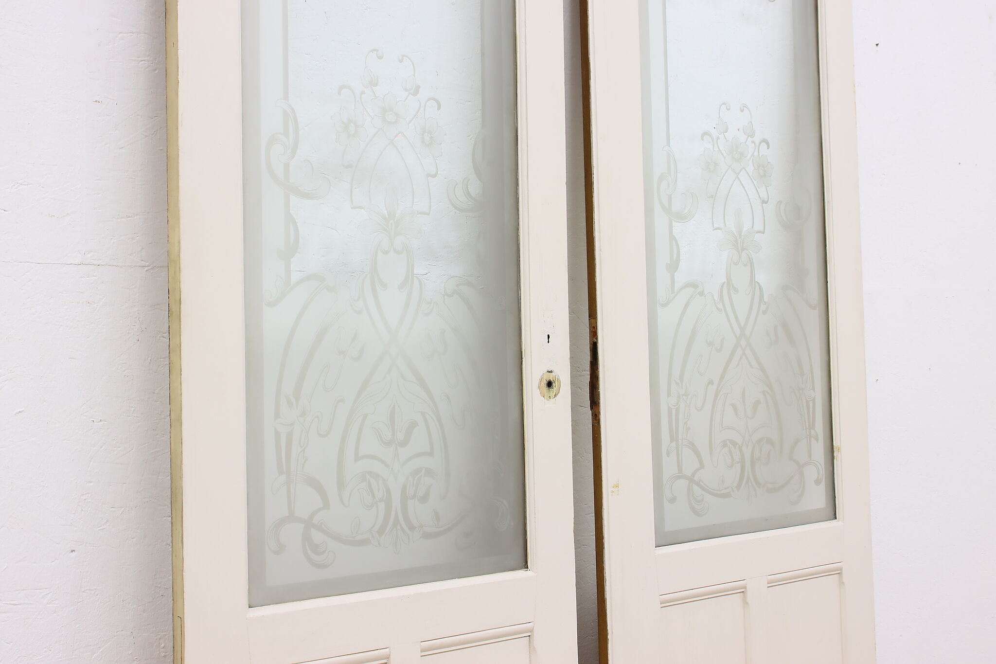 A pair of architectural salvage doors have beautiful etched and carved glass panels with floral motifs and could be hinged together to form a screen.