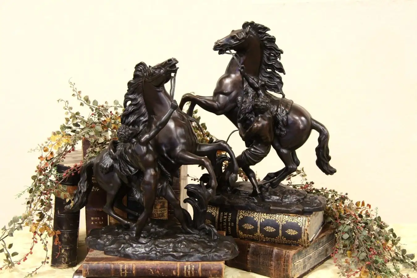 This pair of famous "Marly Horses" or "Horse Tamers" are after the originals made for King Louis XV of France in 1745, by famed royal sculptor, Guillaume Coustou.