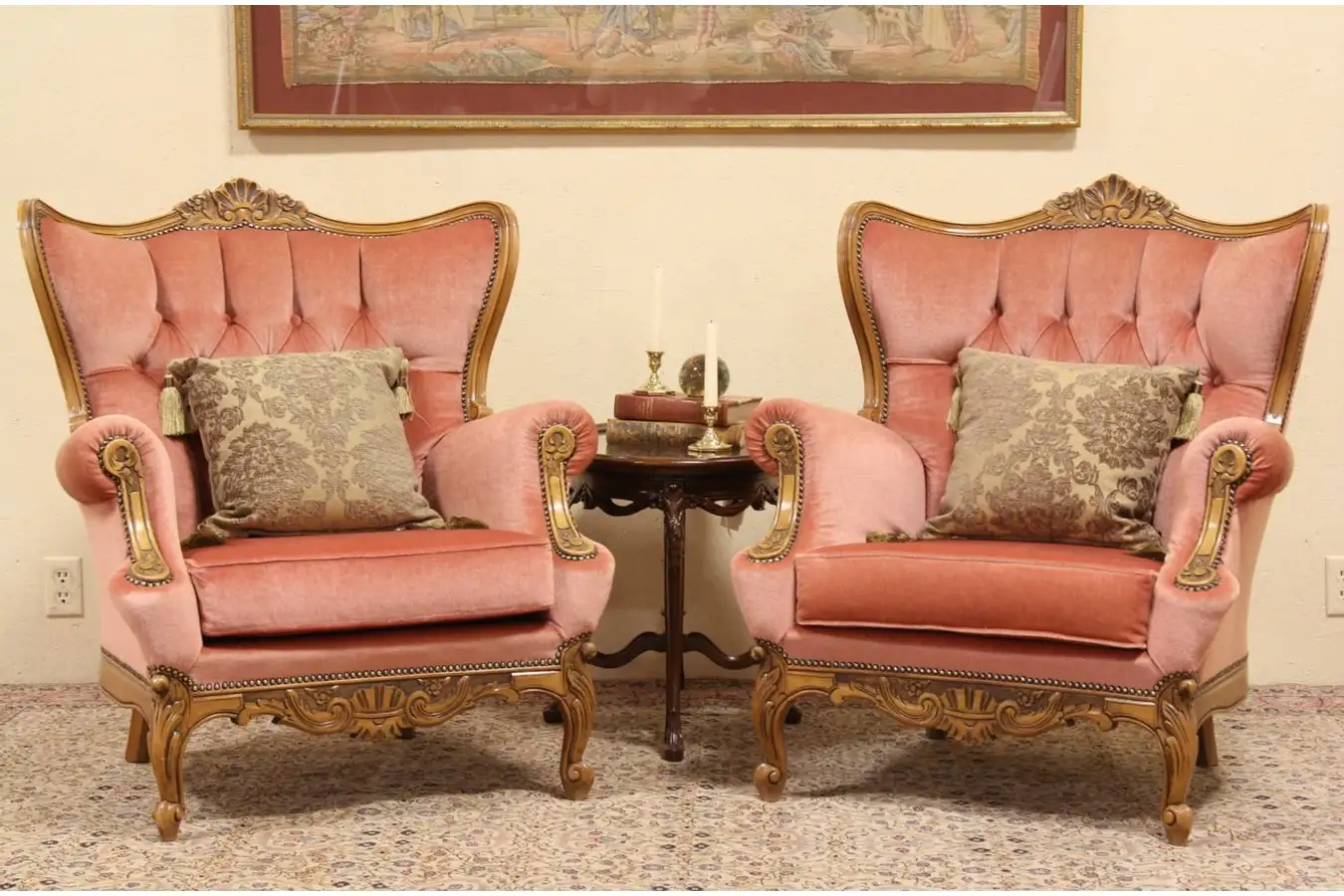 A stunning pair of 1950's carved wing back chairs has original velvety mohair upholstery. There is a little wear and some irregularities in the pile of the soft genuine natural mohair, plus dimples on the backside of one chair, see photos. Tufting in the back is expert and cushions are zippered.