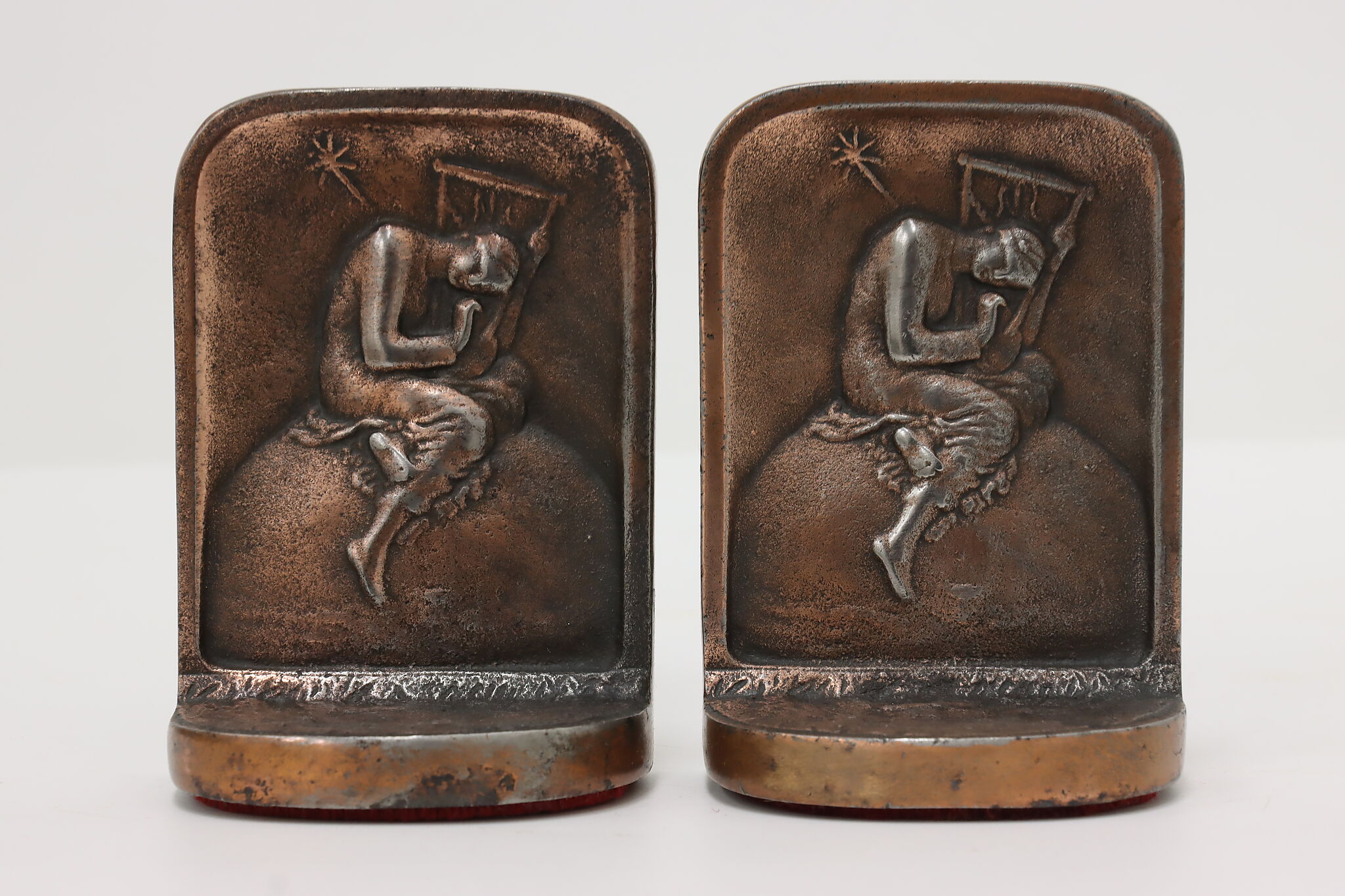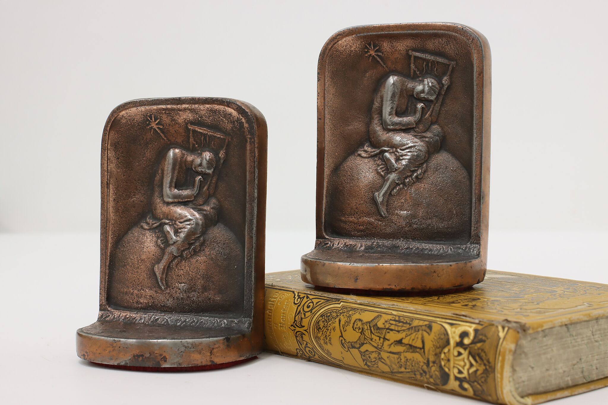 This pair of bookends have a scene of a woman playing a harp or lyre with a shooting star.