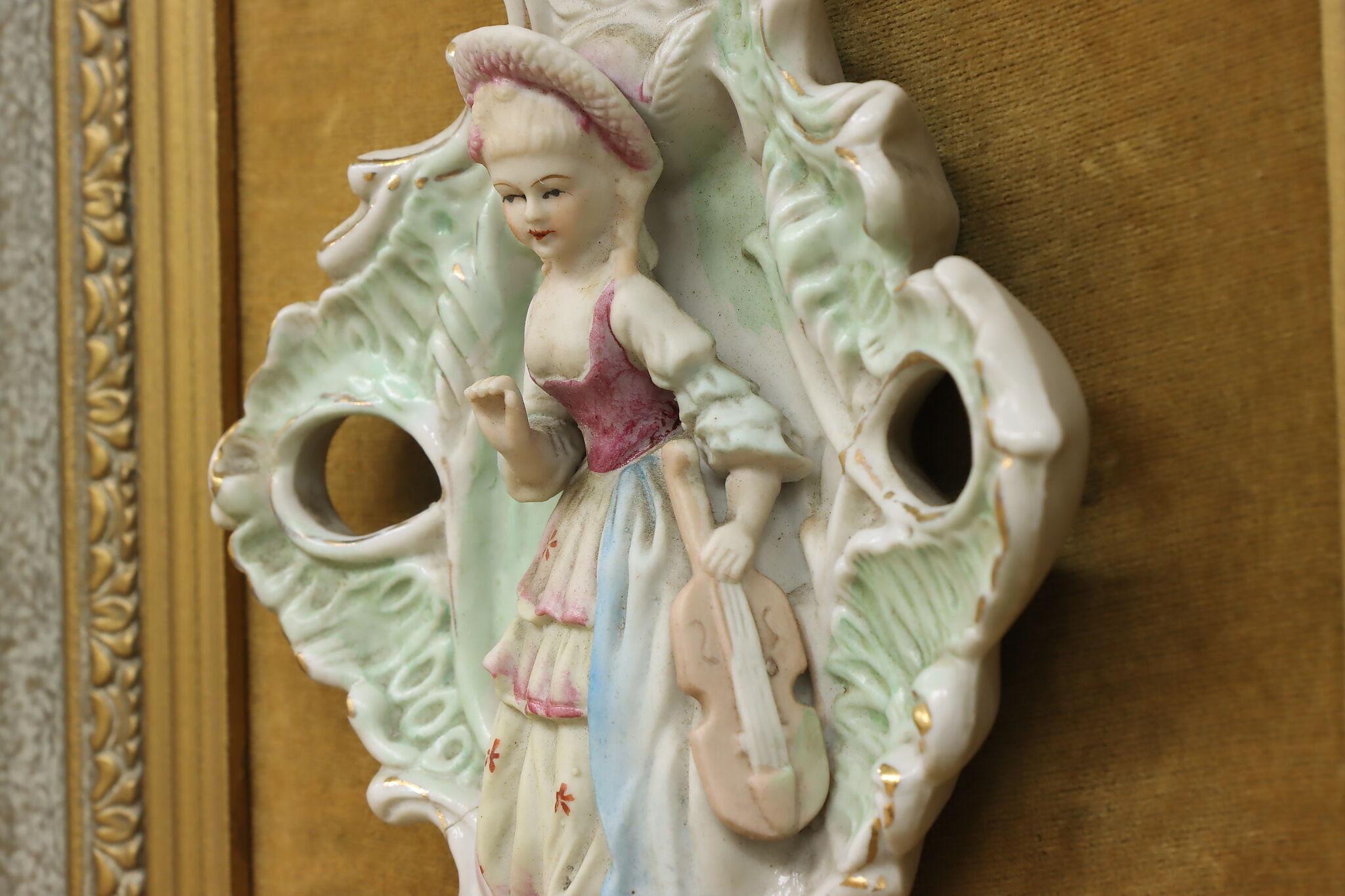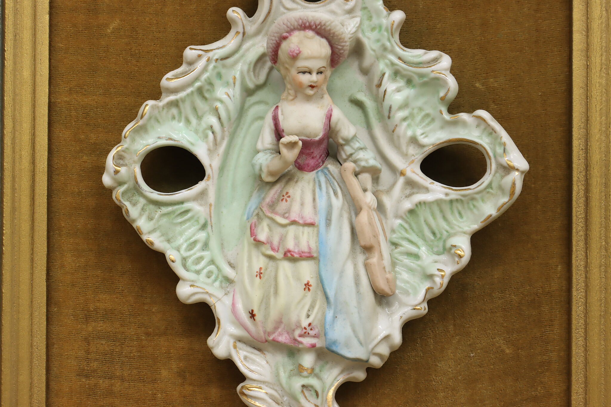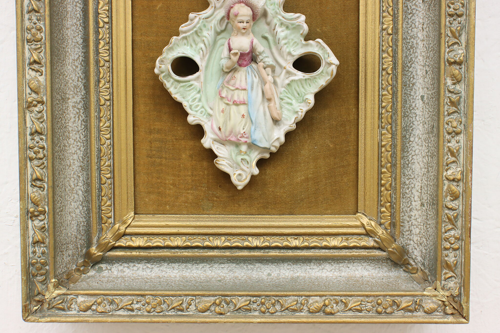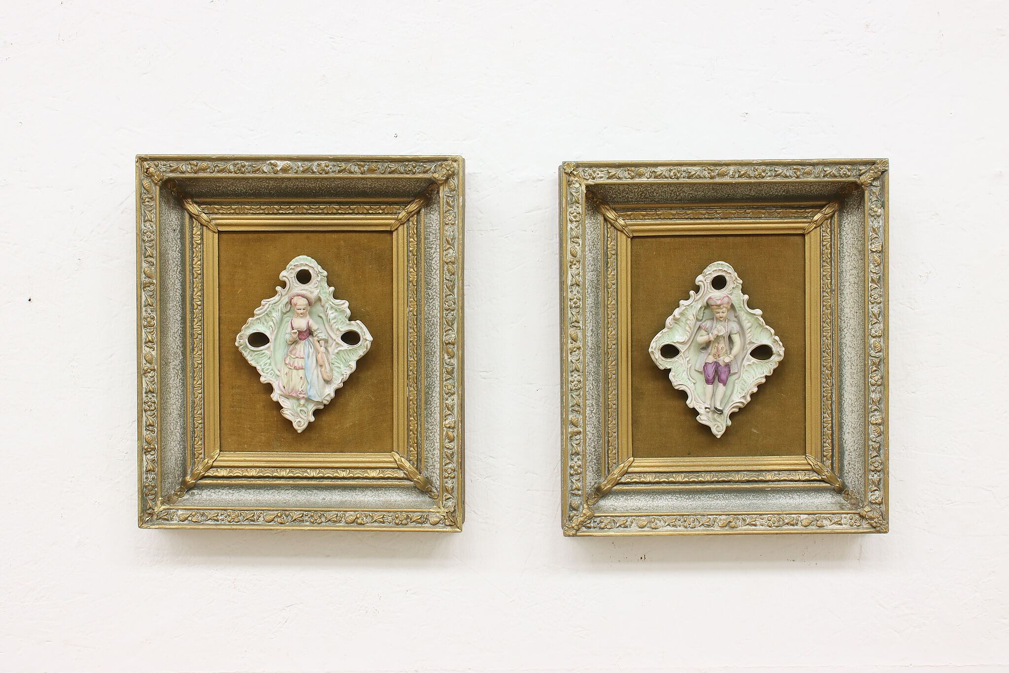 This charming pair of framed porcelain reliefs are of a French couple, with the woman bringing her violin to serenade her lover.