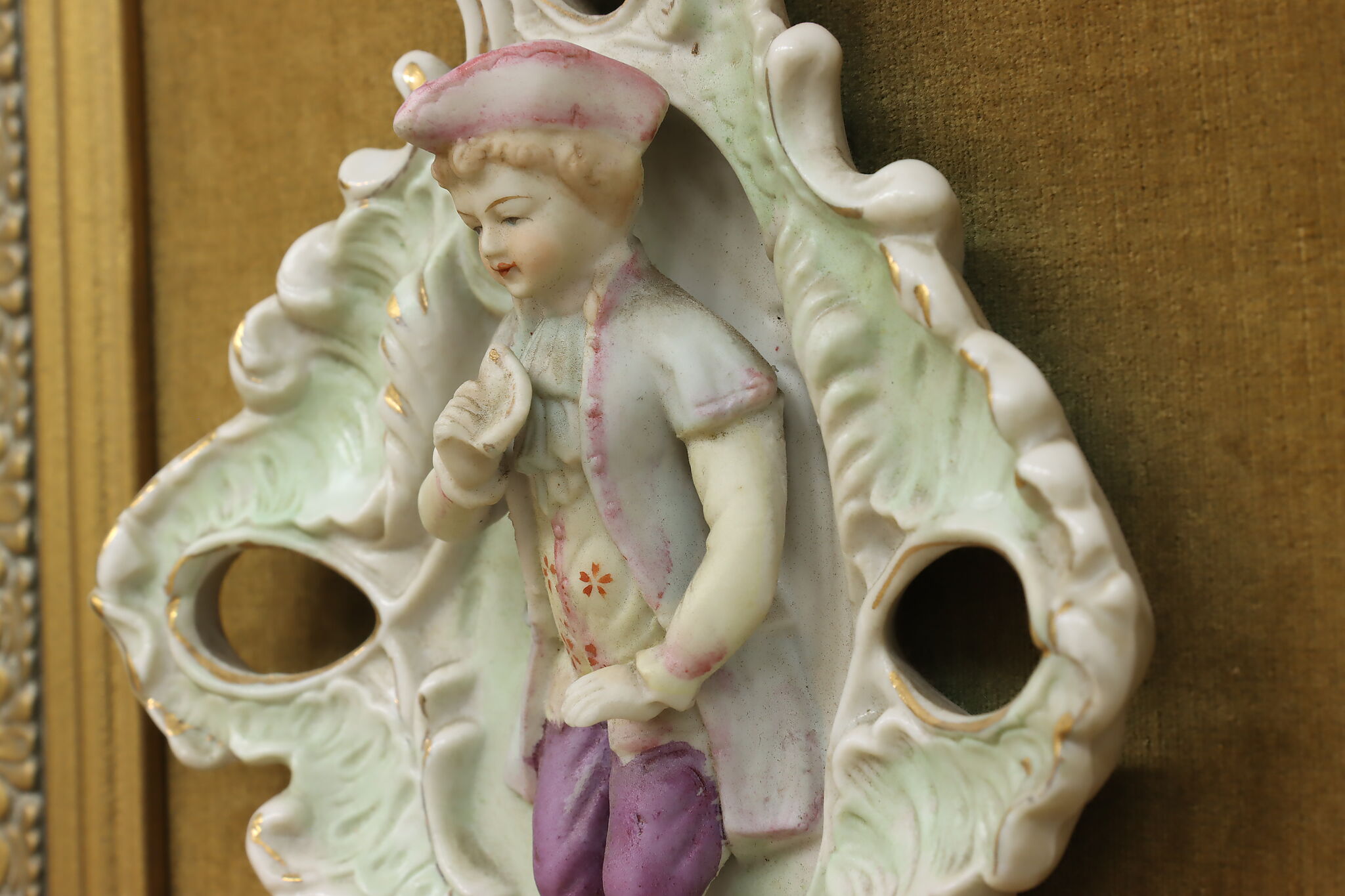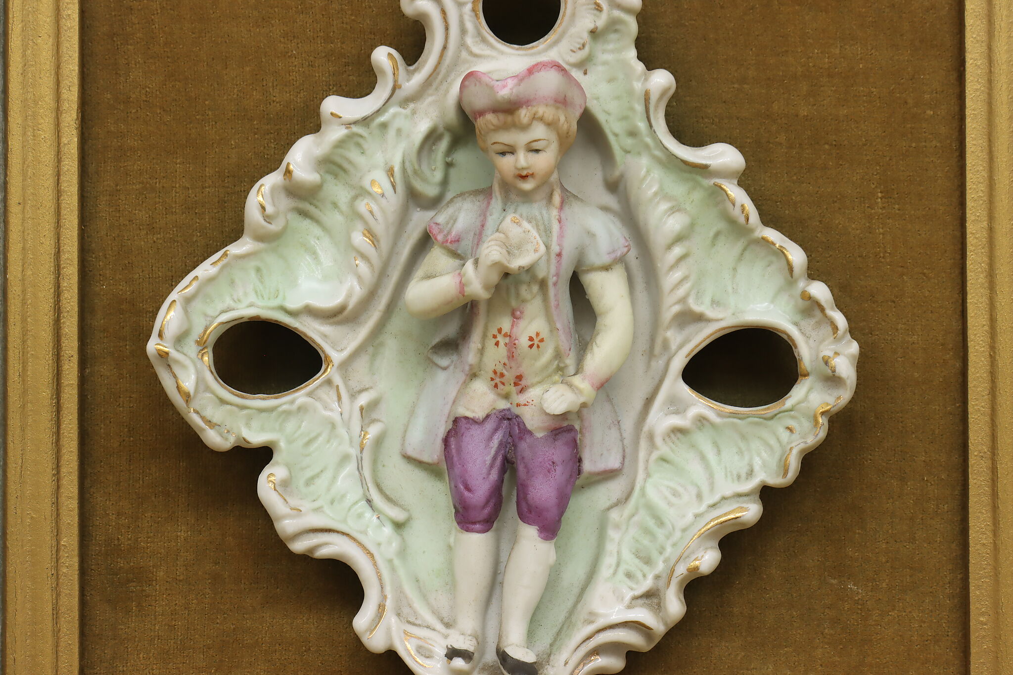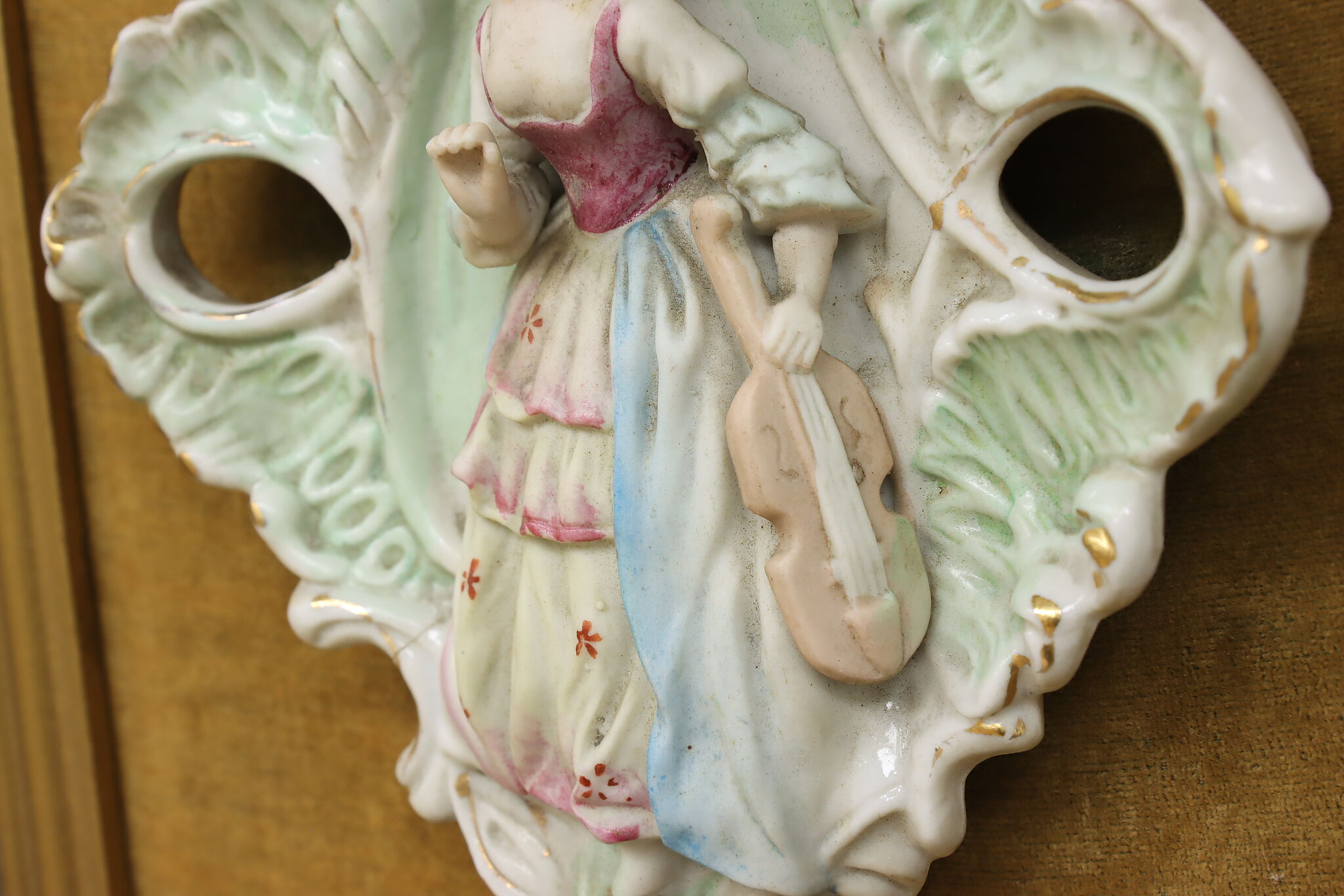 This charming pair of framed porcelain reliefs are of a French couple, with the woman bringing her violin to serenade her lover.