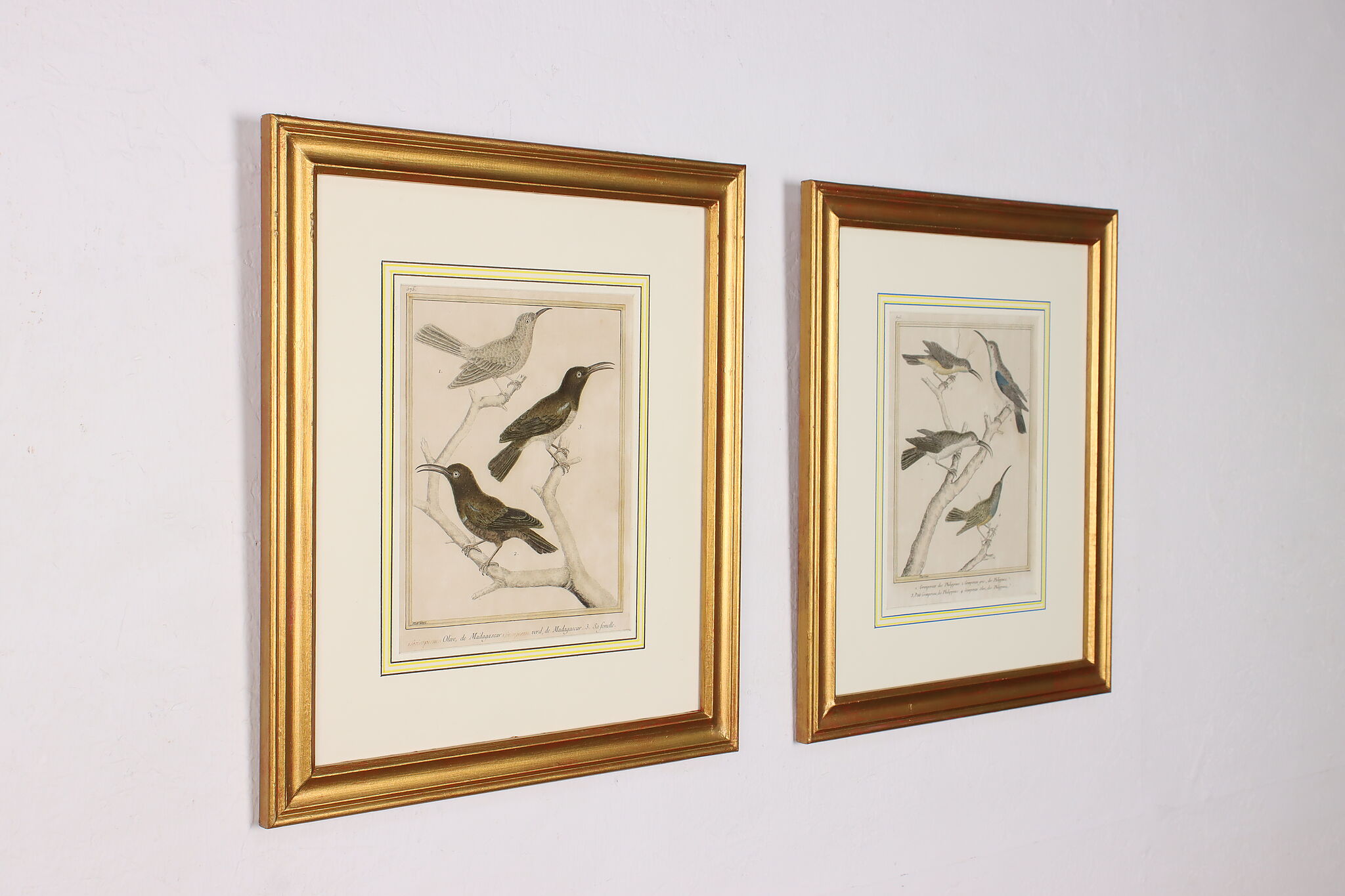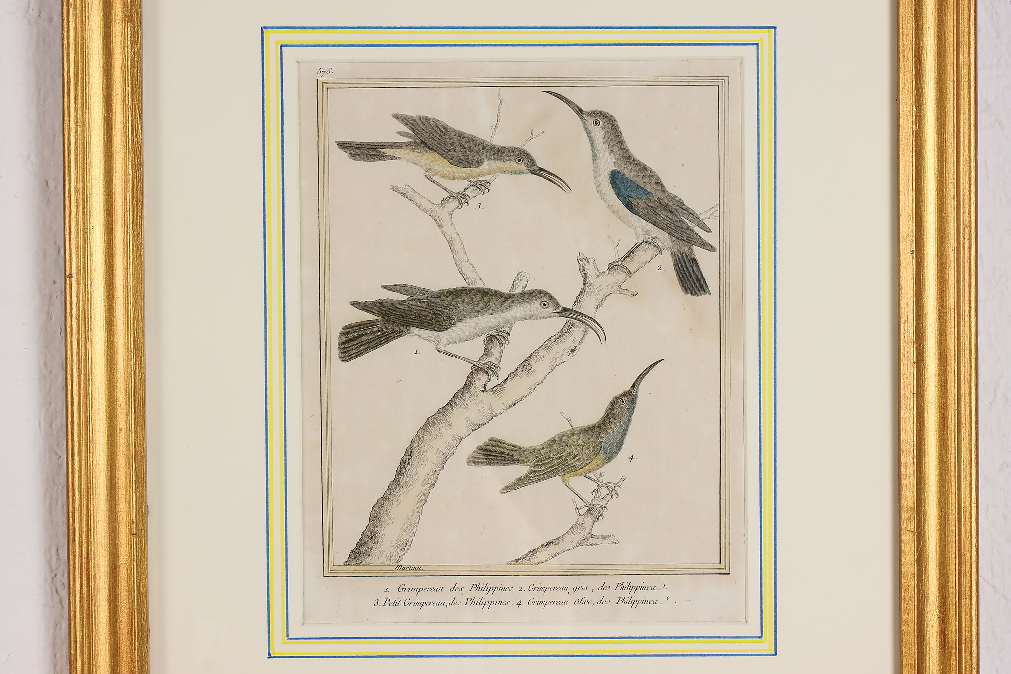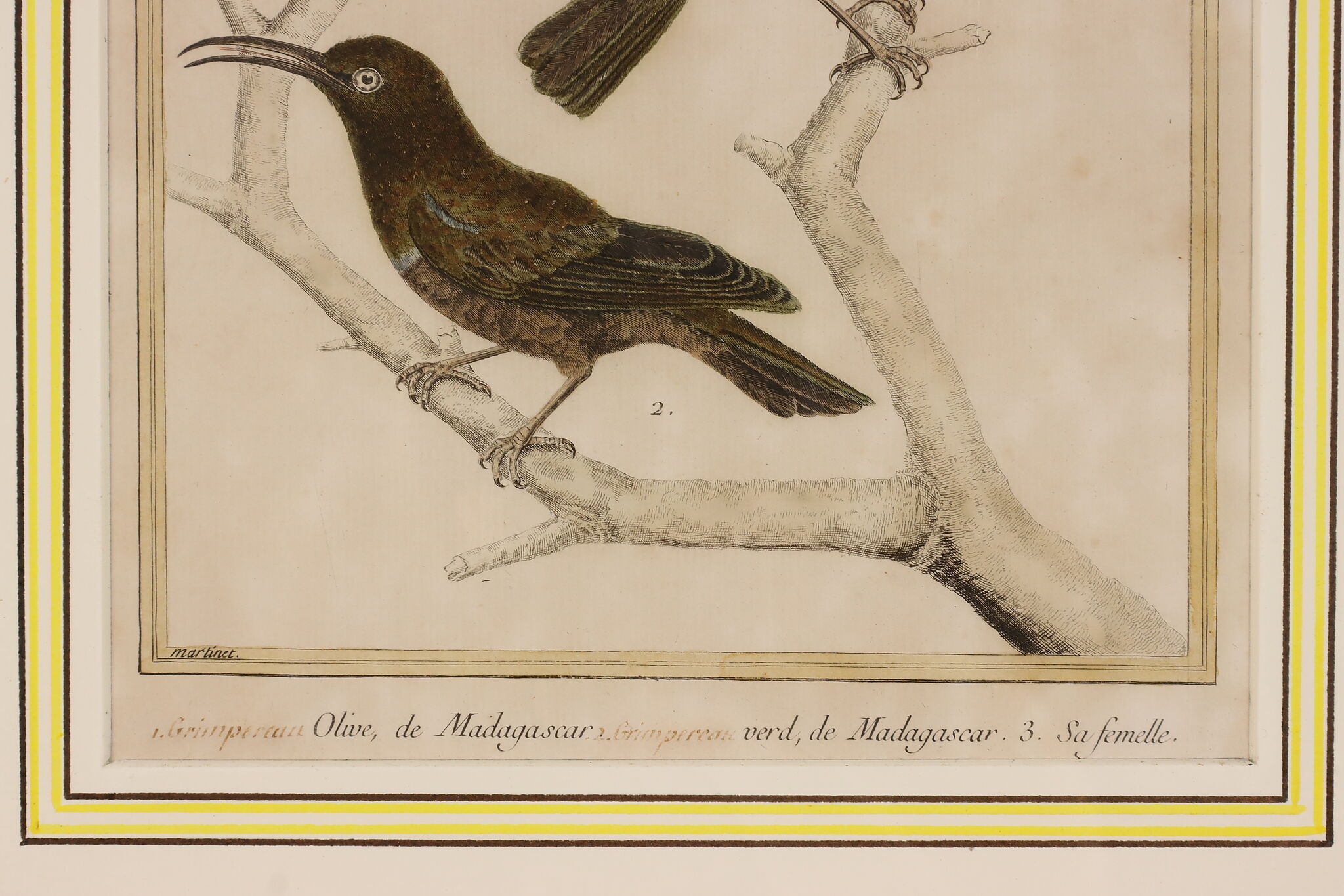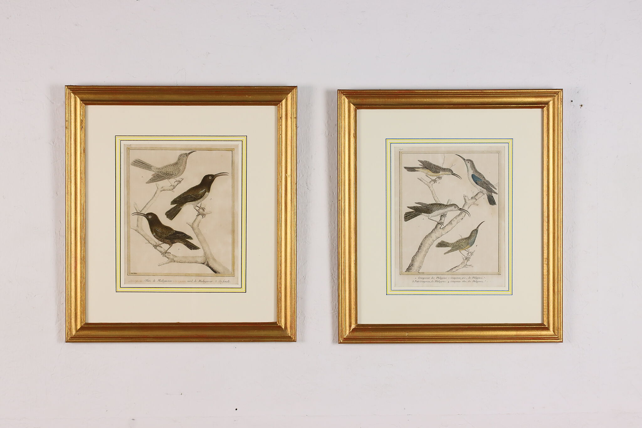 A fantastic set of hand-colored engravings of exotic birds are by French artist, François Nicolas Martinet, an engraver who helped illustrate the 18th century French encyclopedia, "Histoire Naturelle."