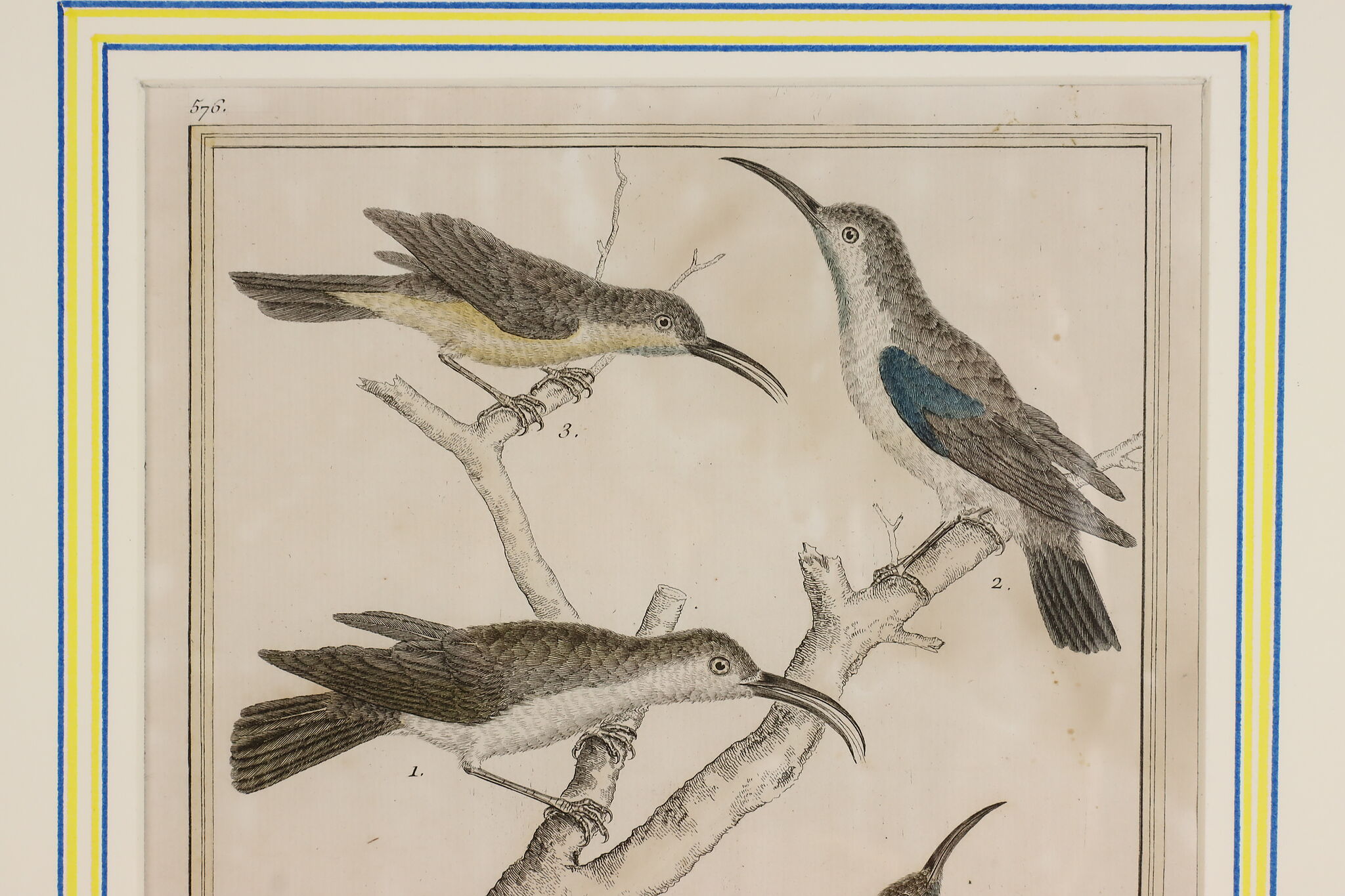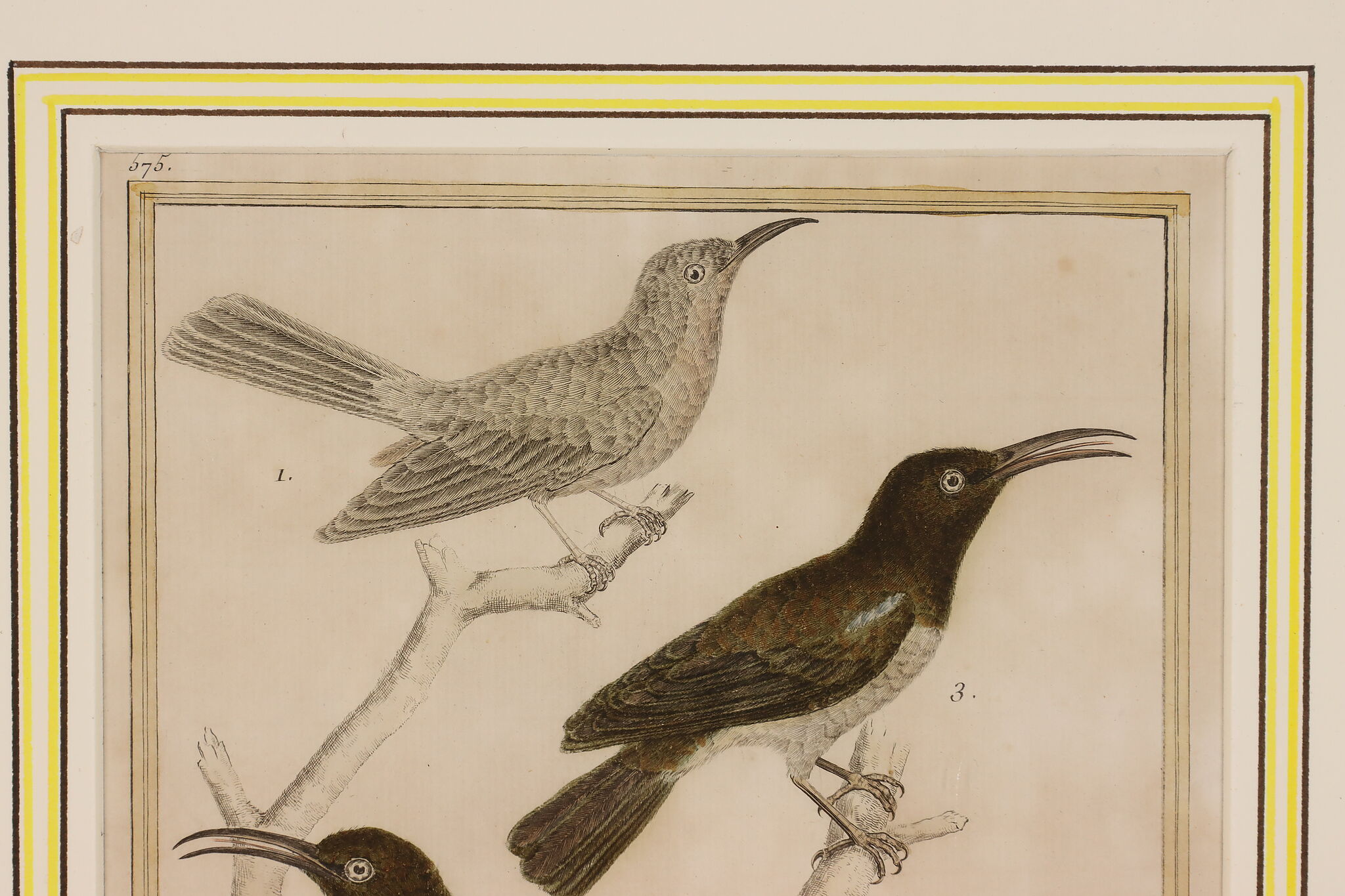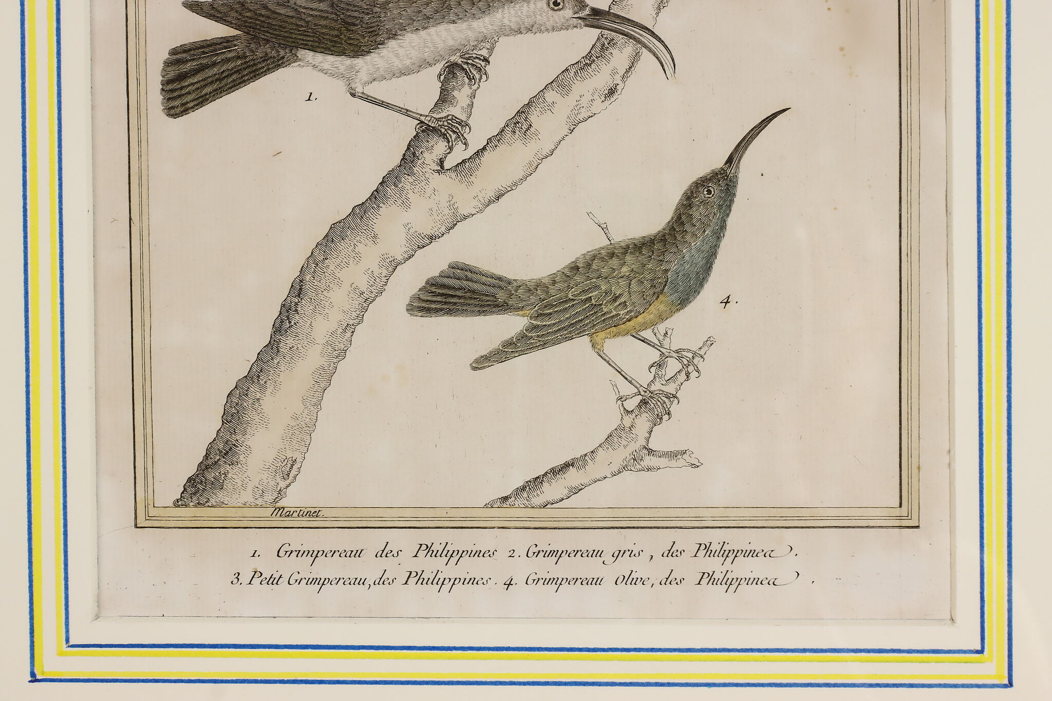 A fantastic set of hand-colored engravings of exotic birds are by French artist, François Nicolas Martinet, an engraver who helped illustrate the 18th century French encyclopedia, "Histoire Naturelle."