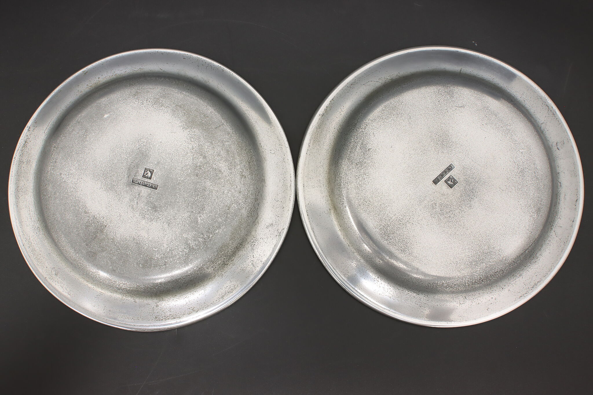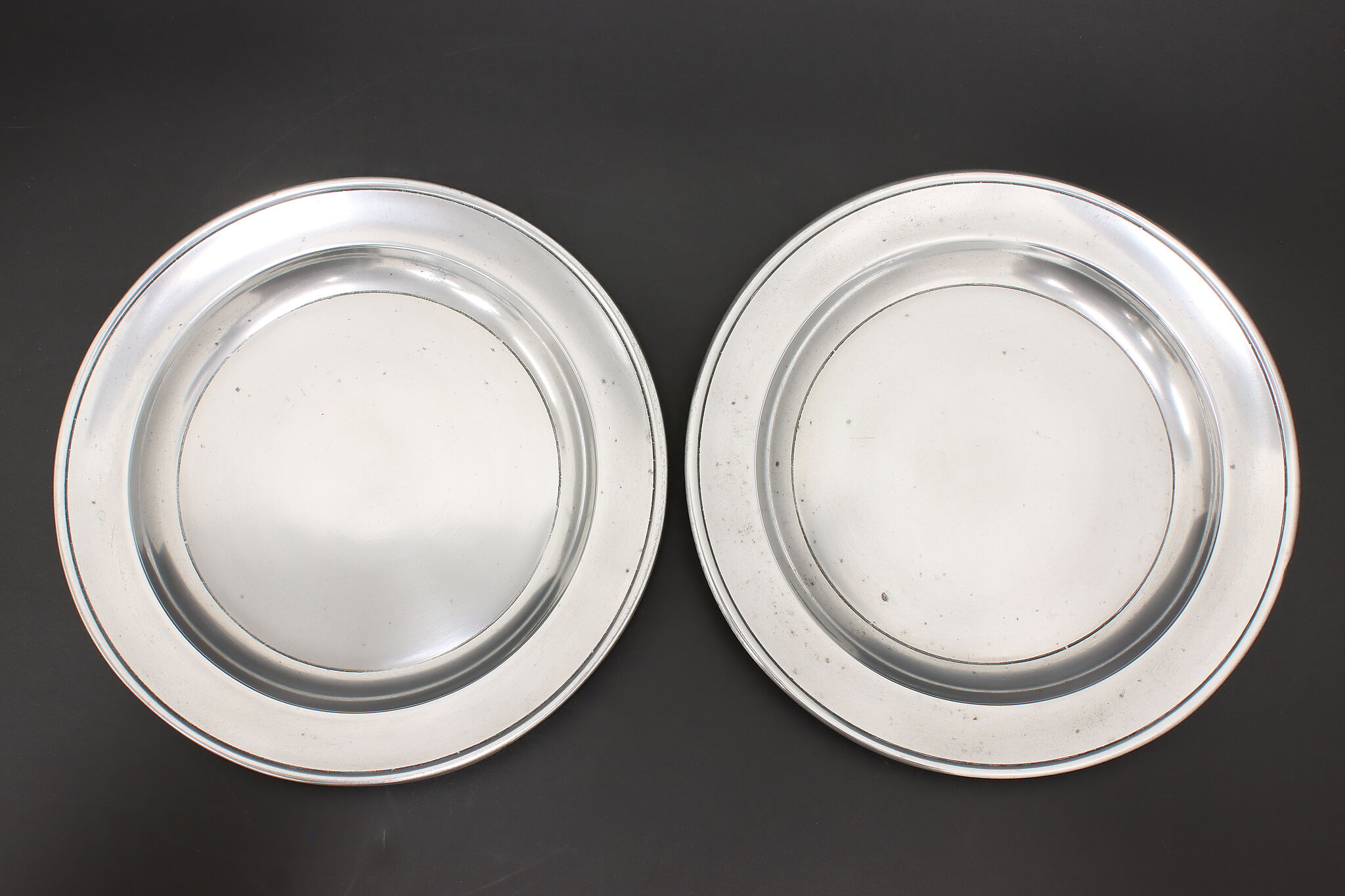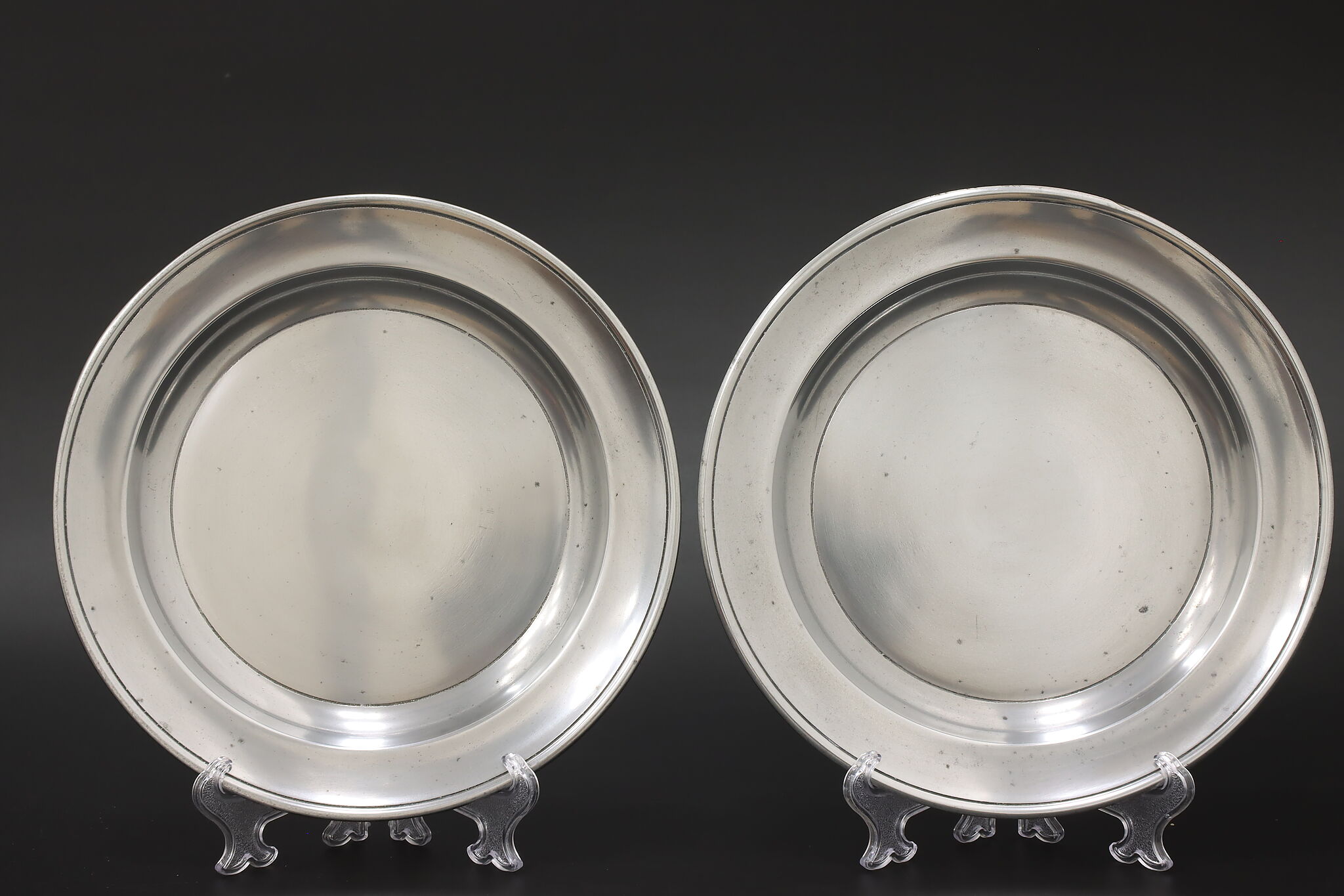 A delightful pair of pewter farmhouse plates were crafted in Germany.