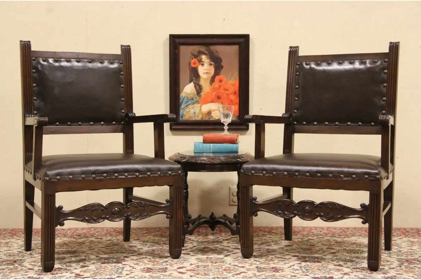 Carved of walnut about 1910 in northern Italy, these chairs are in beautiful condition. Leather backs are original, comfortable seats have been newly upholstered in natural saddle leather using original brass nailhead trim.