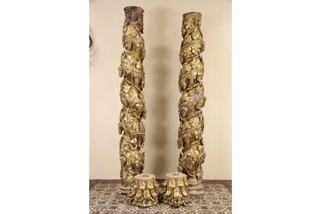 An incredible pair of Italian Baroque columns are architectural salvage from the late 1600's or early 1700's. Hand carved with grapevines in a spiral pattern, three dimensional artistry is remarkable. These antiques are reminiscent of Bernini's columns over the altar at St. Peter's in Rome.
