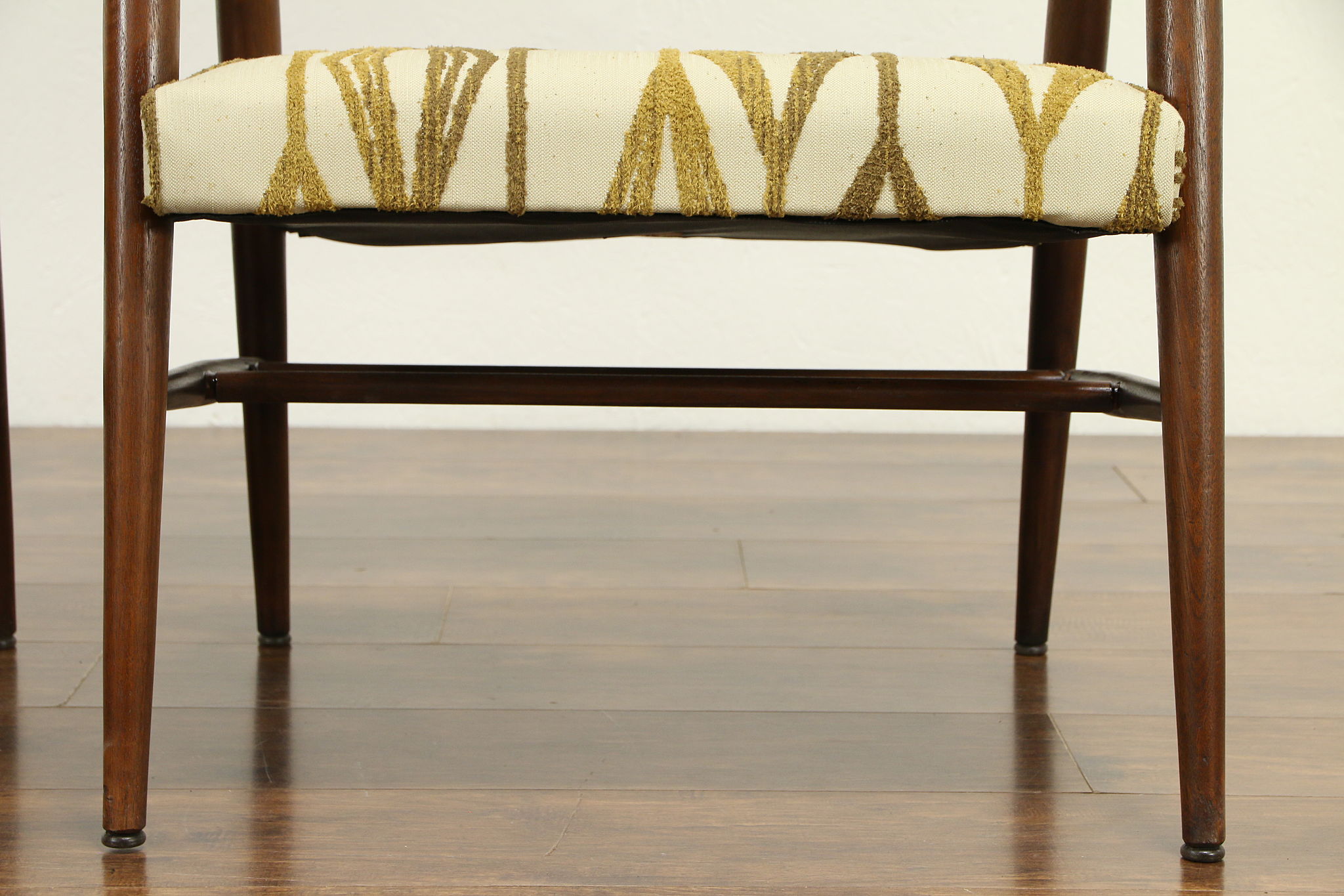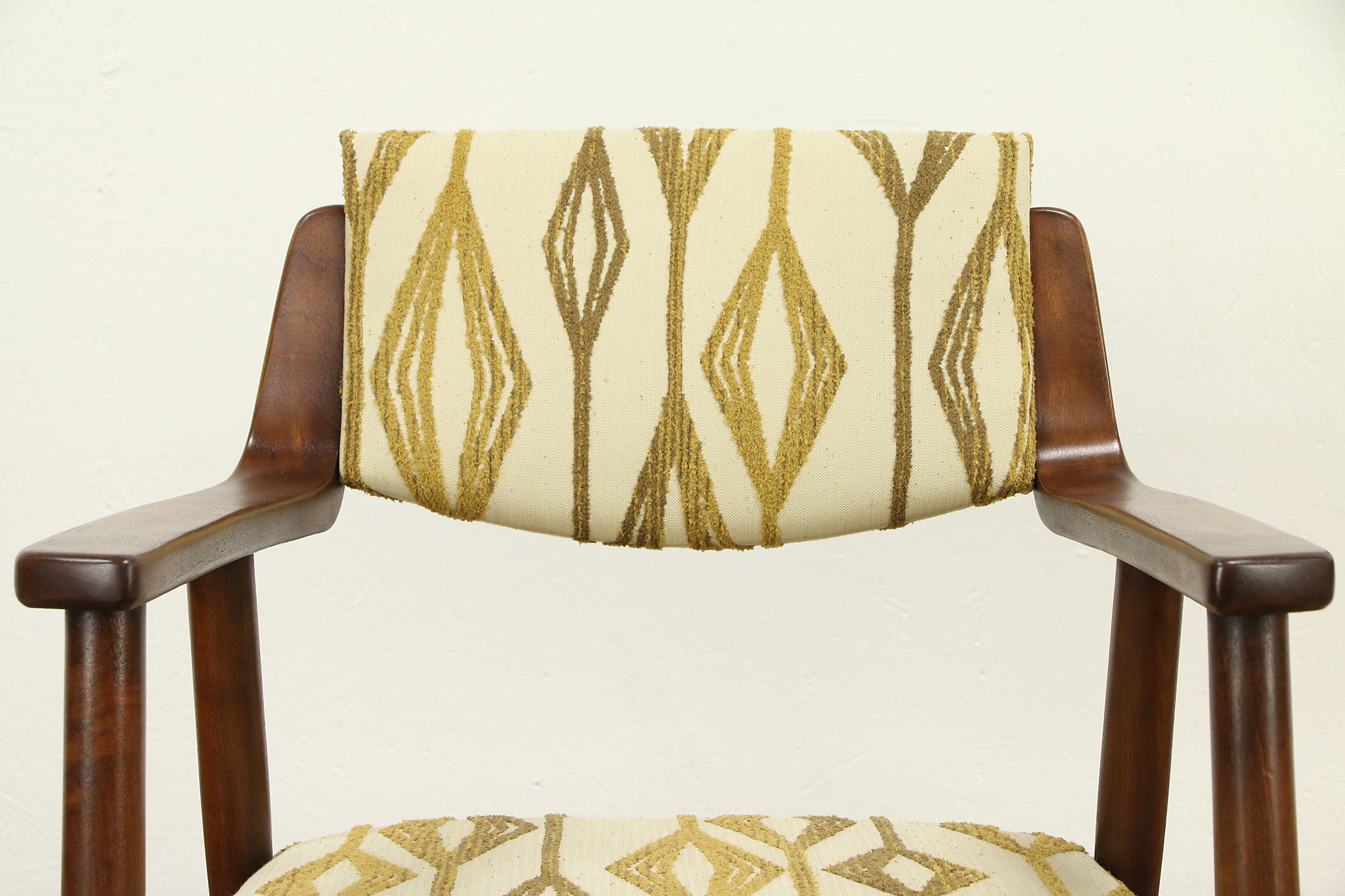 A pair of Midcentury Modern armchairs from about 1960 are solid walnut, signed "Johnson." New upholstery is in a pattern of the era.